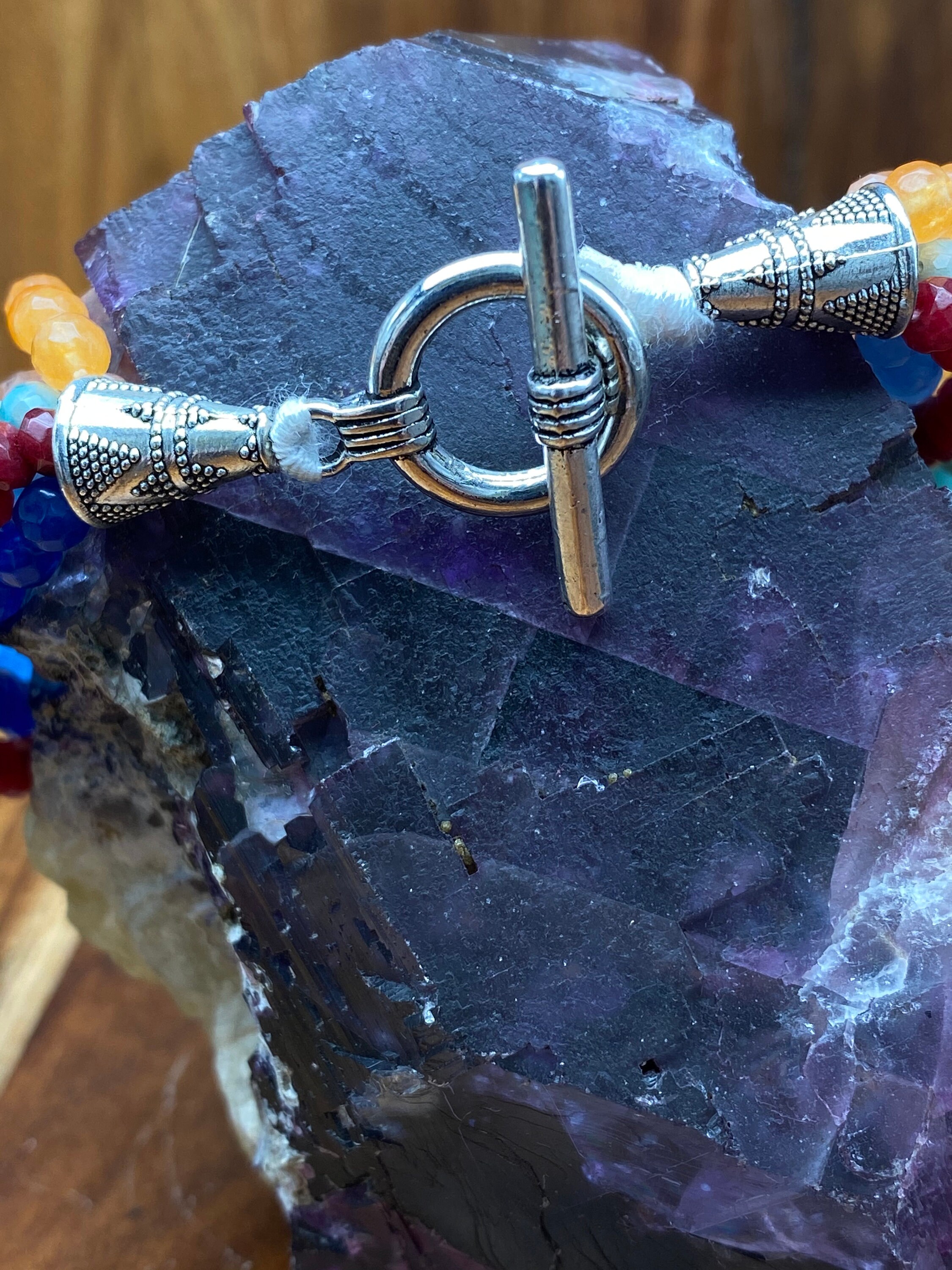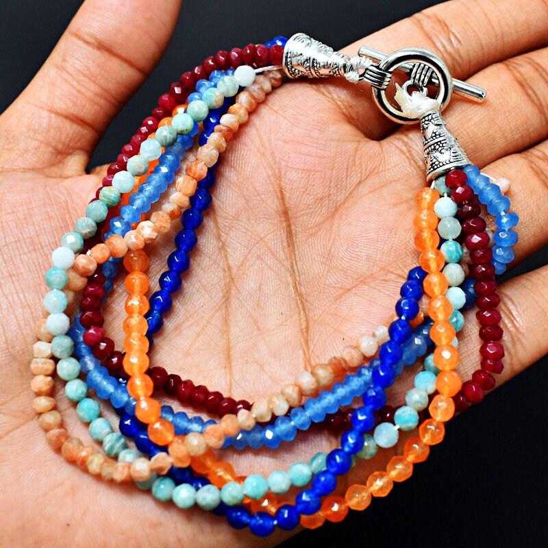 This bracelet is made of high-quality materials. The multicolored Chalcedony is natural and untreated and the accents and closure are made of solid 925 sterling silver.