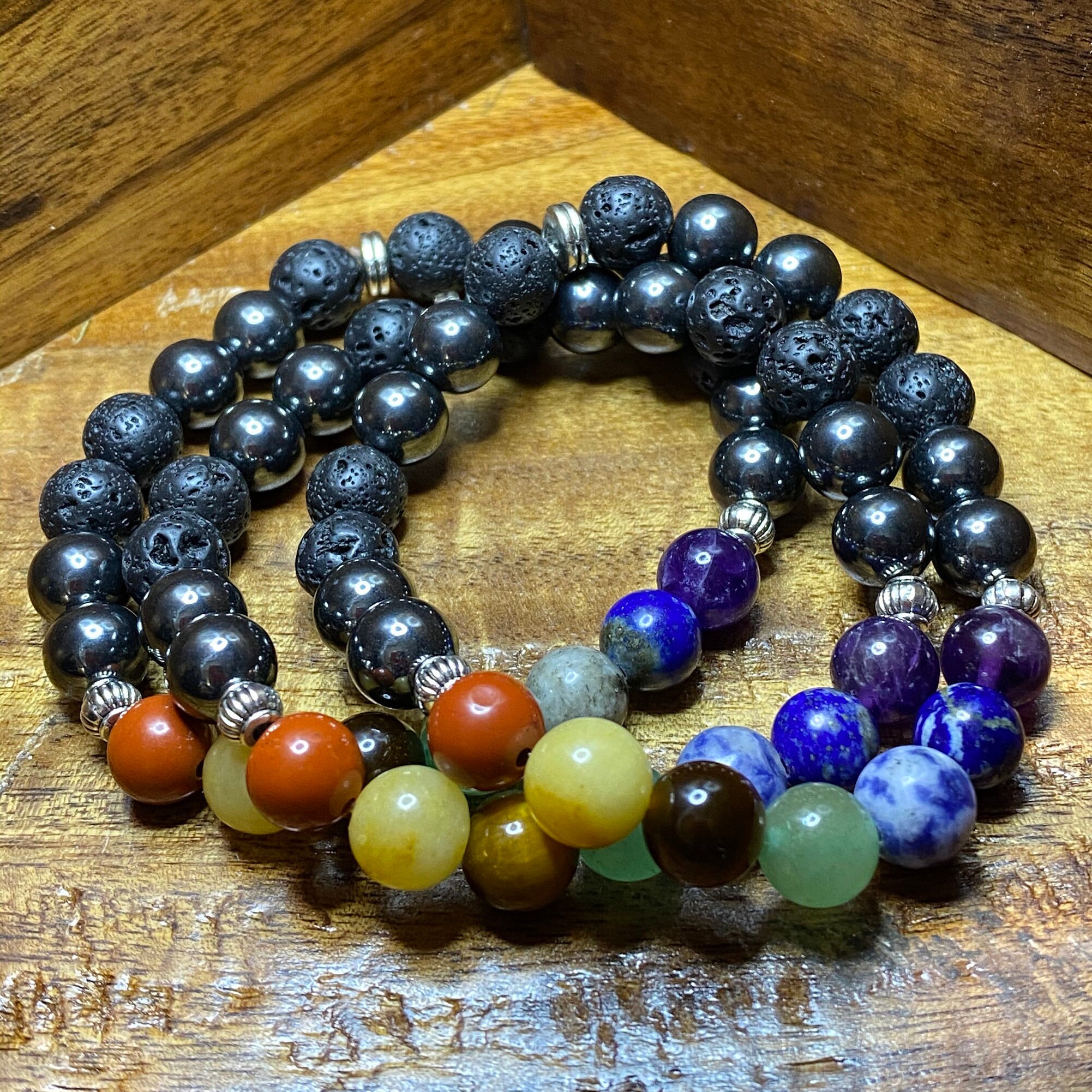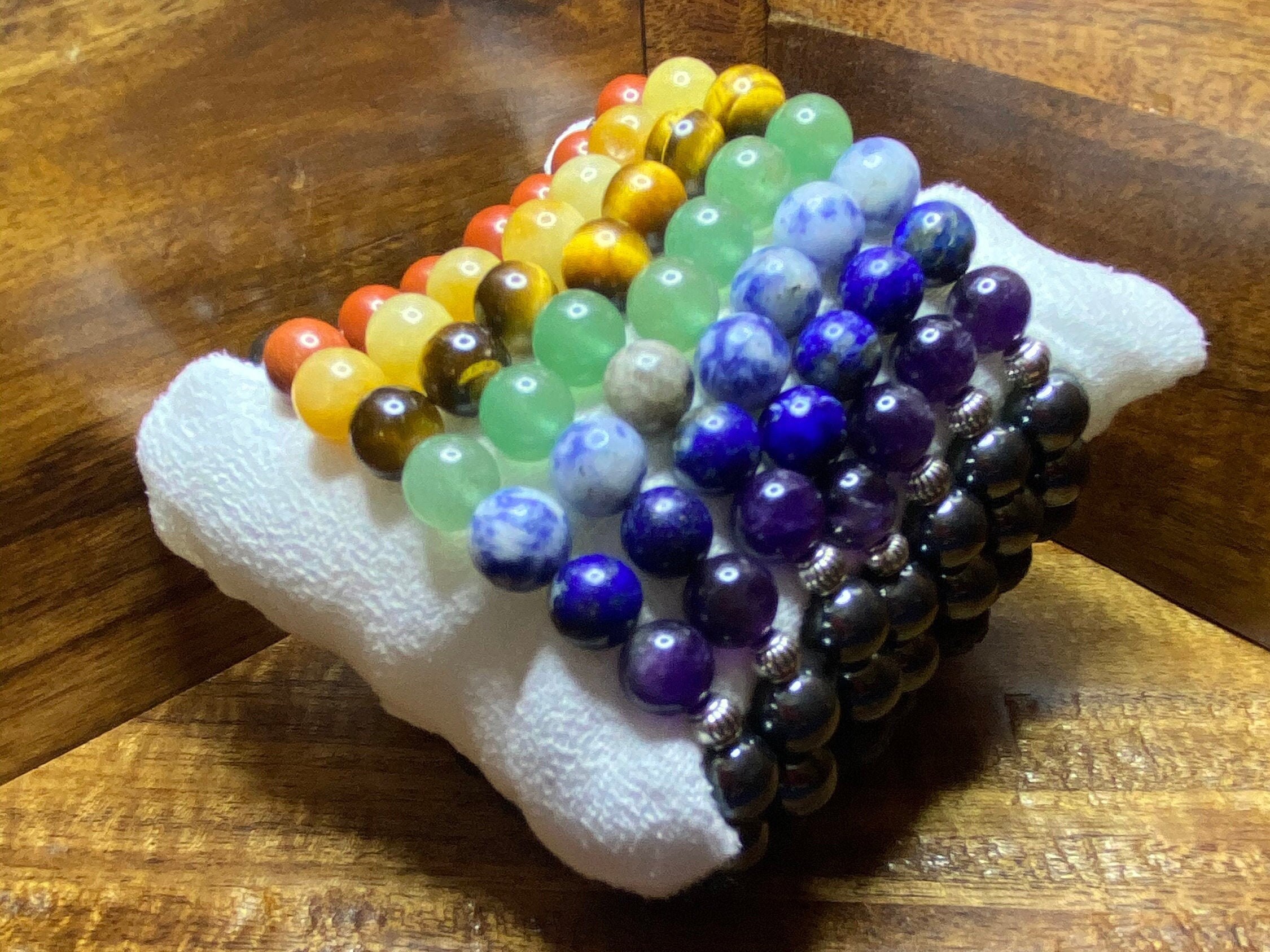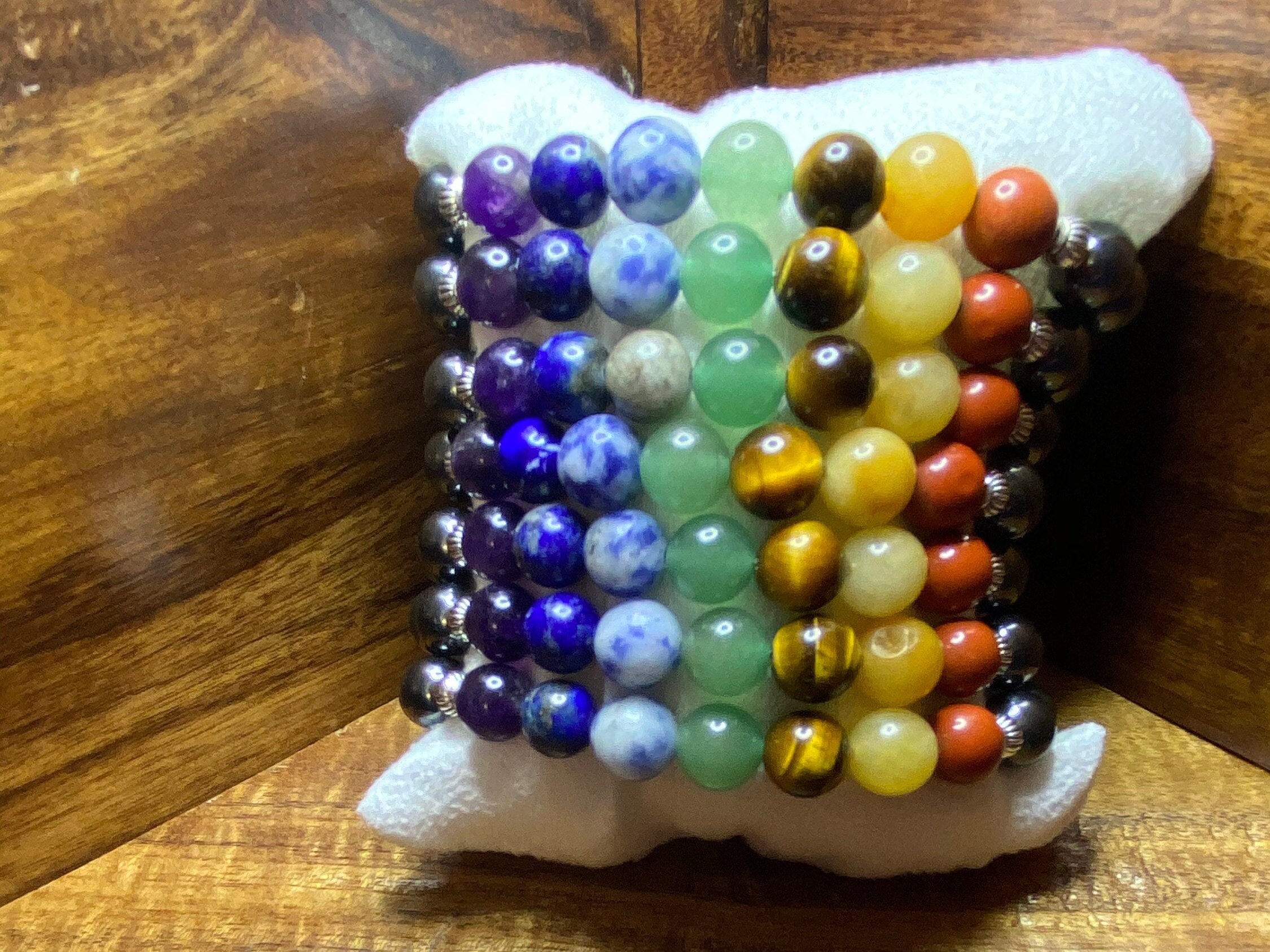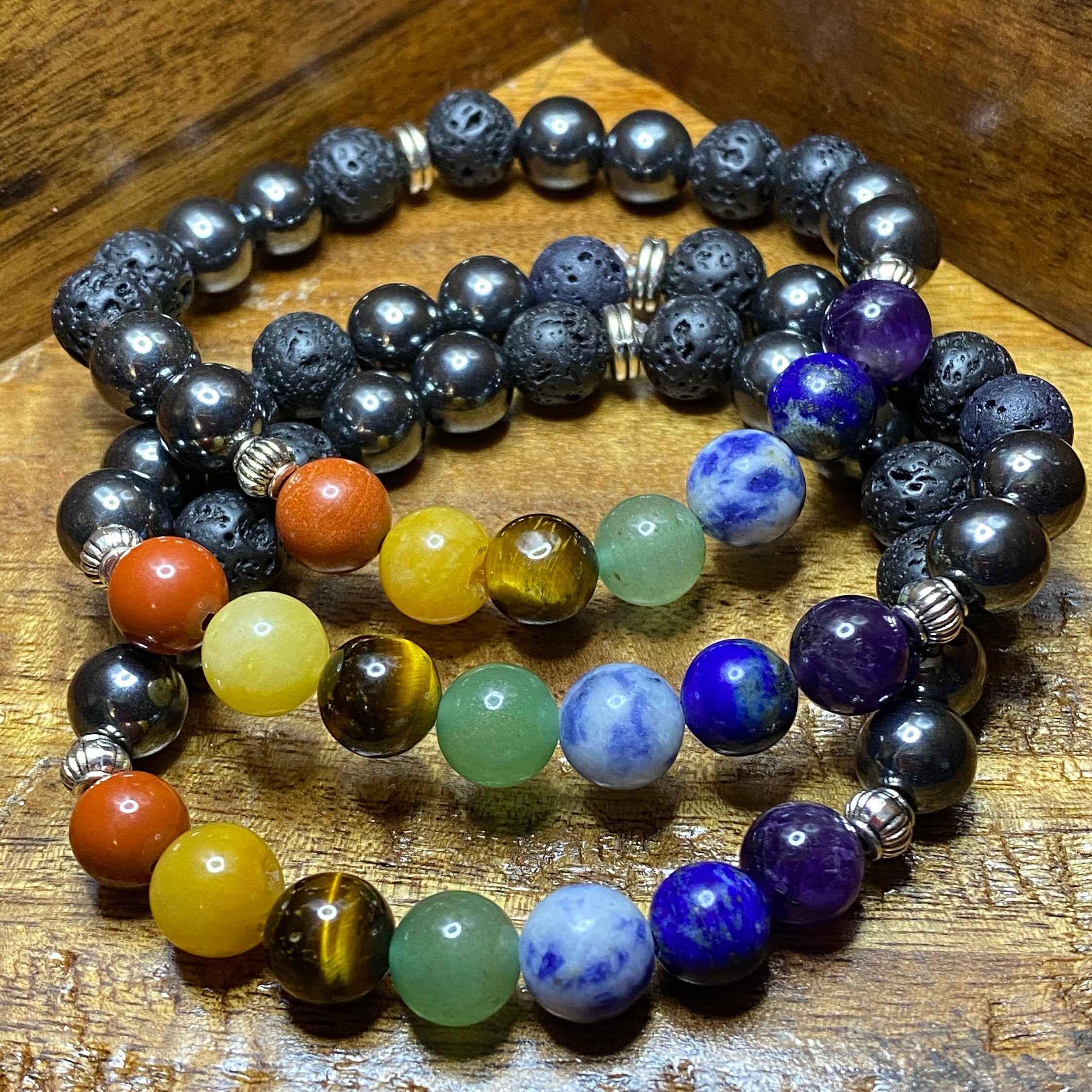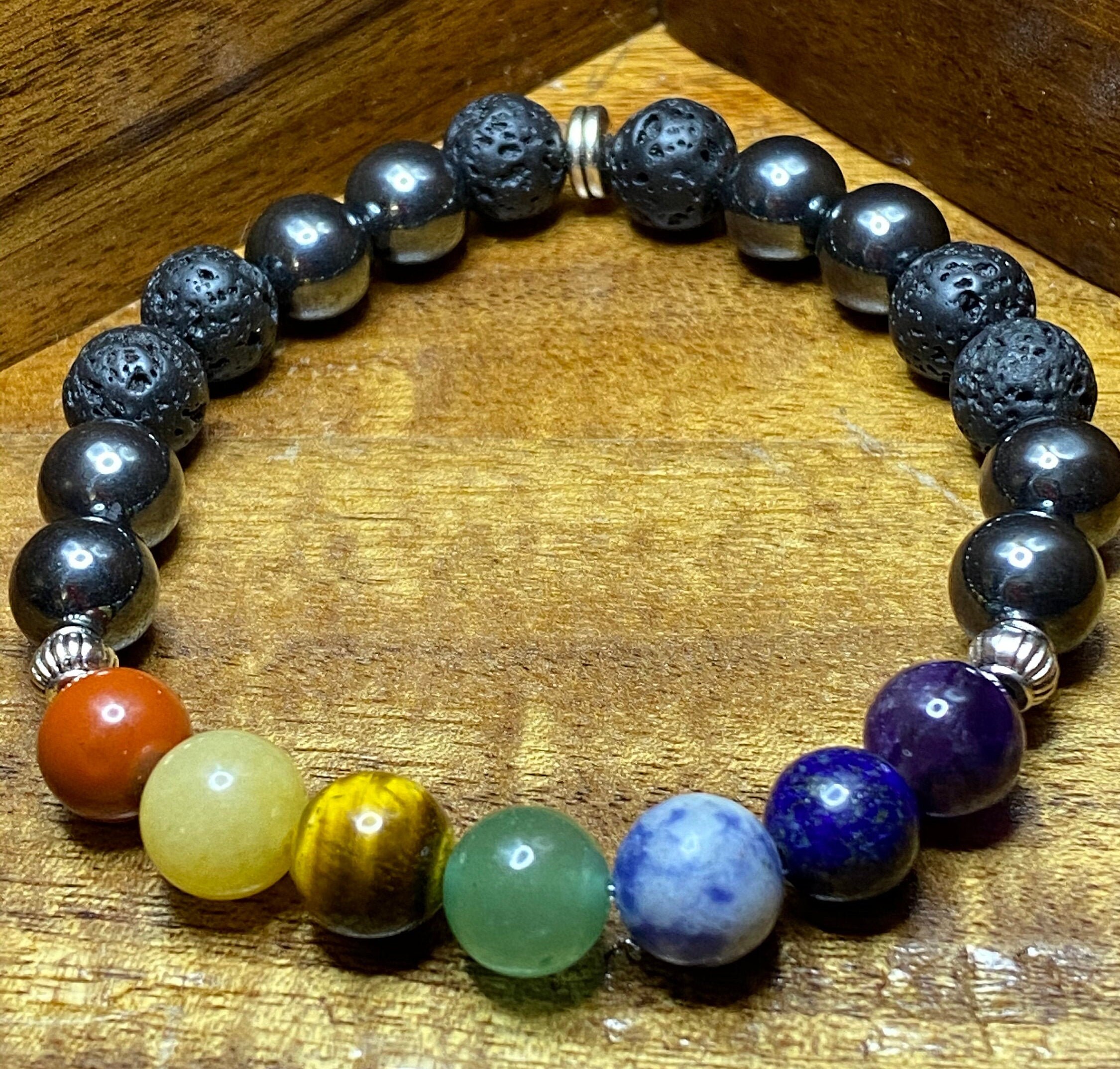 This Chakra bracelet will bring health, healing, strength and power to all those looking for it. The bright colored Chakra stones are offset by Lava stone and Hematite. I choose to use 8mm size beads for the perfect fit and the natural stone are accentuated the most beautiful silver spacers.