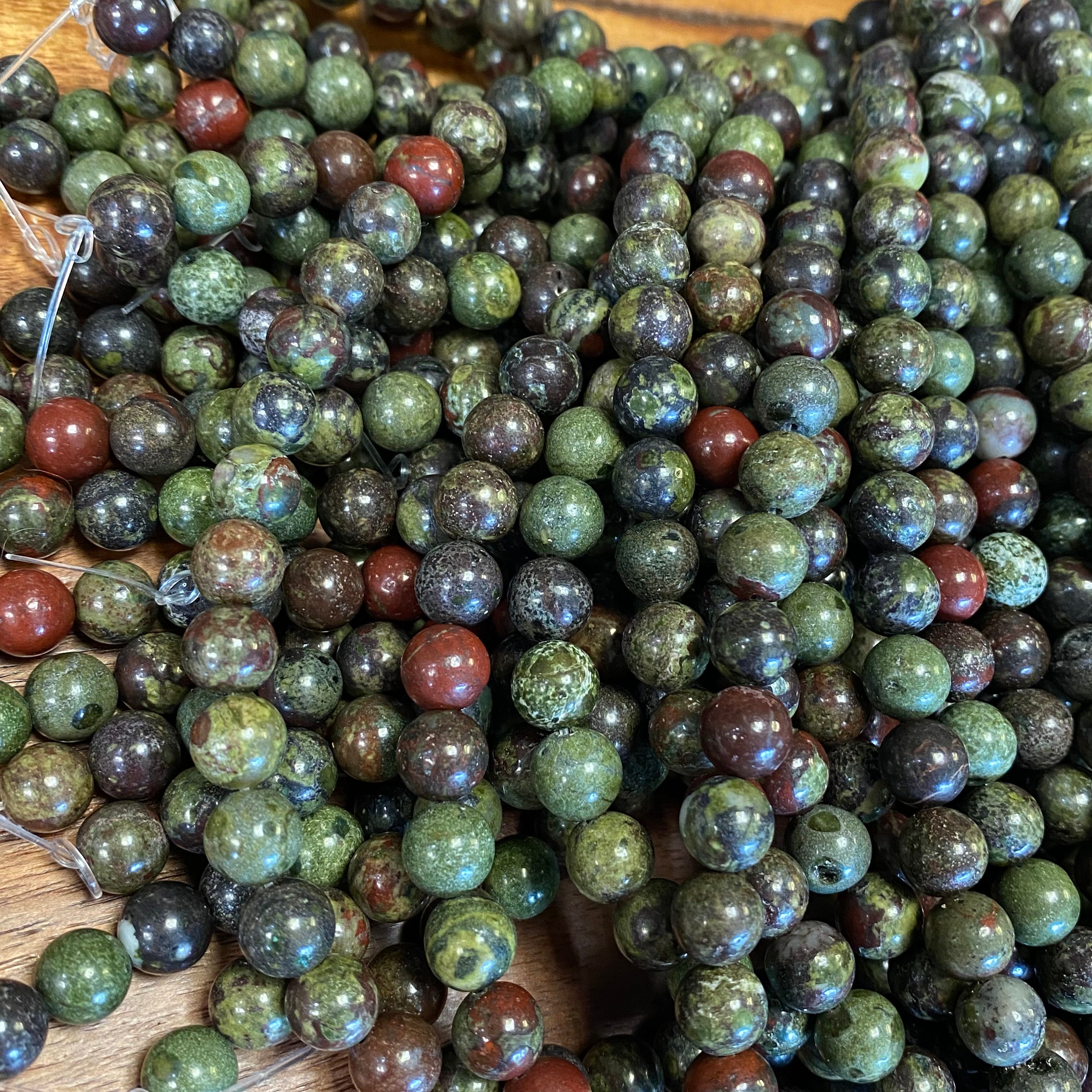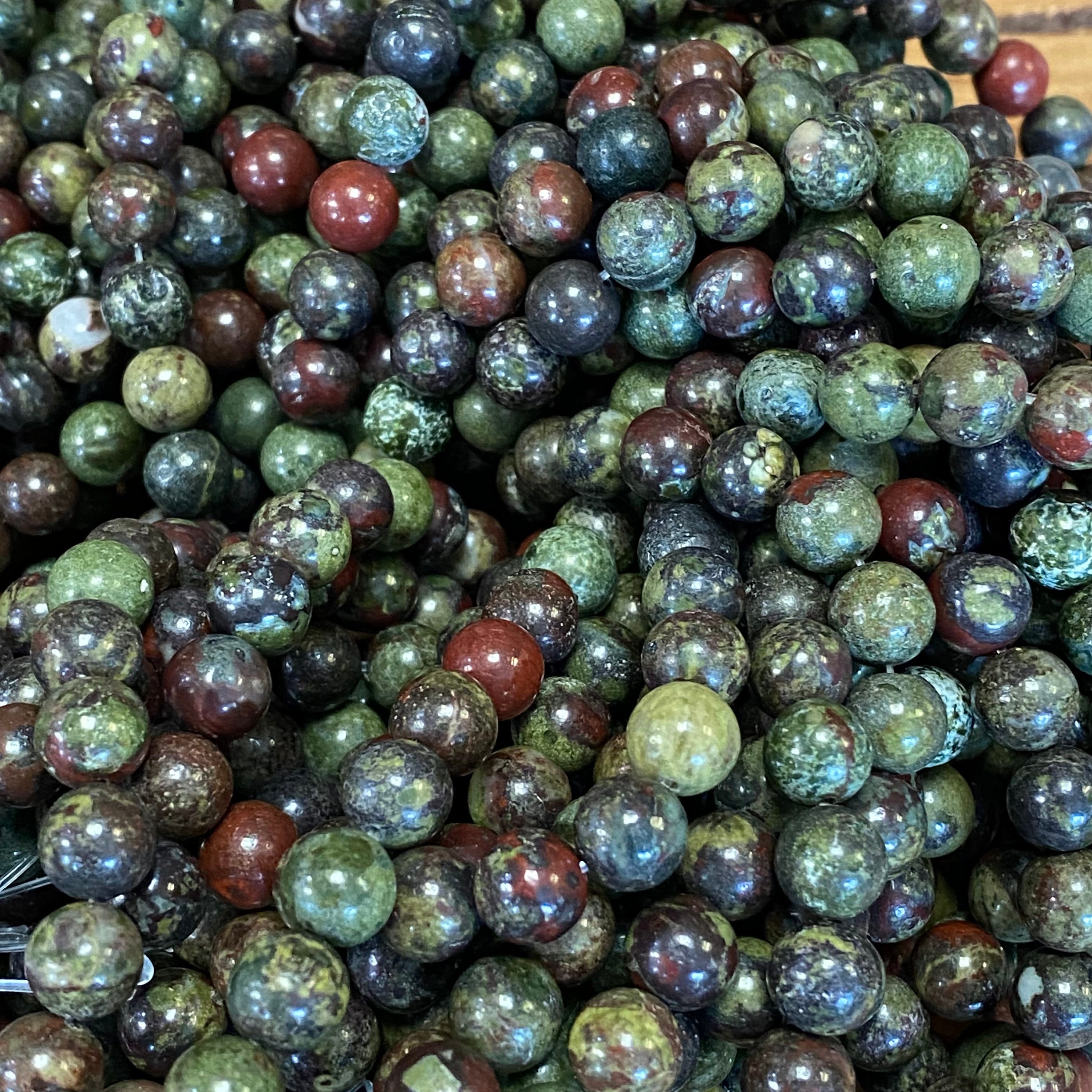 Dragon Blood Jasper, also known as Dragon Stone, encourages creativity, draws money and love, and helps you to achieve your goals. With its green and red coloring, it connects directly to the Heart Chakra, helping you to hear your heart, and promising love, compassion, and forgiveness.
