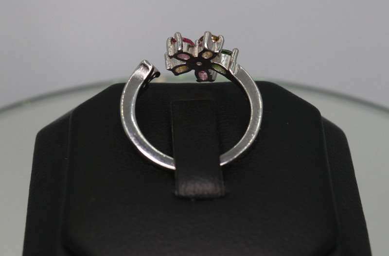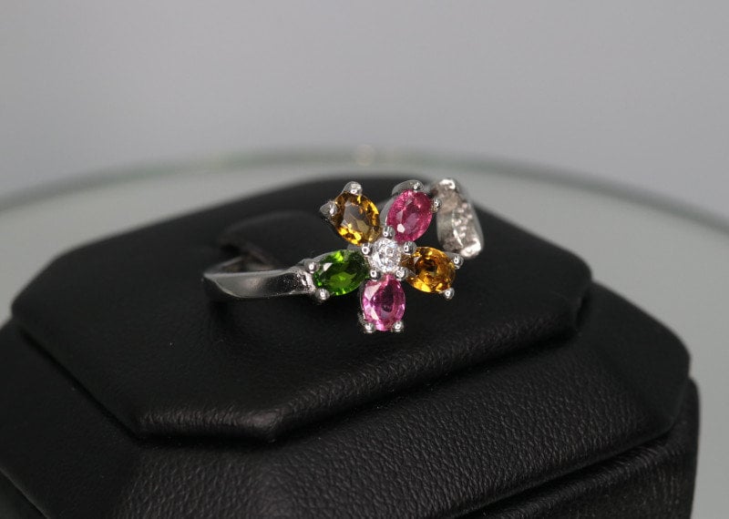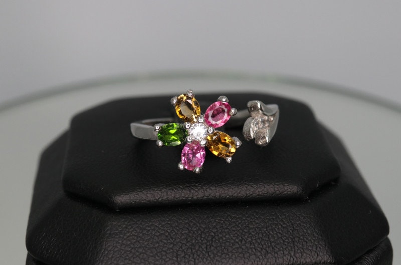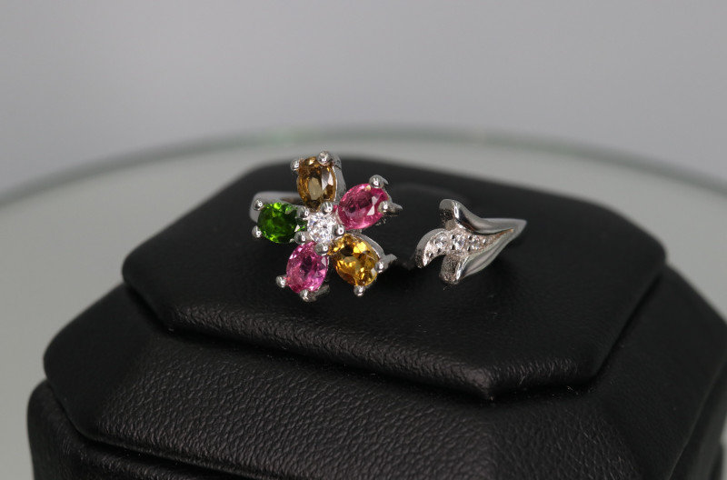 This ring is made of high-quality materials. The Multicolored Tourmaline are natural and untreated while the setting is made of solid 925 sterling silver. The small stones around the main stone are high quality cubic zirconia.