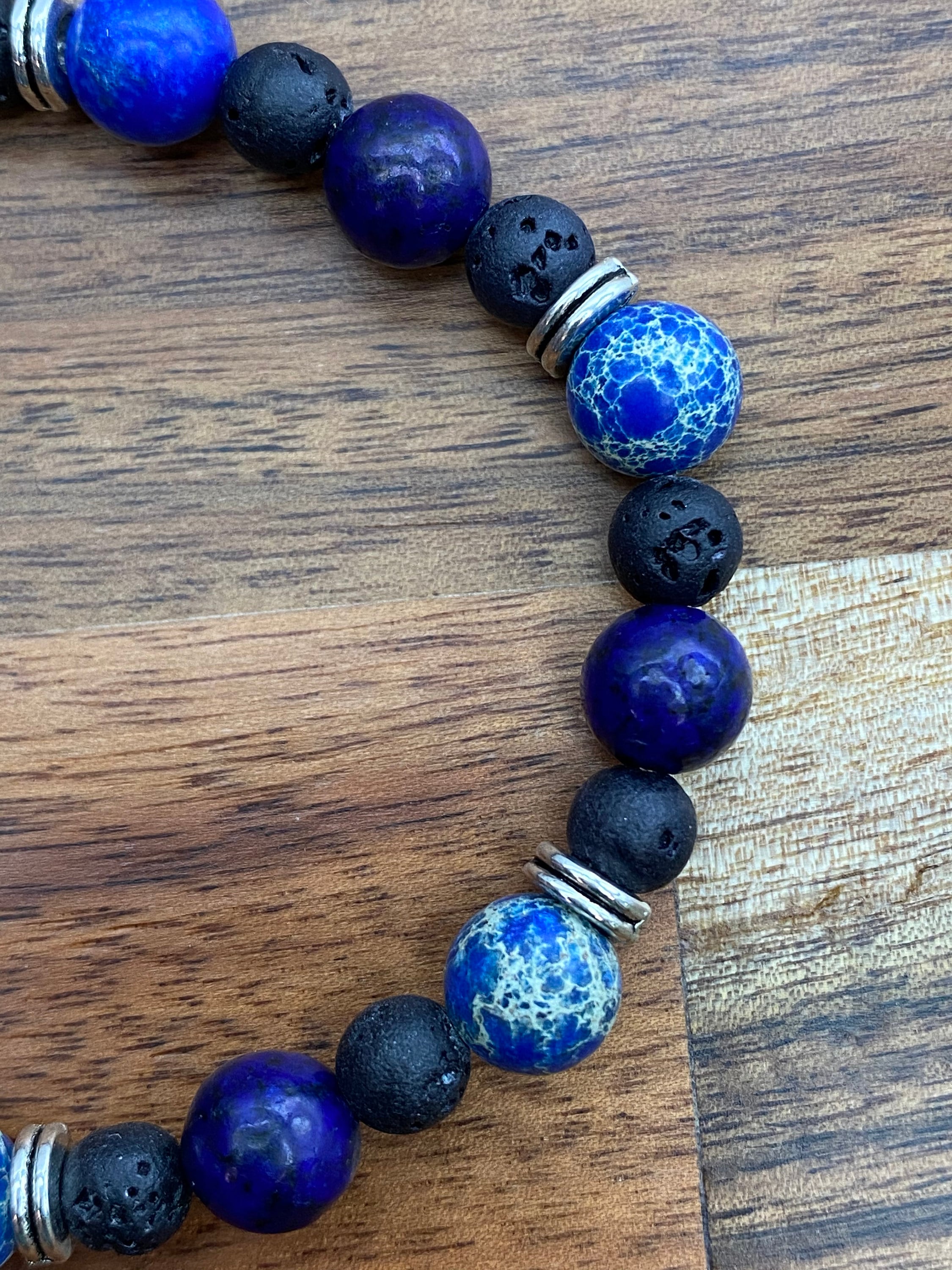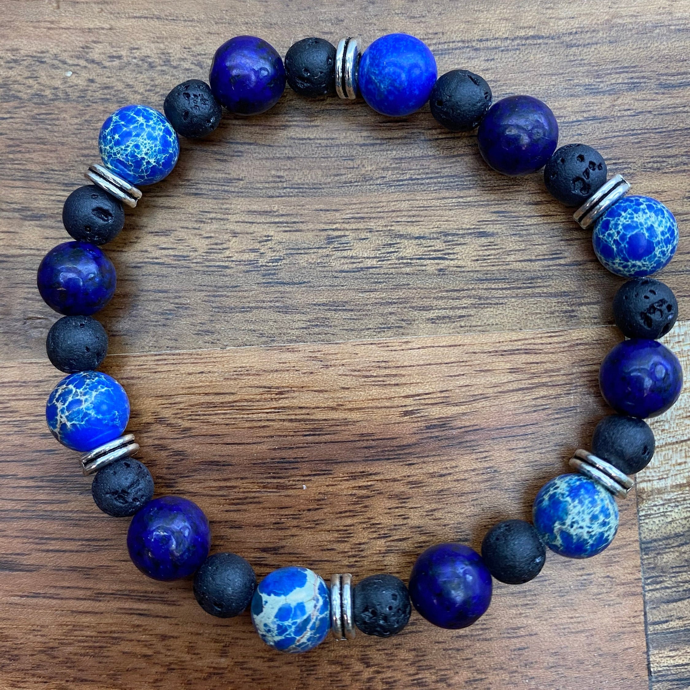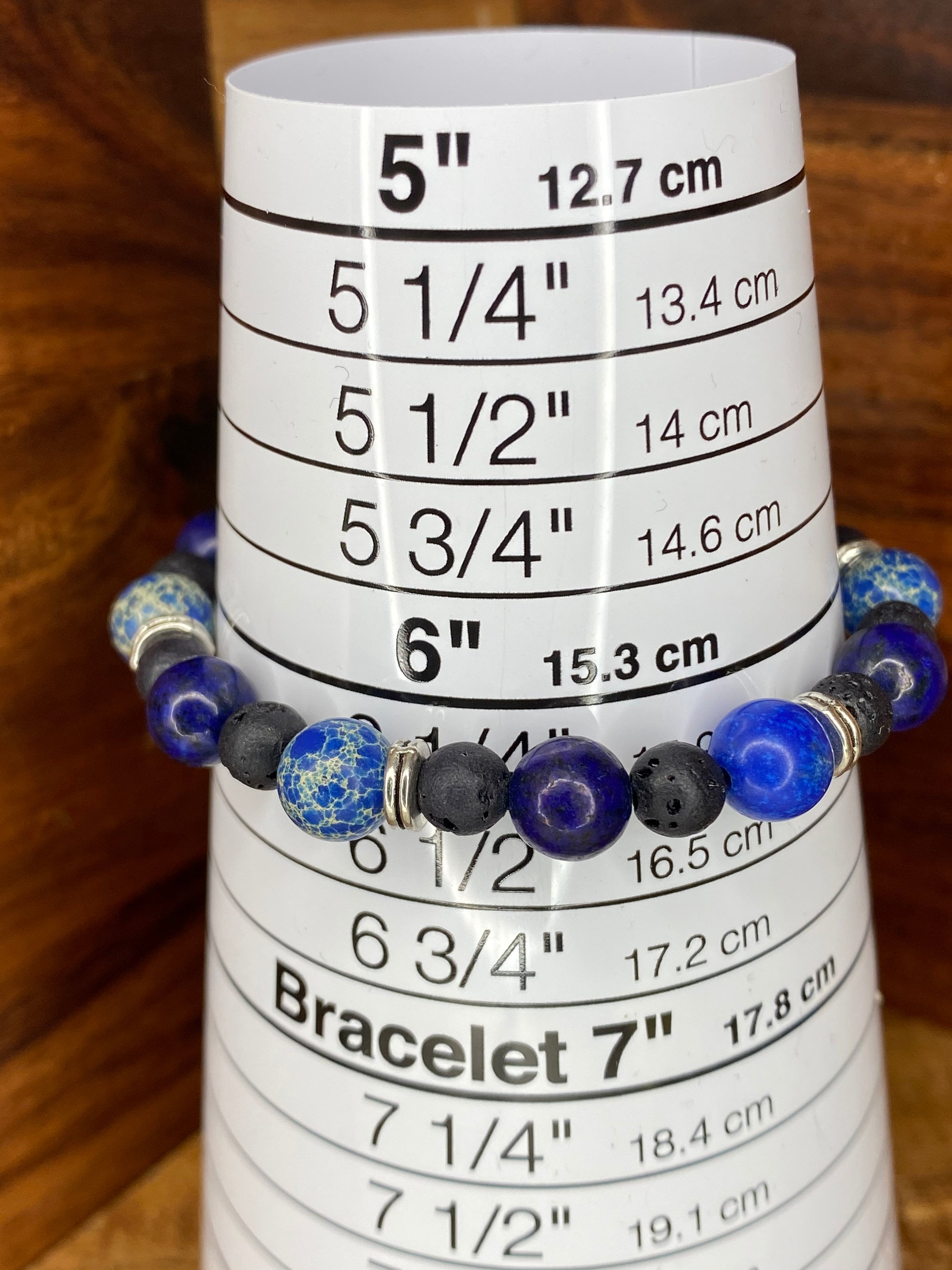 This lapis lazuli, and blue ocean sediment bracelet will delight all that value the calming effect of blue and the power of the ocean. I chose 6mm lava beads to further accent the larger gemstone beads. Used since ancient times as everything from a colorant for paints to a gemstone, lapis lazuli has been cherished as a beautiful and powerful stone. The clarity and calmness that comes with the ocean sediment stones surely will bless that special someone in your life, or even help center yourself.