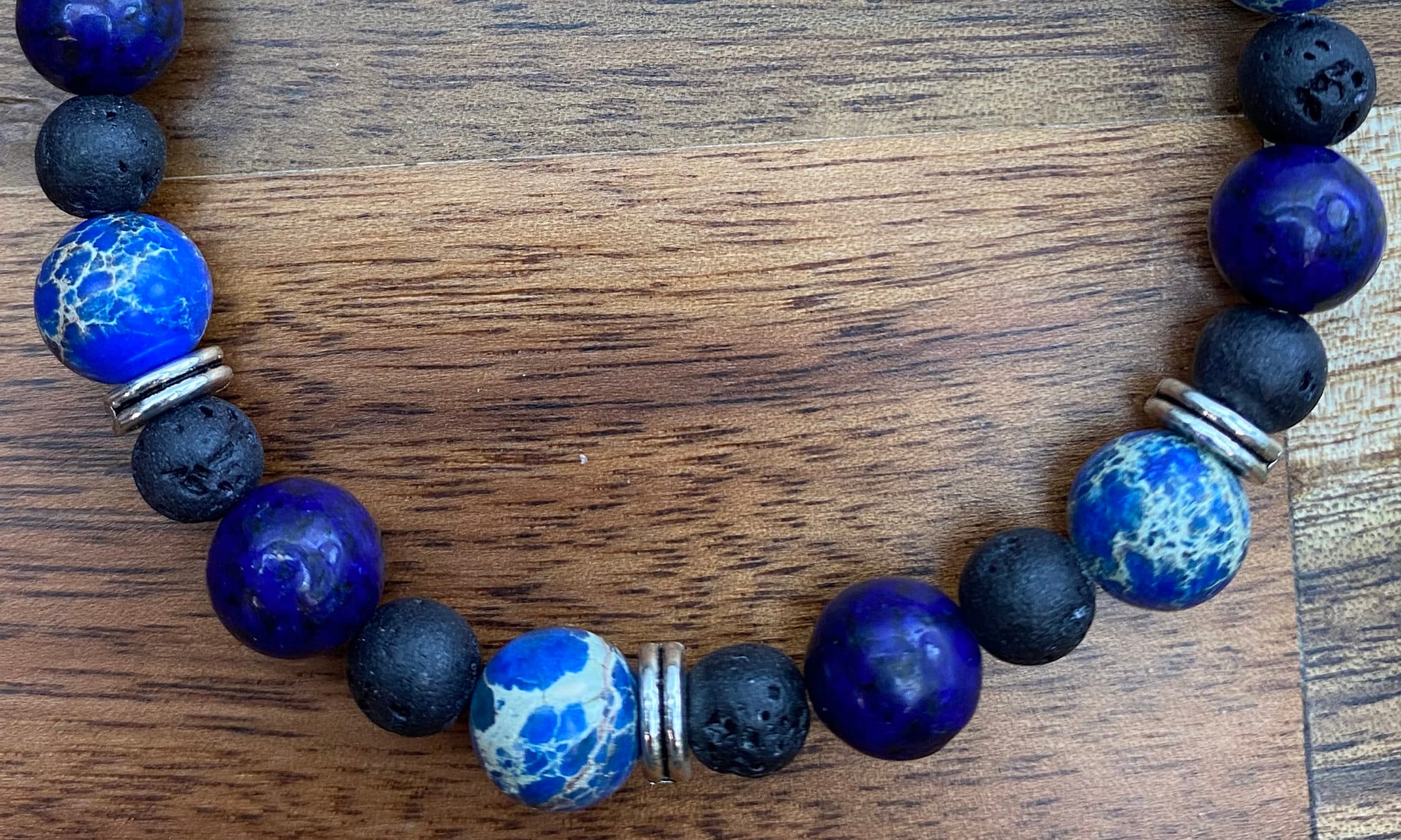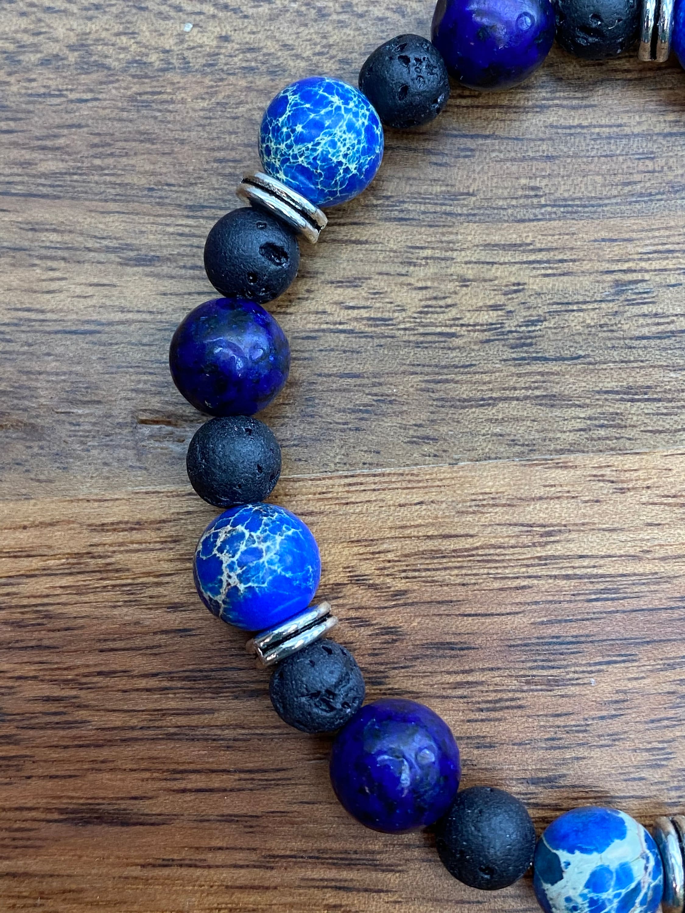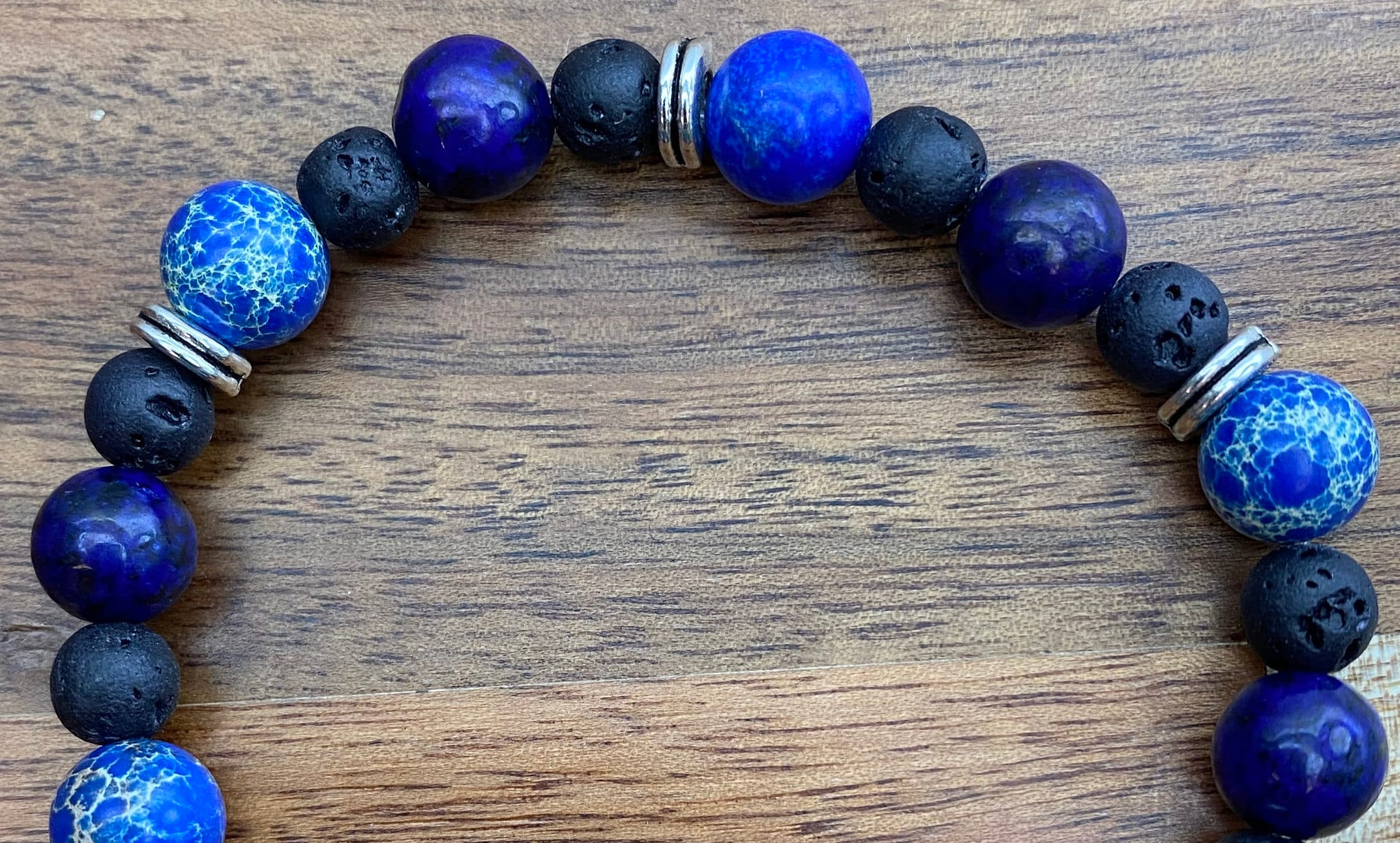 This lapis lazuli, and blue ocean sediment bracelet will delight all that value the calming effect of blue and the power of the ocean. I chose 6mm lava beads to further accent the larger gemstone beads. Used since ancient times as everything from a colorant for paints to a gemstone, lapis lazuli has been cherished as a beautiful and powerful stone. The clarity and calmness that comes with the ocean sediment stones surely will bless that special someone in your life, or even help center yourself.