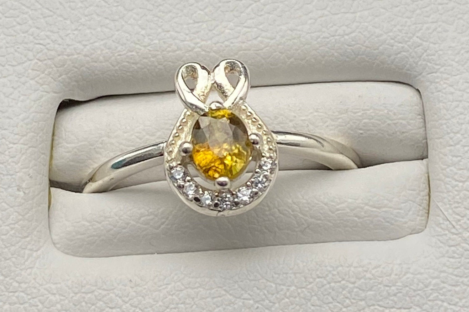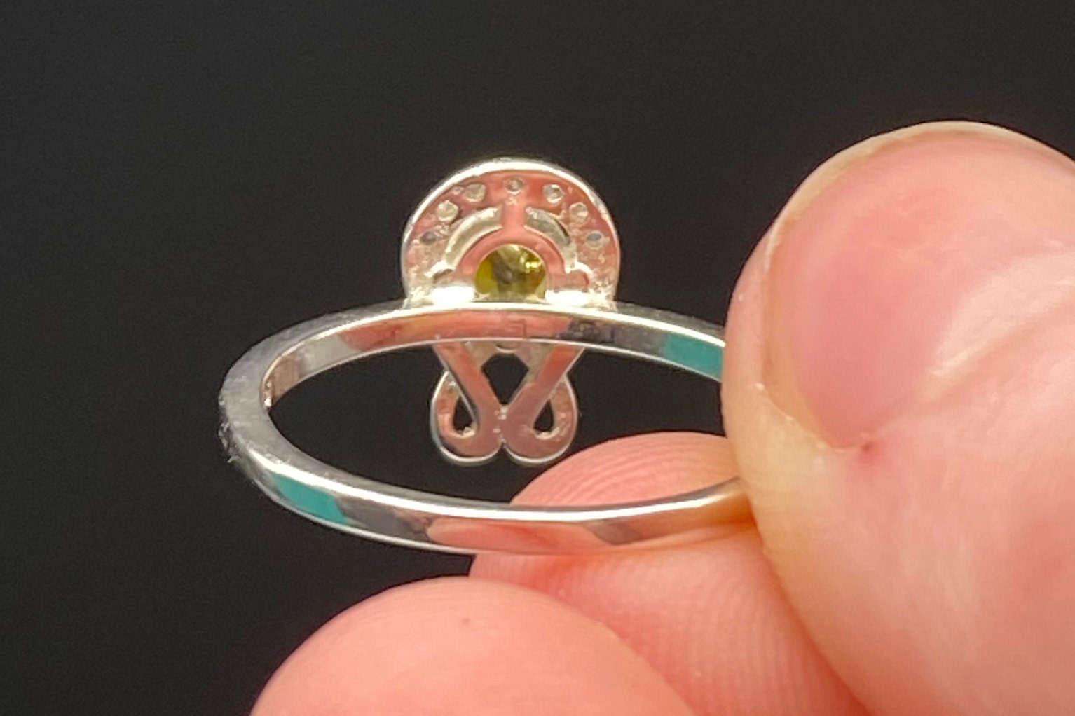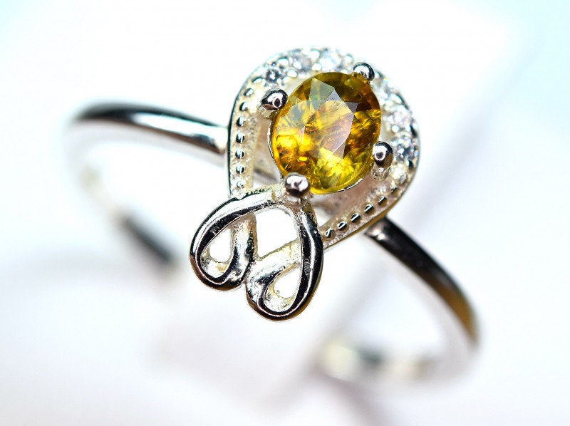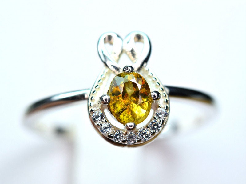 This ring is made of high-quality materials. The Sphene is natural and untreated and the setting is made of solid 925 sterling silver. The small stones around the main stone are high quality cubic zirconia.