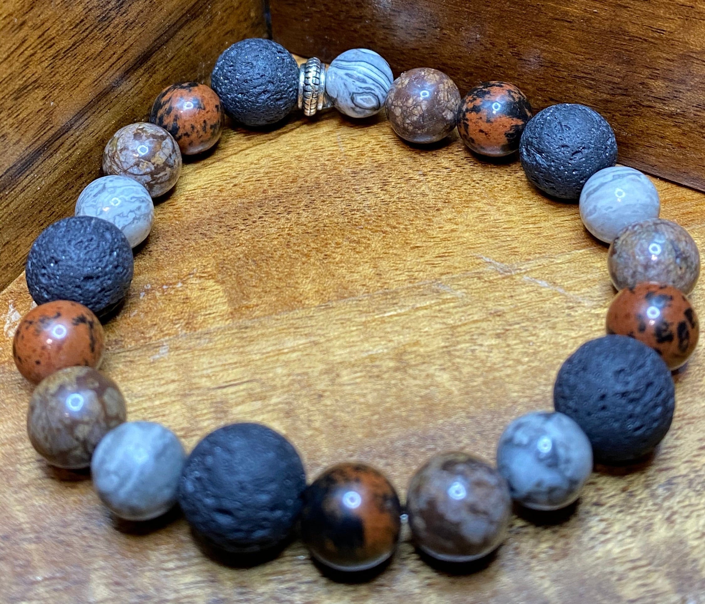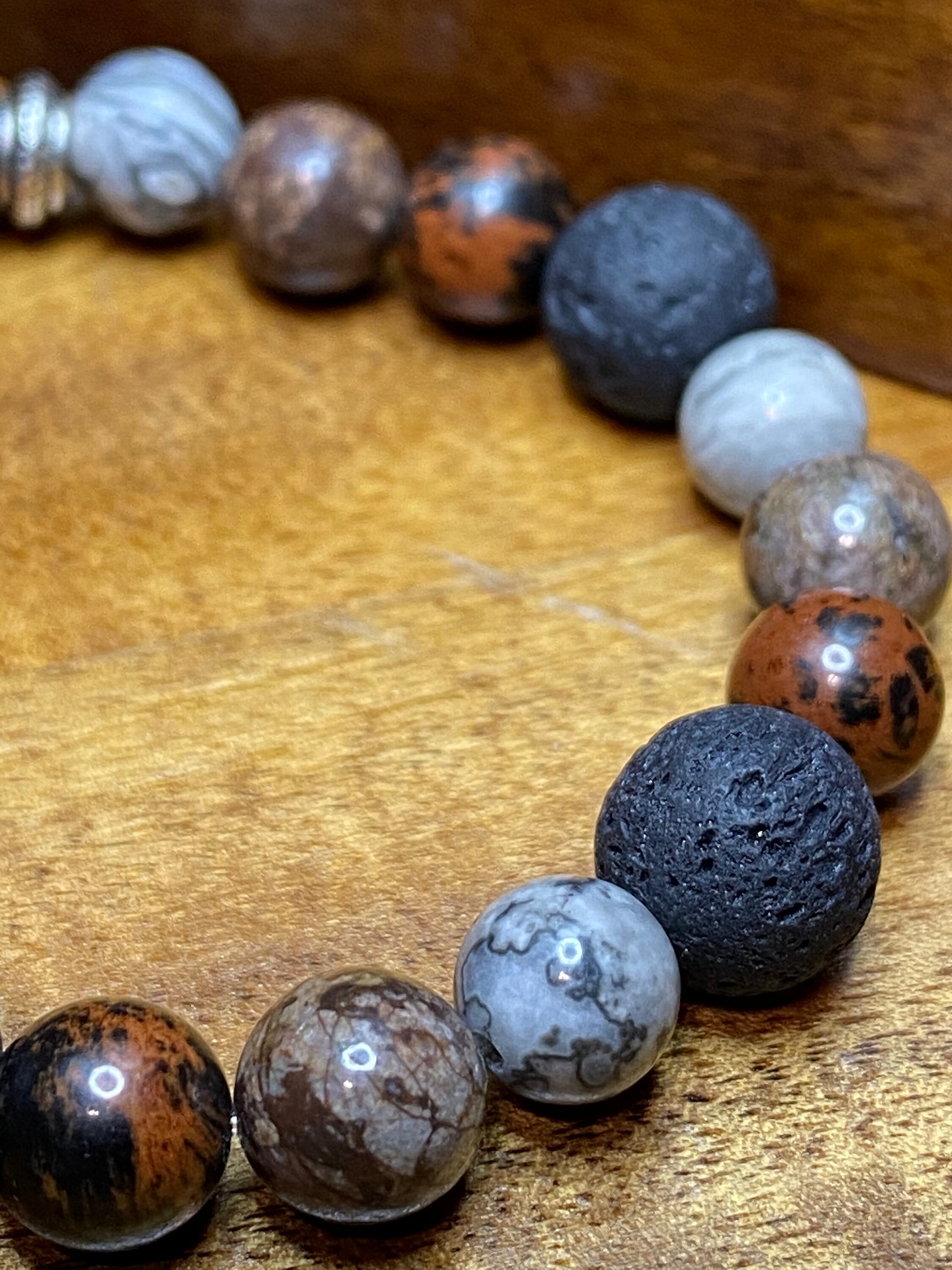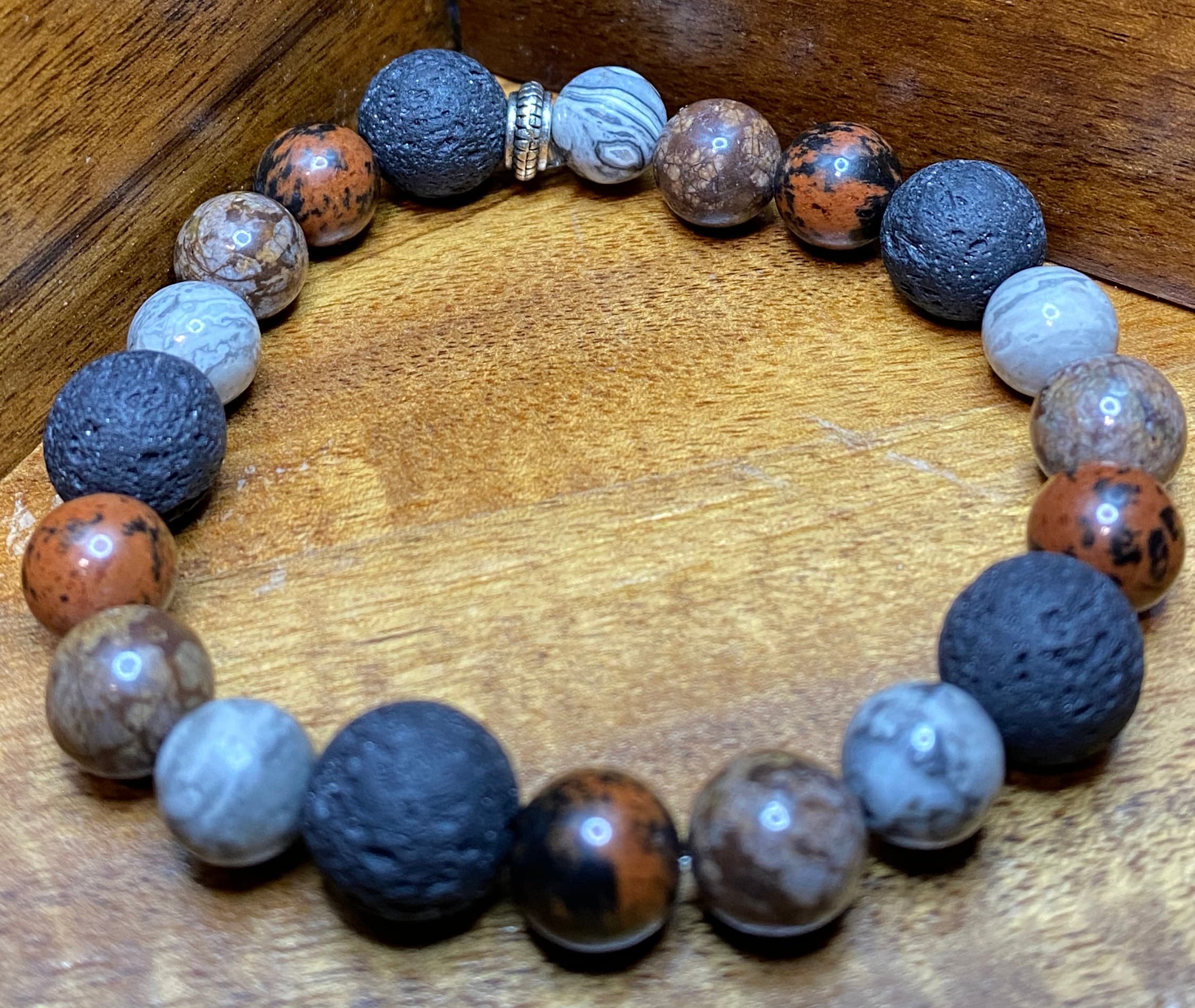 This Map Jasper, Mahogany Obsidian, Brown Snowflake Obsidian and Lava Rock Bracelet was specifically designed to help balance the body both emotionally and physically. I choose to use 8mm size natural stone beads and 10mm Lava Rock accents for the perfect match between comfort and beauty.