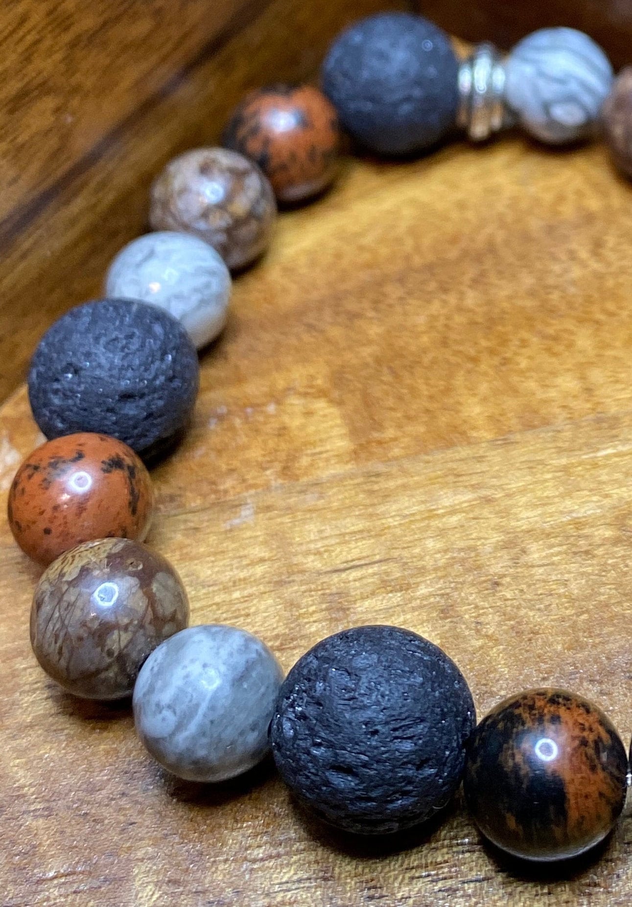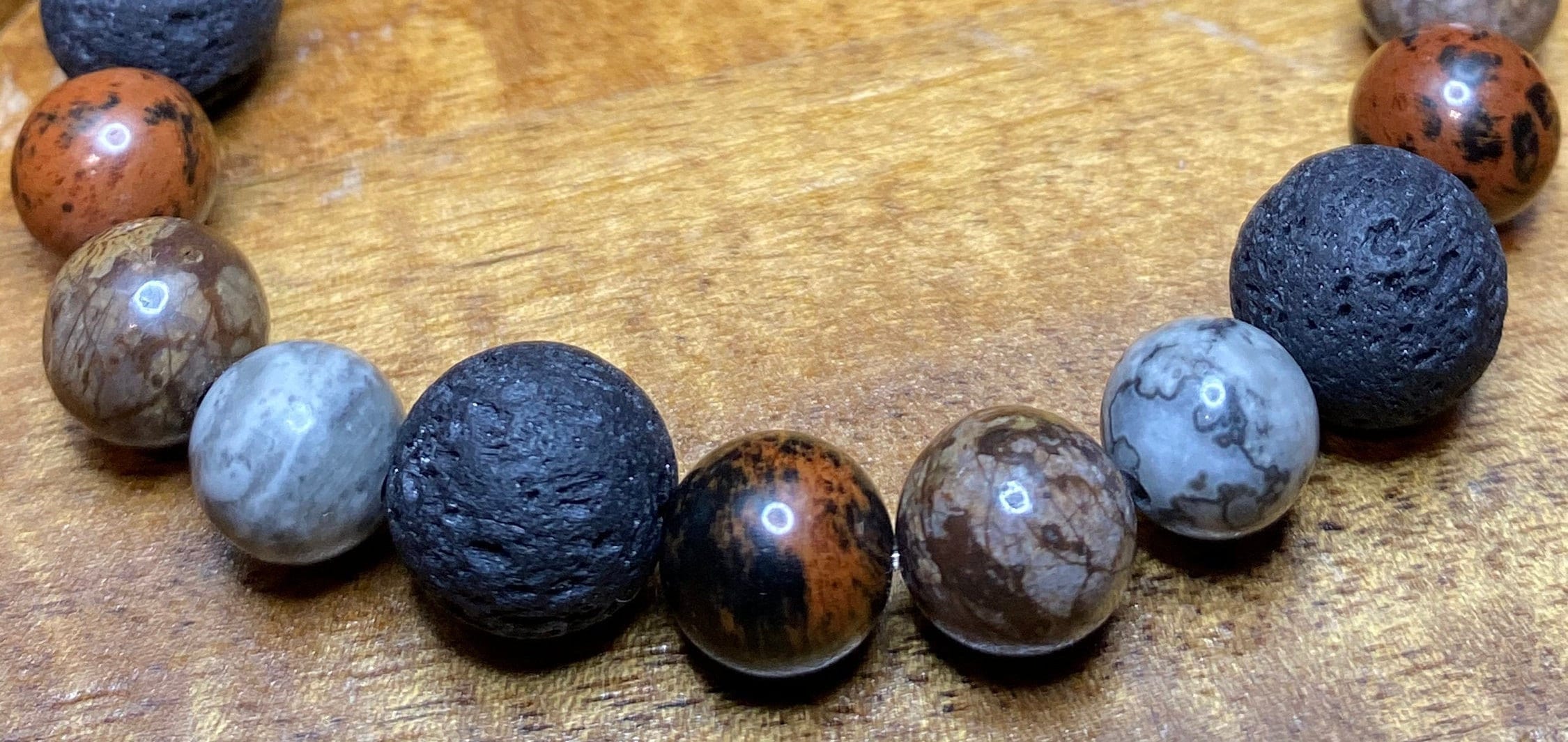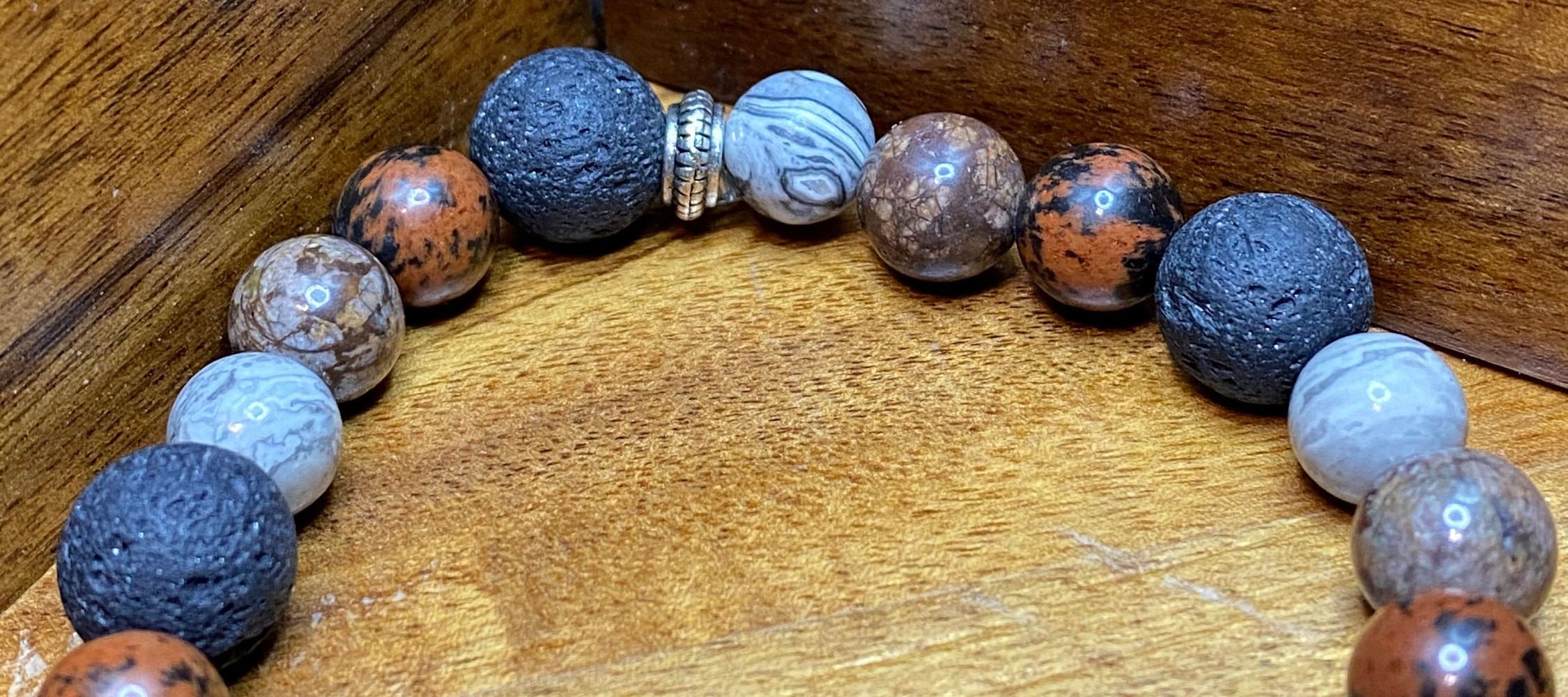 This Map Jasper, Mahogany Obsidian, Brown Snowflake Obsidian and Lava Rock Bracelet was specifically designed to help balance the body both emotionally and physically. I choose to use 8mm size natural stone beads and 10mm Lava Rock accents for the perfect match between comfort and beauty.