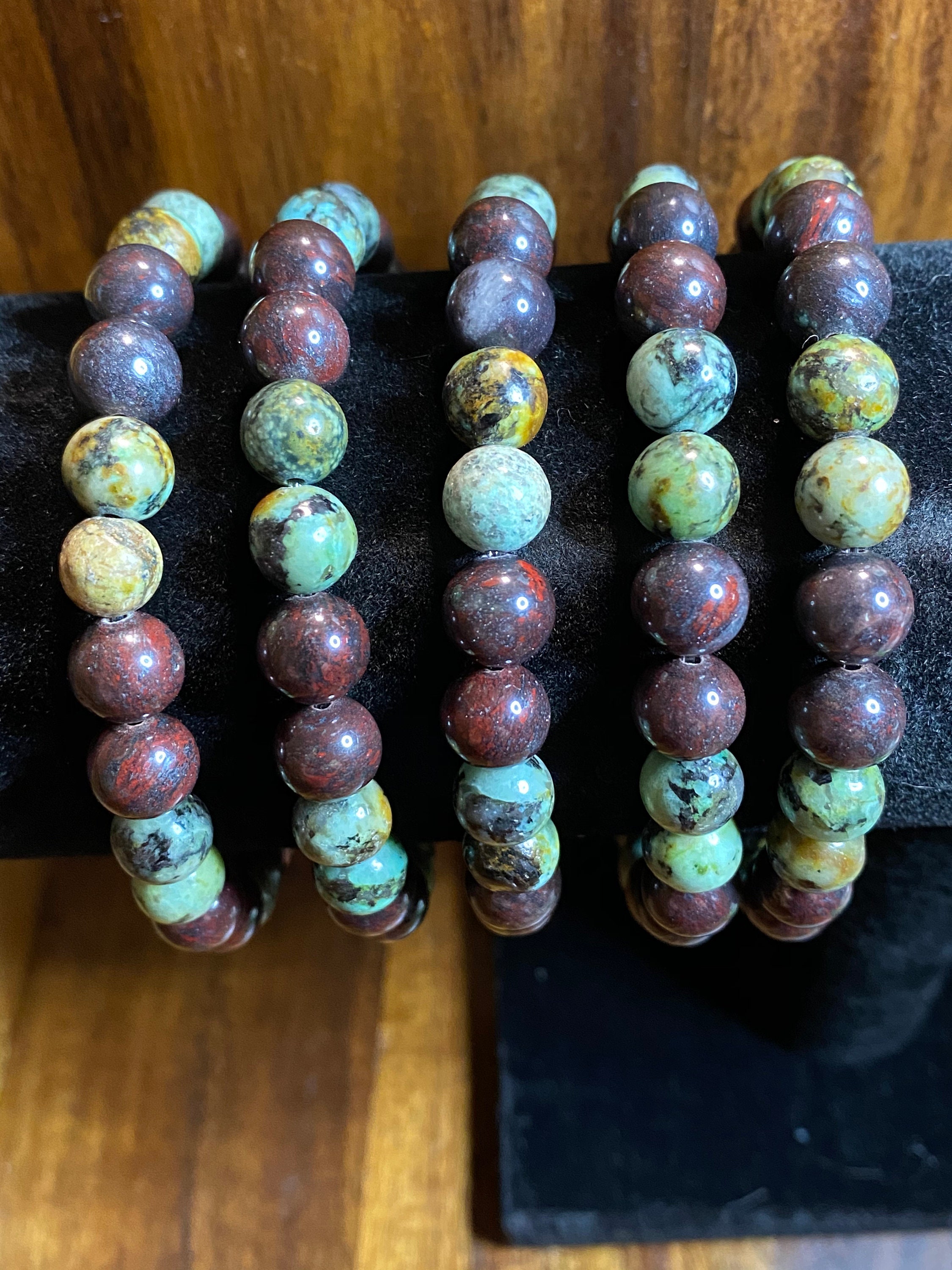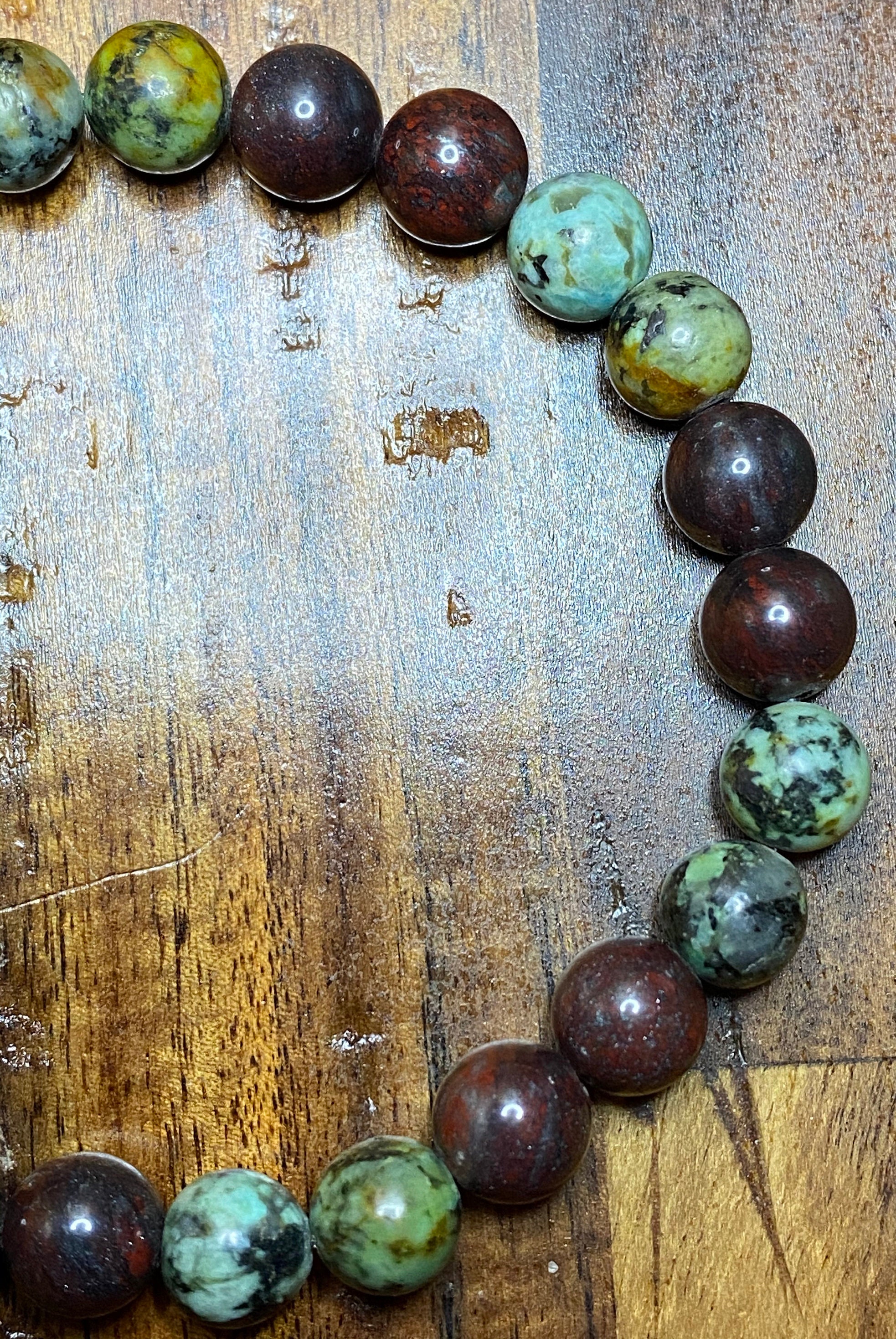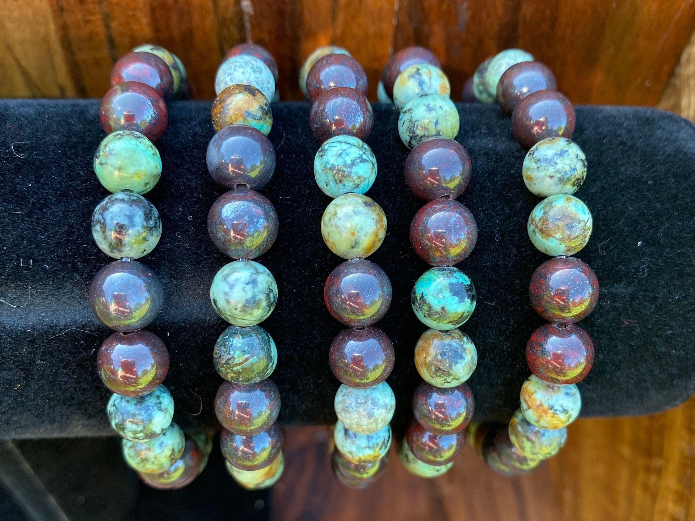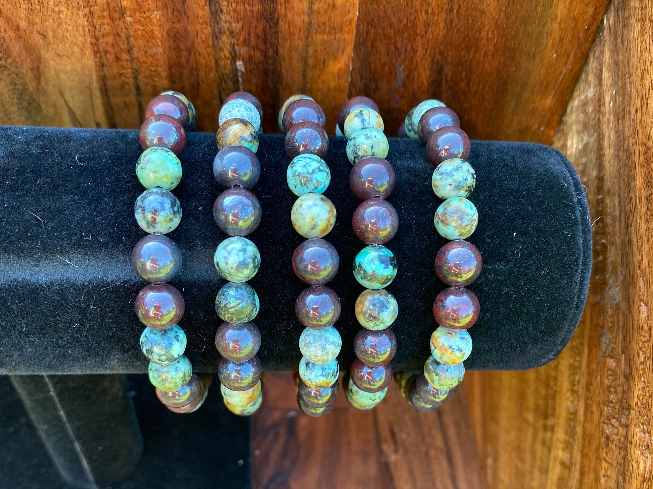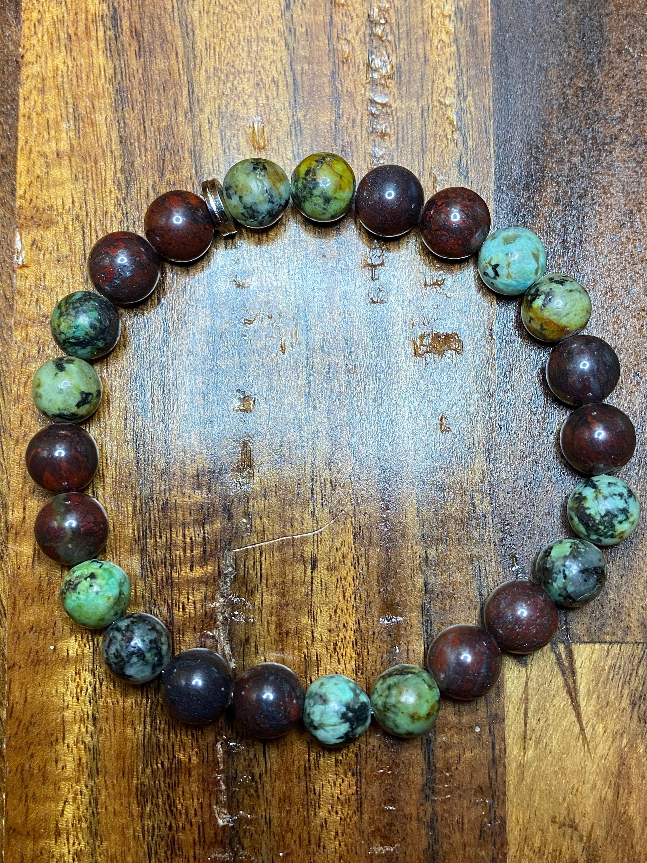 This Men�??s Poppy Jasper and African Turquoise Bracelet was specifically designed to help balance the body both emotionally and physically. I choose to use 8mm size beads for the perfect match between comfort and beauty.