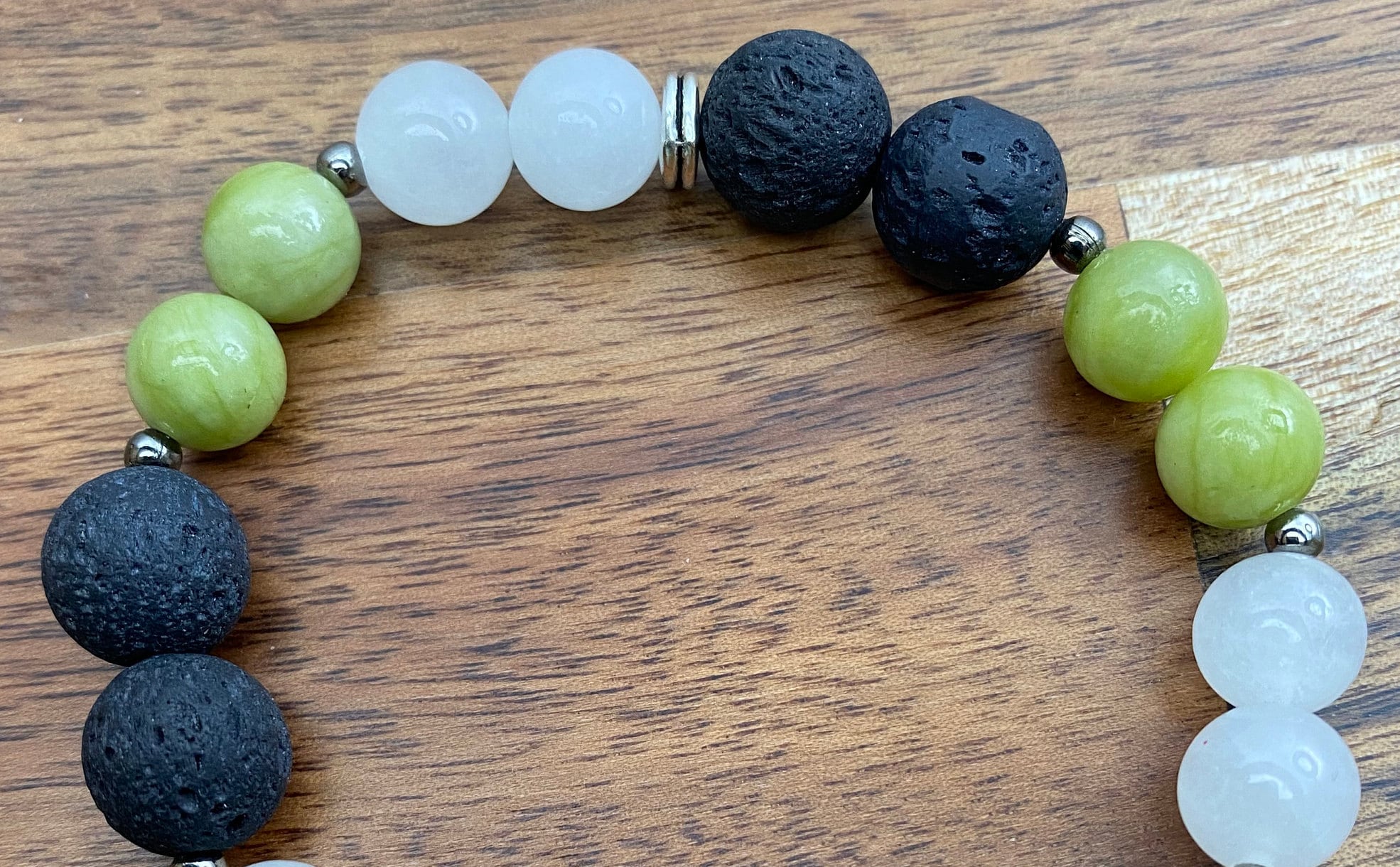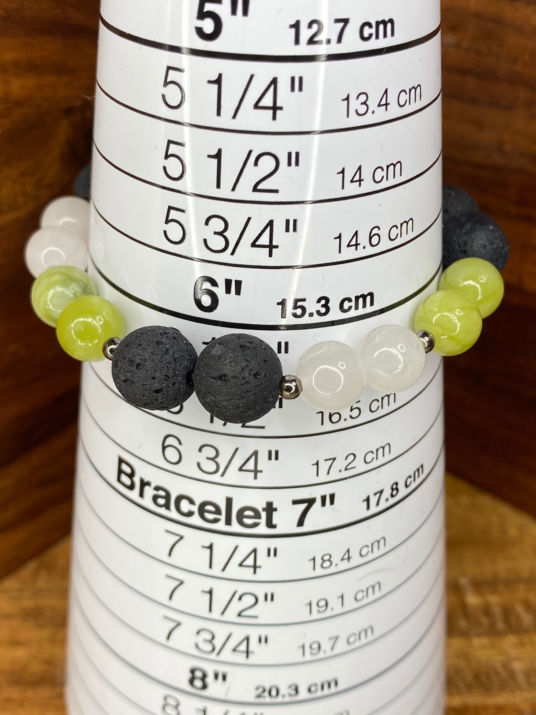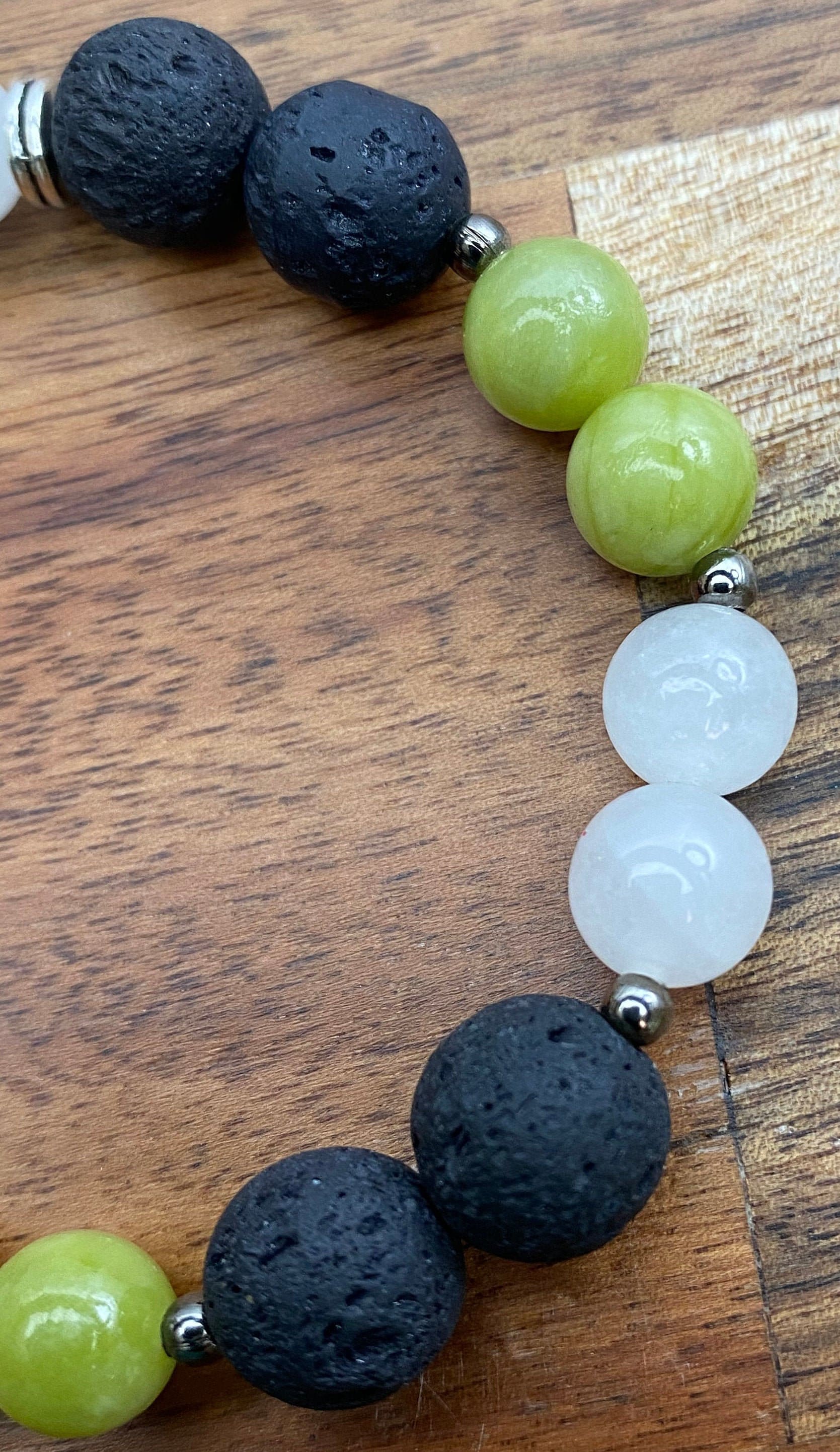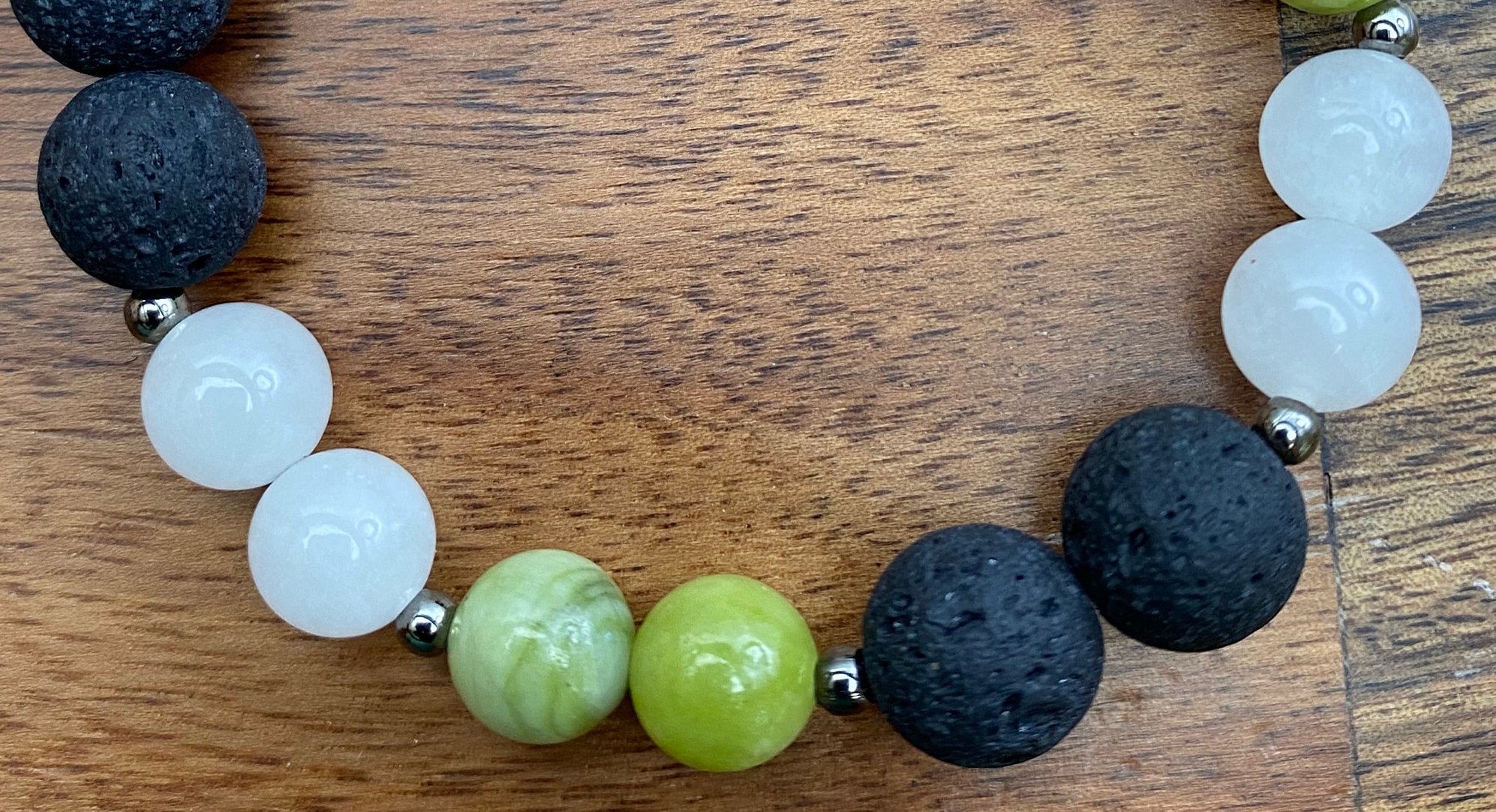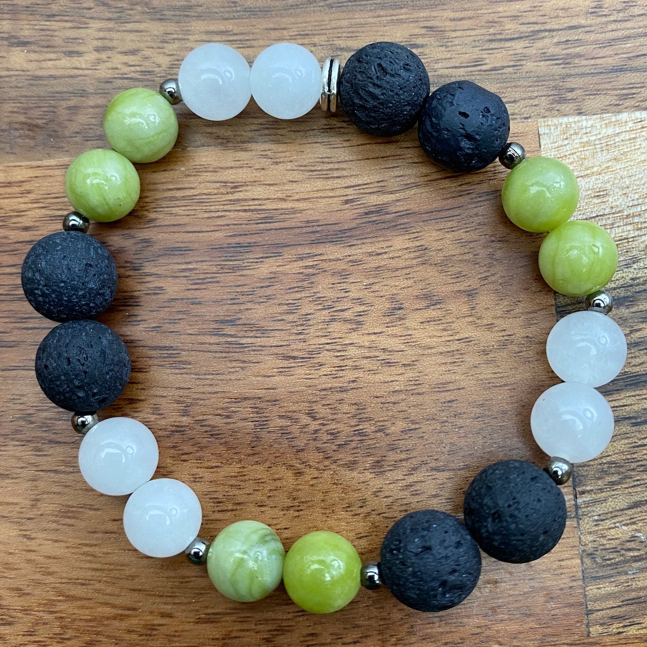This wonderful green jade, quartz crystal, and lava stone bracelet invigorates the wearer with bronze spacer beads. Jade has long been heralded for it's empowering and regal nature. When paired with quartz, this unique bracelet is sure to help fortune and protection to it's blessed wearer.