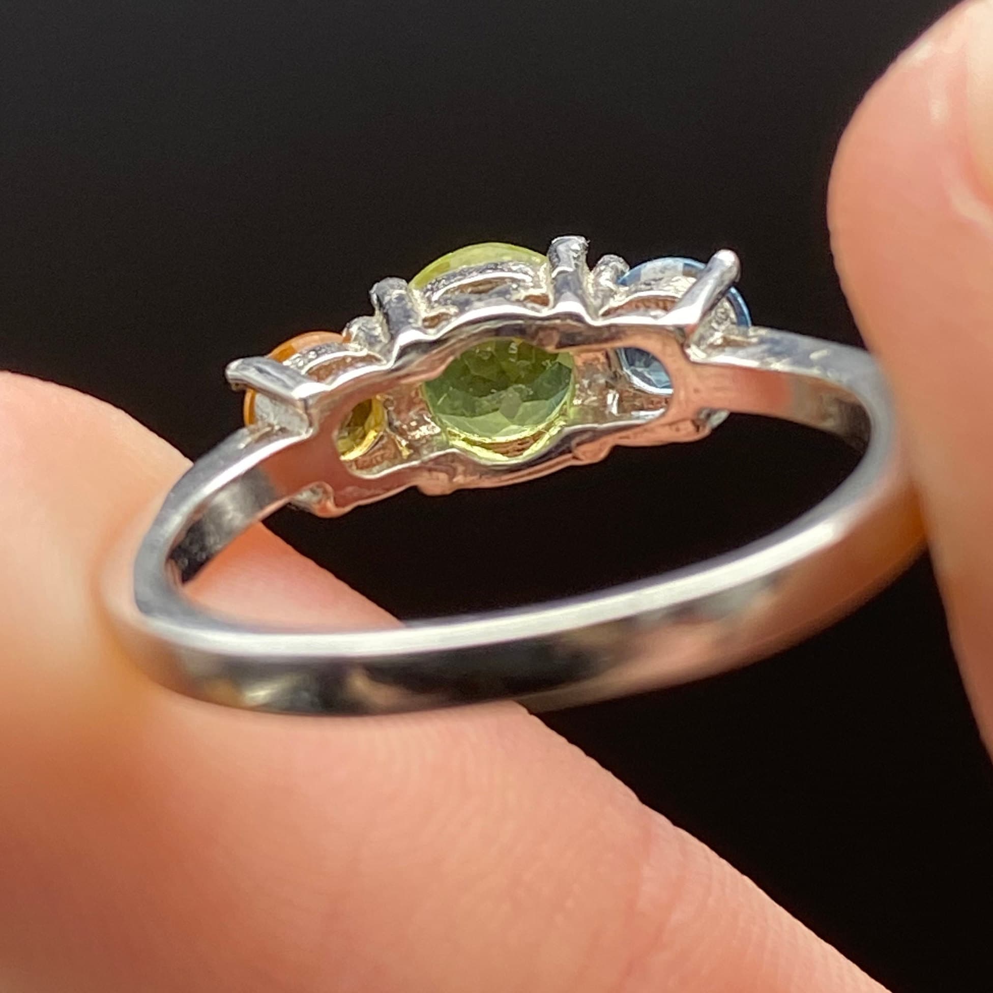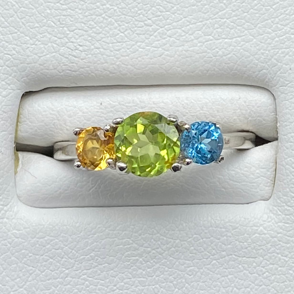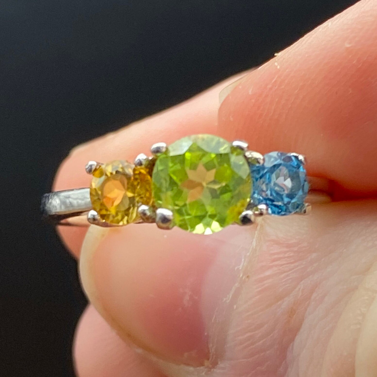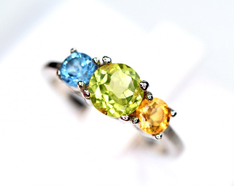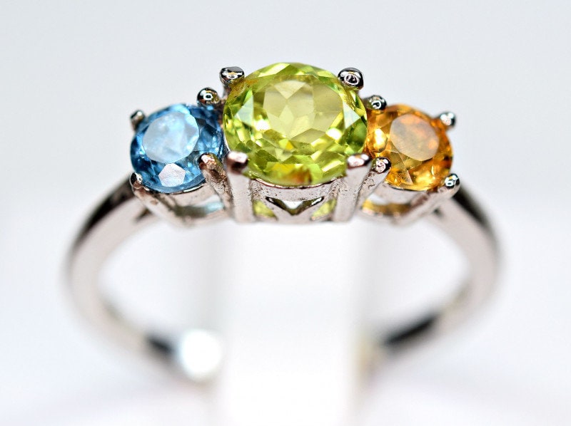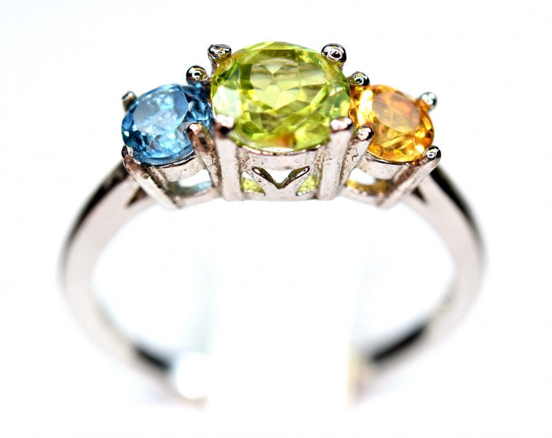 This ring is made of high-quality materials. The Peridot, Citrine & Topaz are natural and untreated (except for irradiation with is industry standard for all blue topaz) and the setting is made of solid 925 sterling silver.