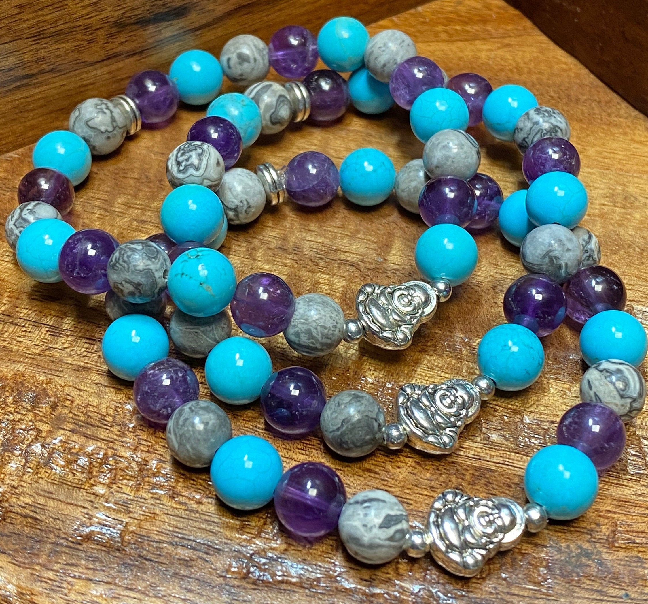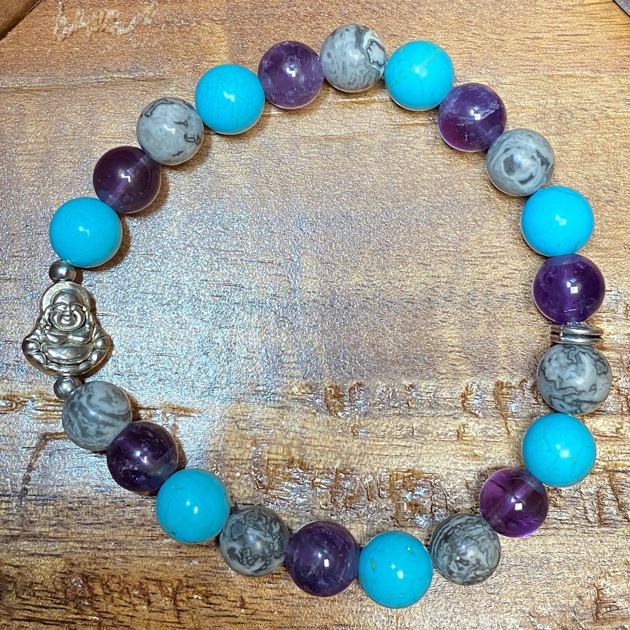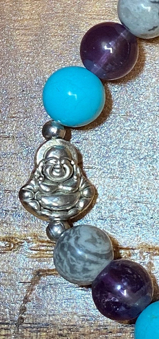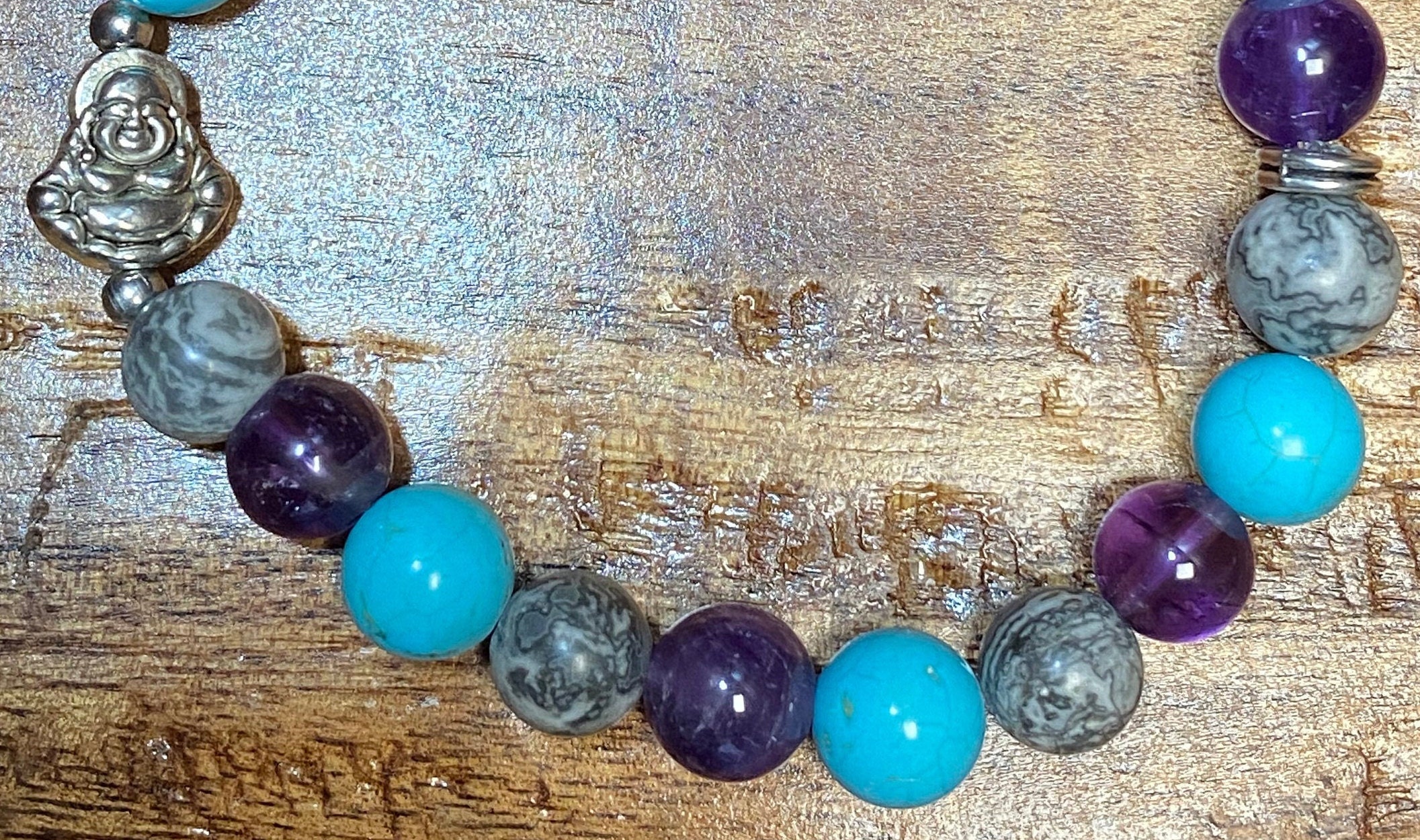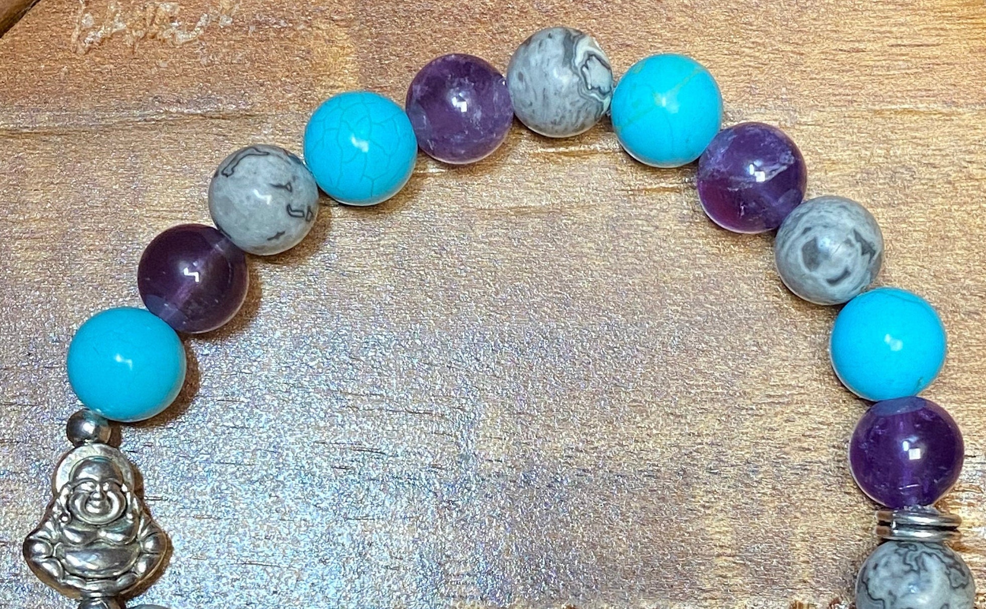 This Peaceful Amethyst, Map Jasper & Turquoise Bracelet w/ Buddha Charm was specifically designed to help balance the body both emotionally and physically. I choose to use 8mm beads for the perfect match between comfort and beauty. This bracelet is also accentuated with a silver �??Buddha�?� charm and silver spacers to enhance the the beauty of this bracelet.