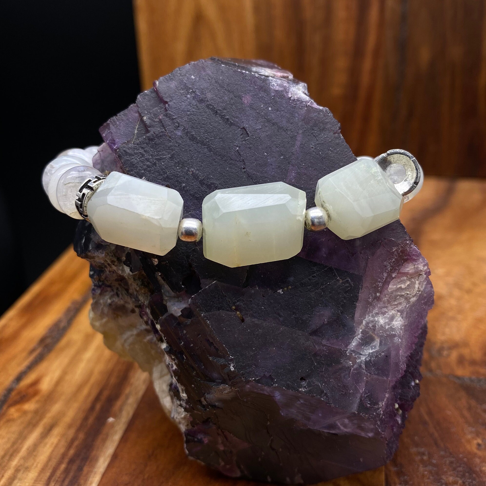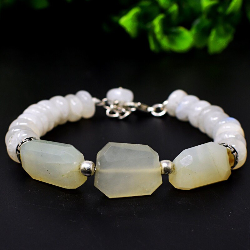 This bracelet is made of high-quality materials. The Moonstones are natural and untreated and the closure is made of solid 925 sterling silver. The accents are made of Tibetan silver.