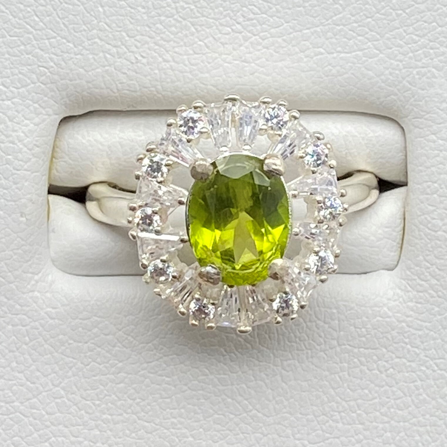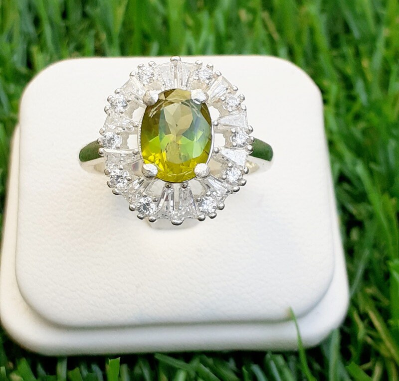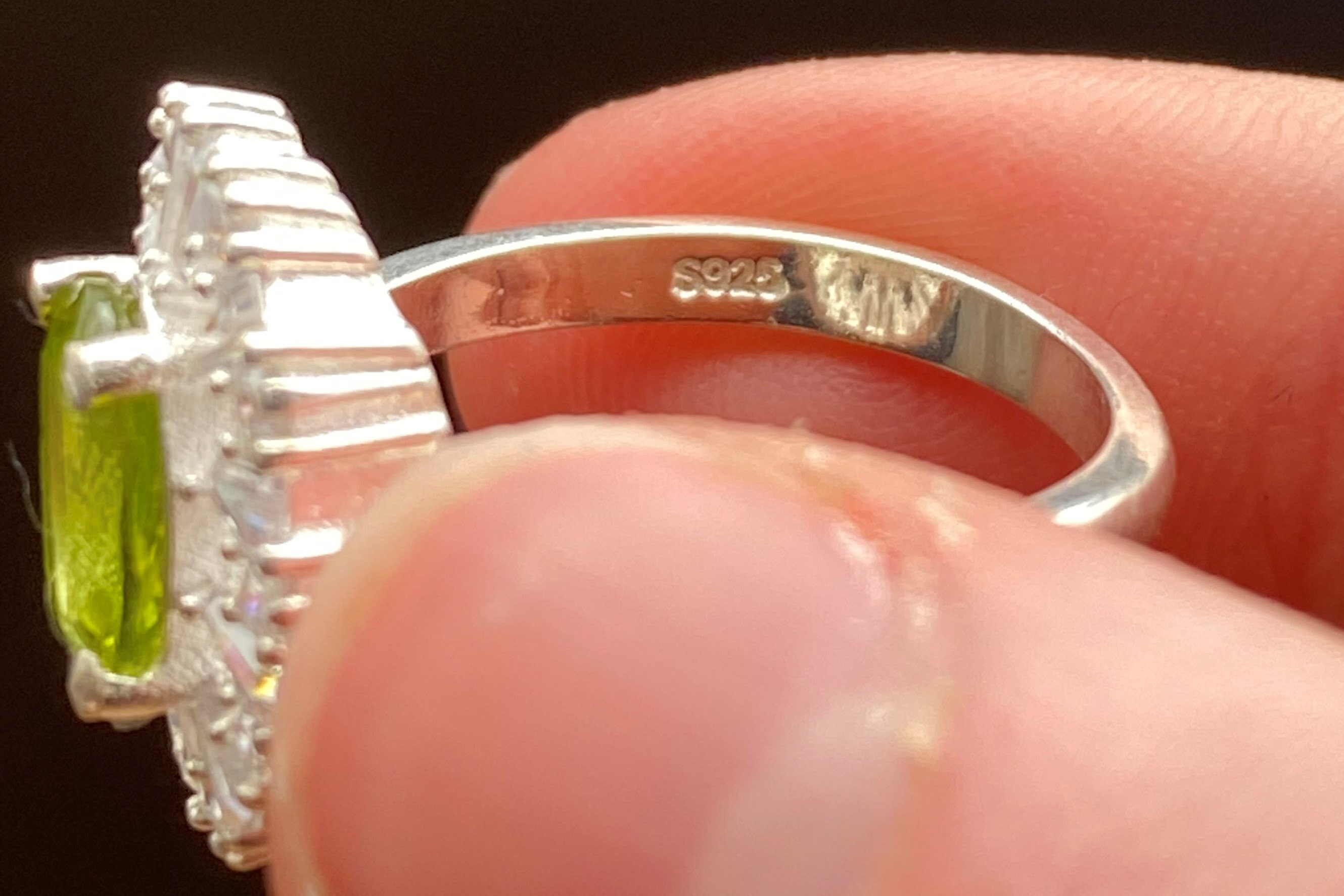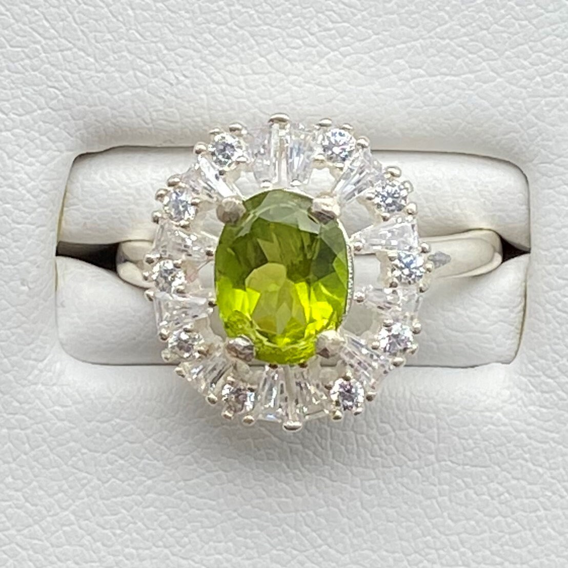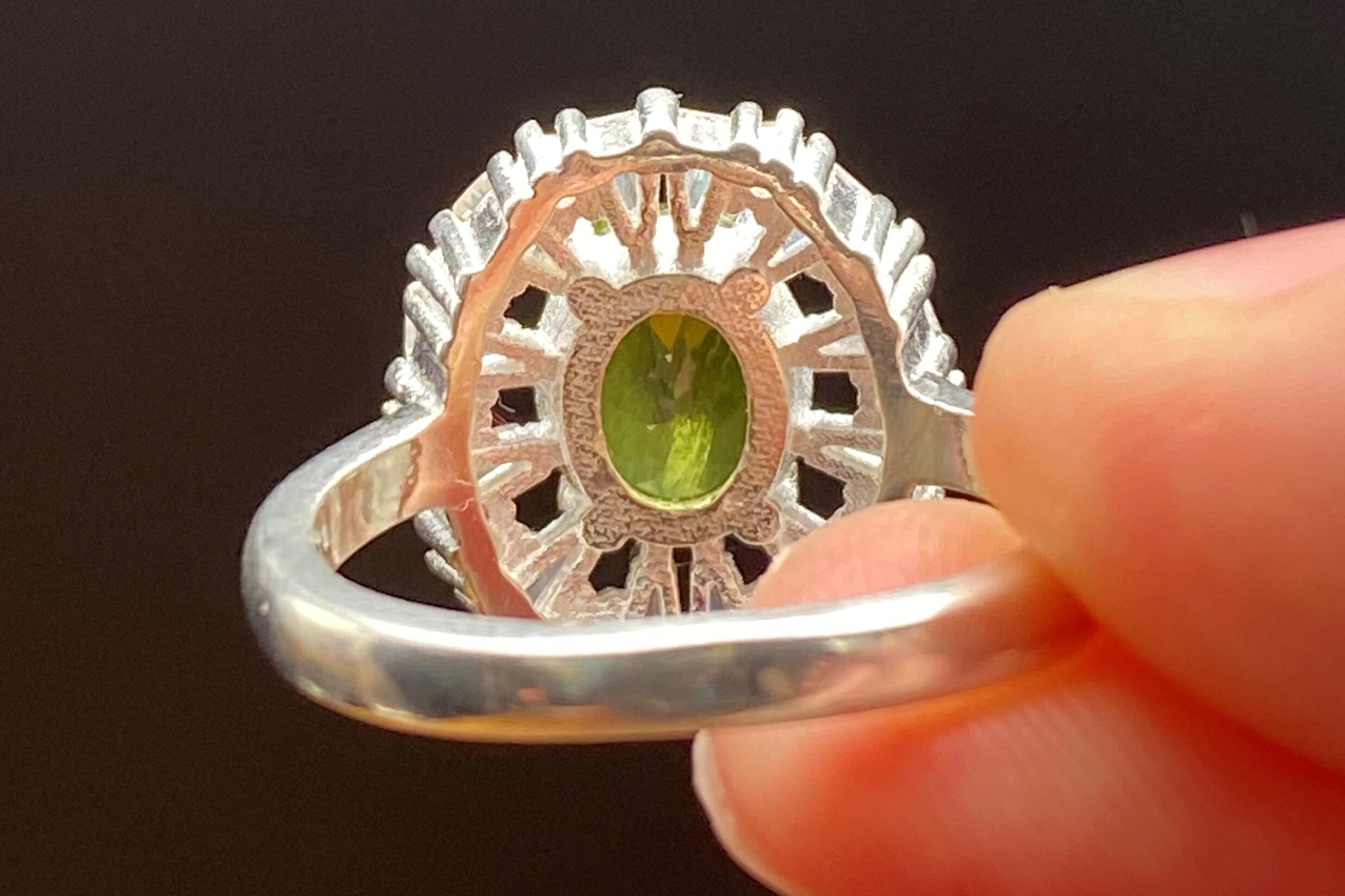 This ring is made of high-quality materials. The Peridot is natural and untreated and the setting is made of solid 925 sterling silver. The small stones around the main stone are high quality cubic zirconia.