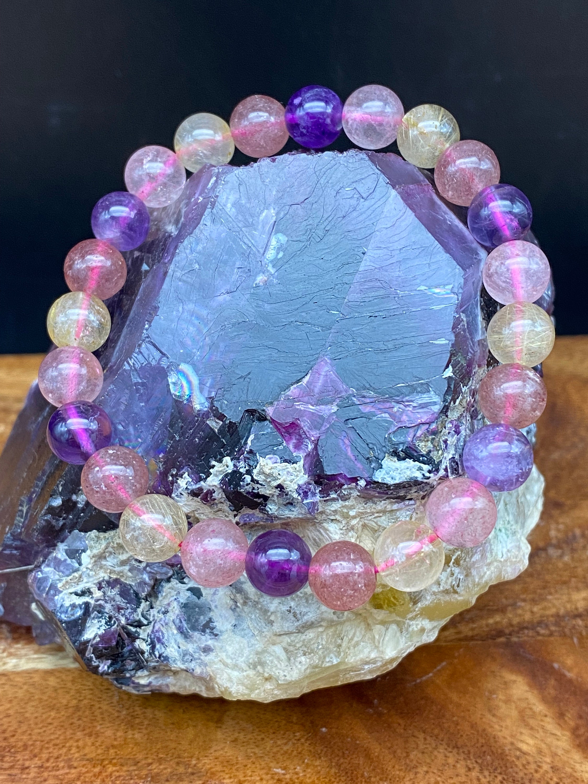 Super Seven, also known as Melody Stone or Sacred Stone, is an extremely rare mineral with seven crystals in one. The crystals are Amethyst, Cacoxenite, Goethite, Lepidocrocite, Rutile, Smoky Quartz, and Quartz (which all the minerals are usually naturally encased in).