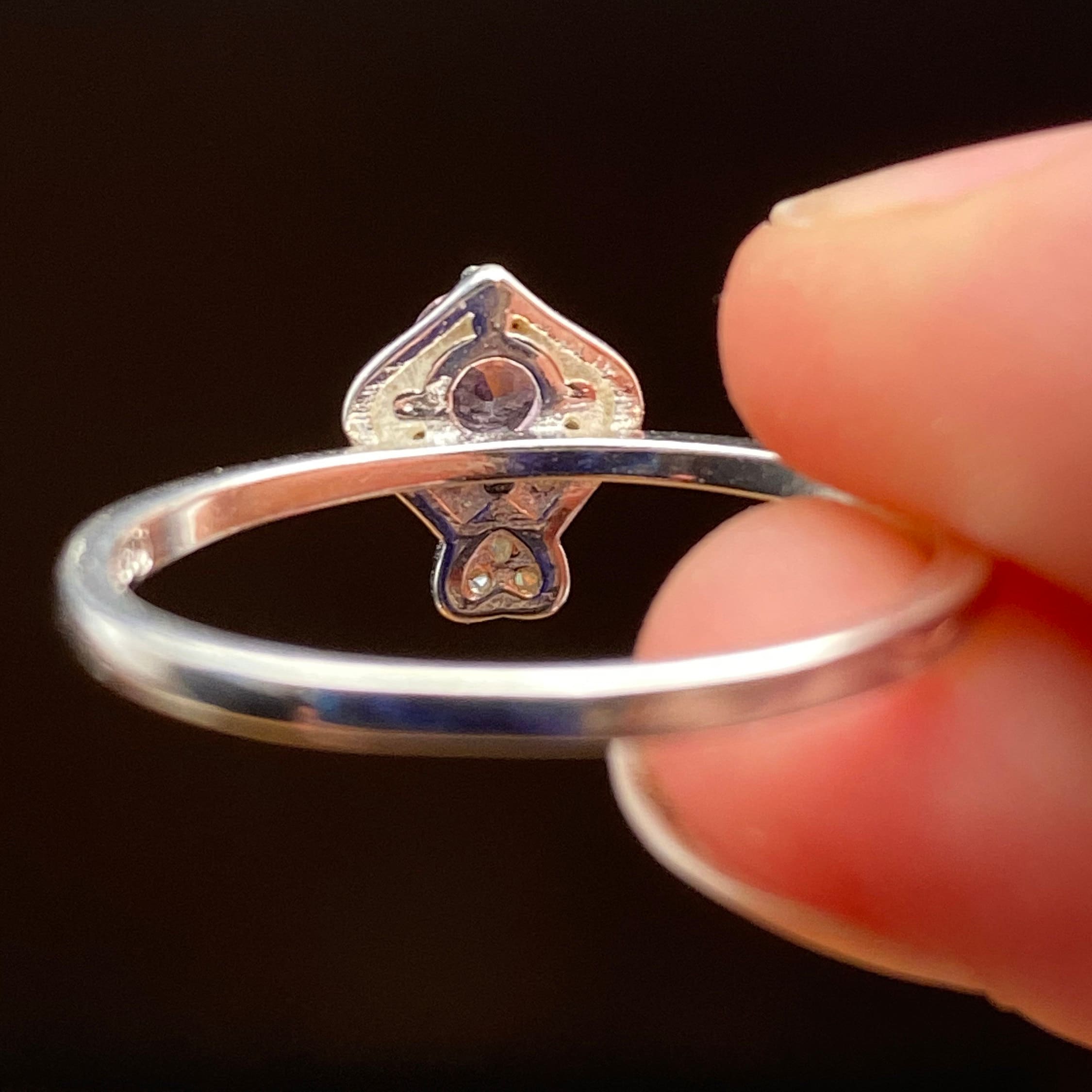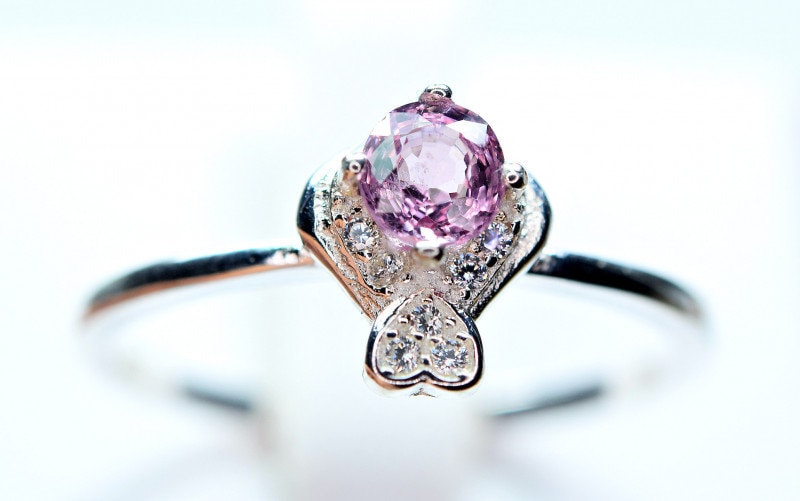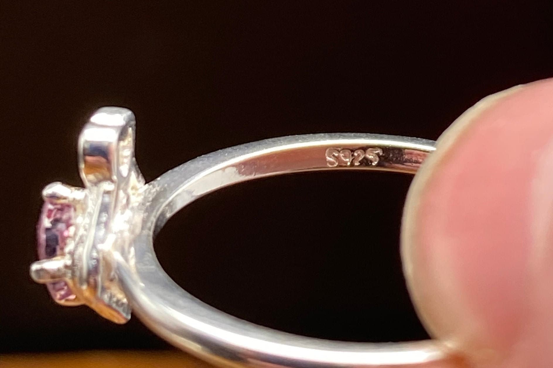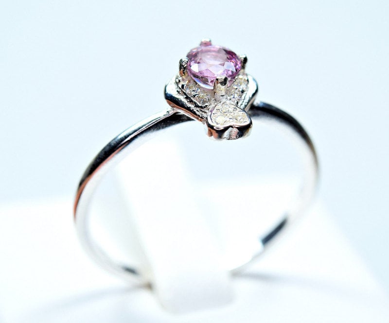 This ring is made of high-quality materials. The Purple/Pink Burmese Spinel is natural and untreated and the setting is made of solid 925 sterling silver. The small stones around the main stone are high quality cubic zirconia.