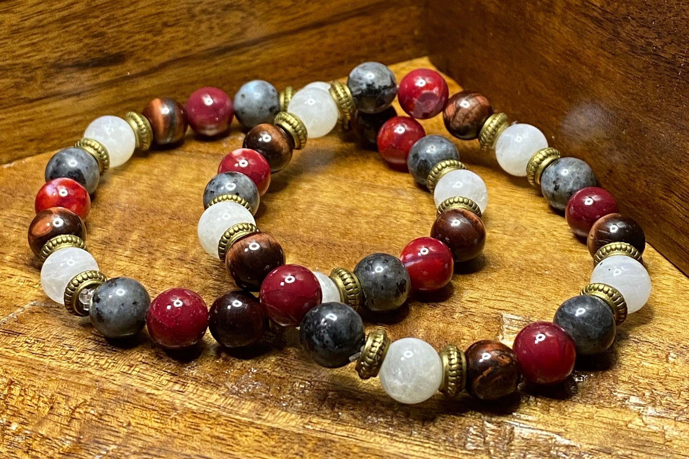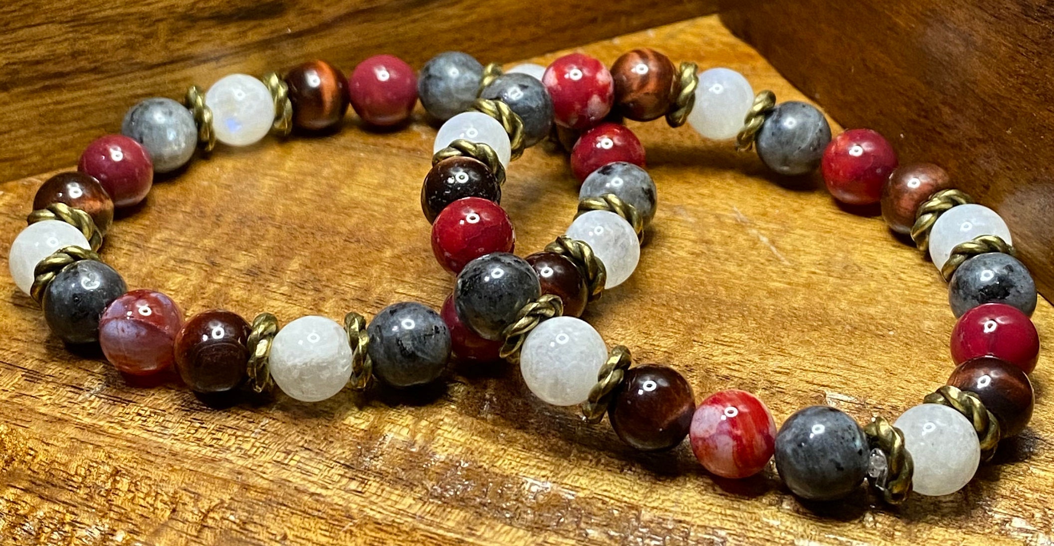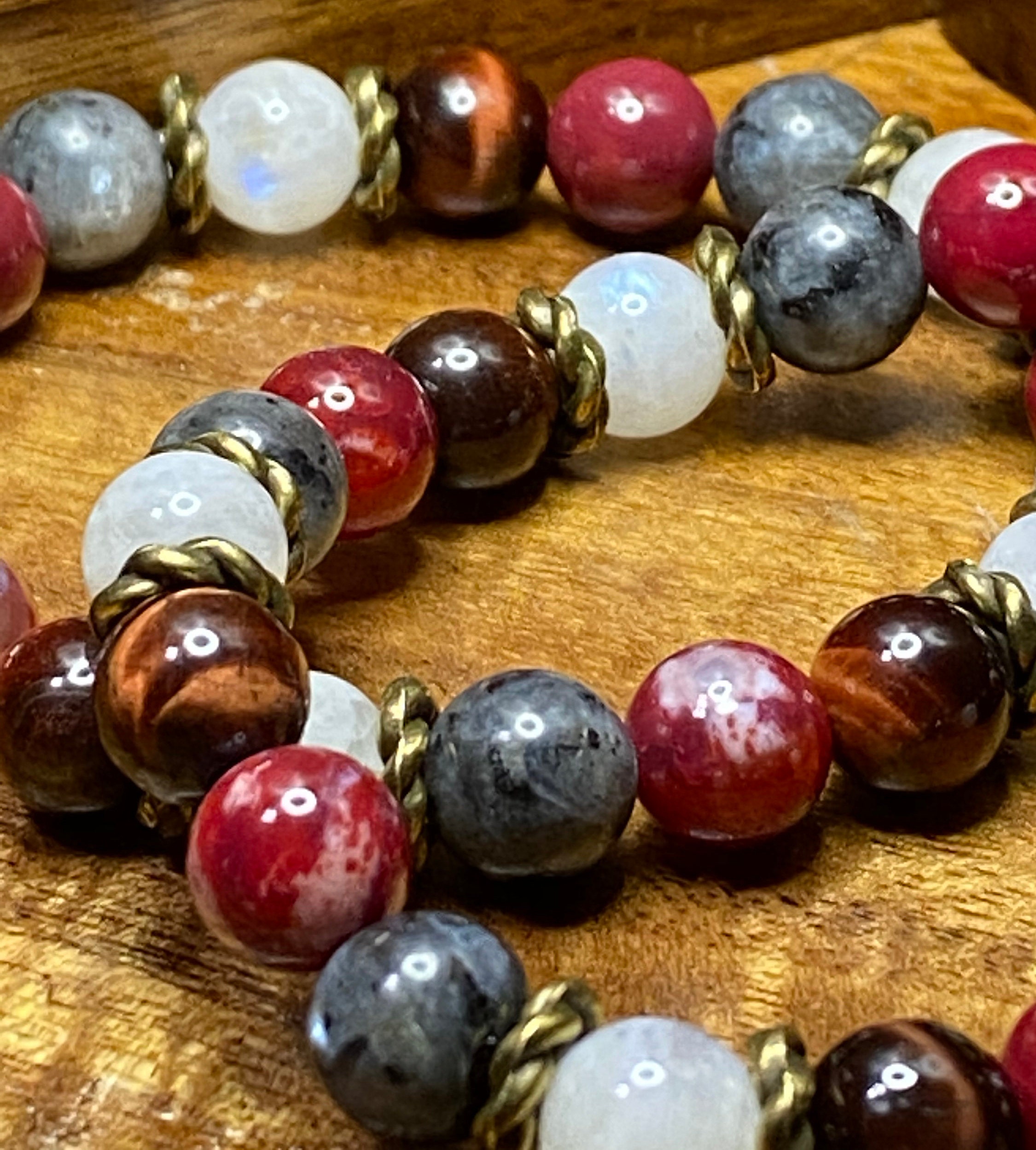 This Moonstone, Red Fire Agate, Red Tiger�??s Eye and Black Labradorite bracelet will bring health, healing, strength and power to all those looking for it during these rough times. I choose to use 8mm size bead for the perfect fit and the natural stone are accentuated the most beautiful bronze spacers.