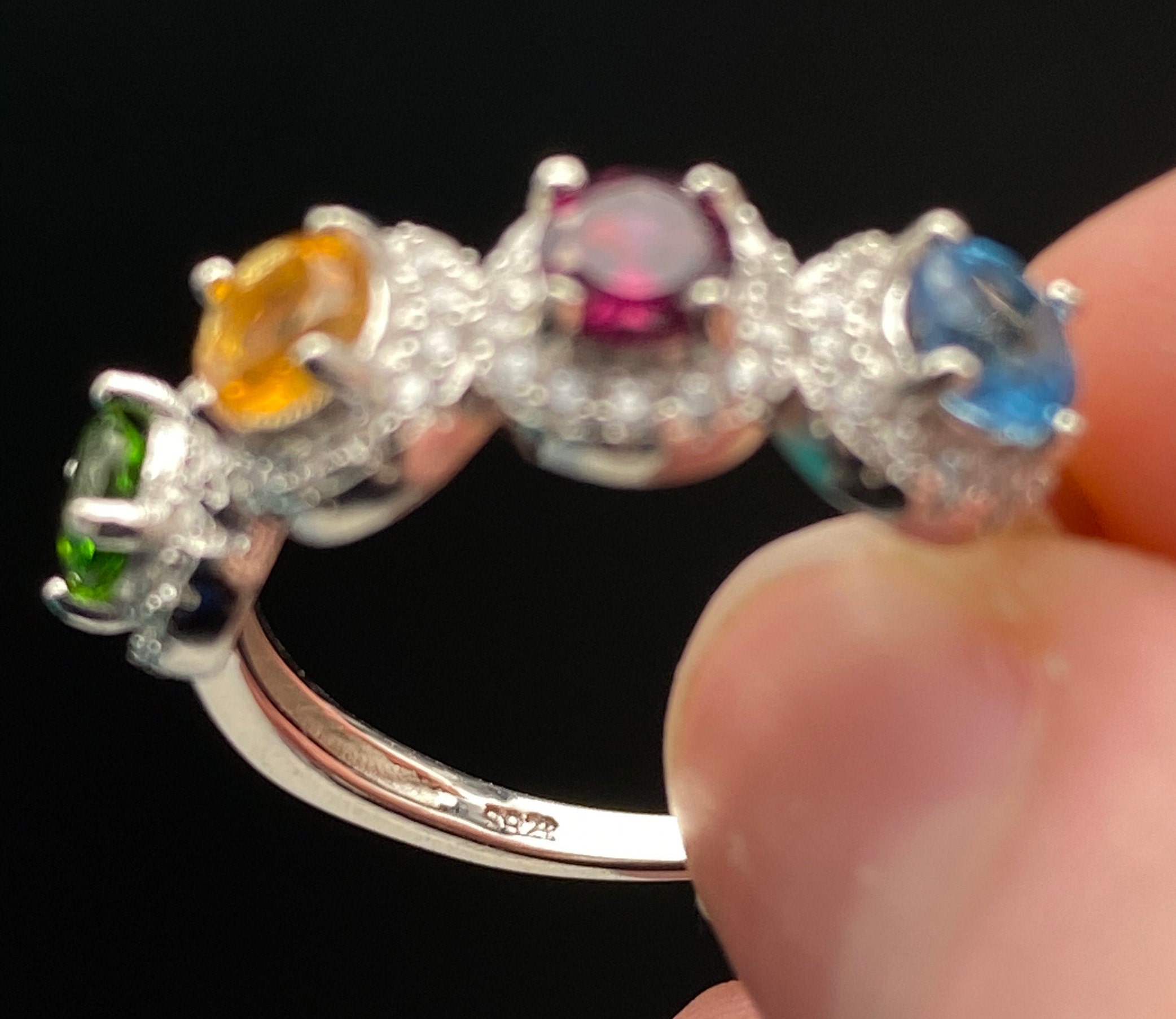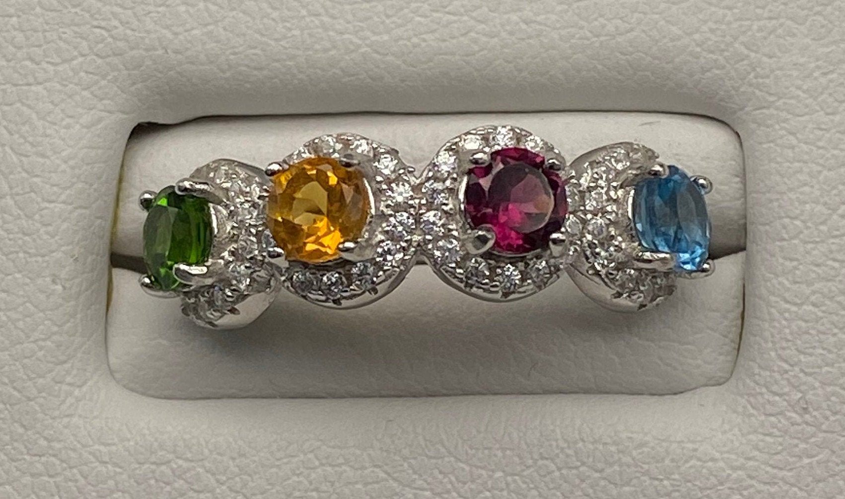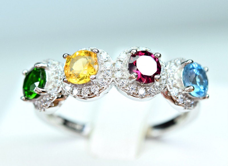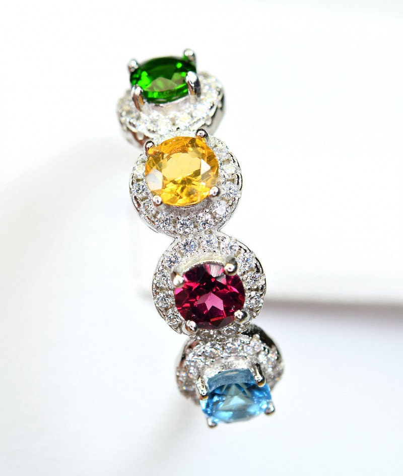 This ring is made of high-quality materials. The London blue Topaz, Citrine, Rhodolite Garnet, and Chrome Diopside are natural and untreated and the setting is made of solid 925 sterling silver. The small stones around the main stone are high quality cubic zirconia.