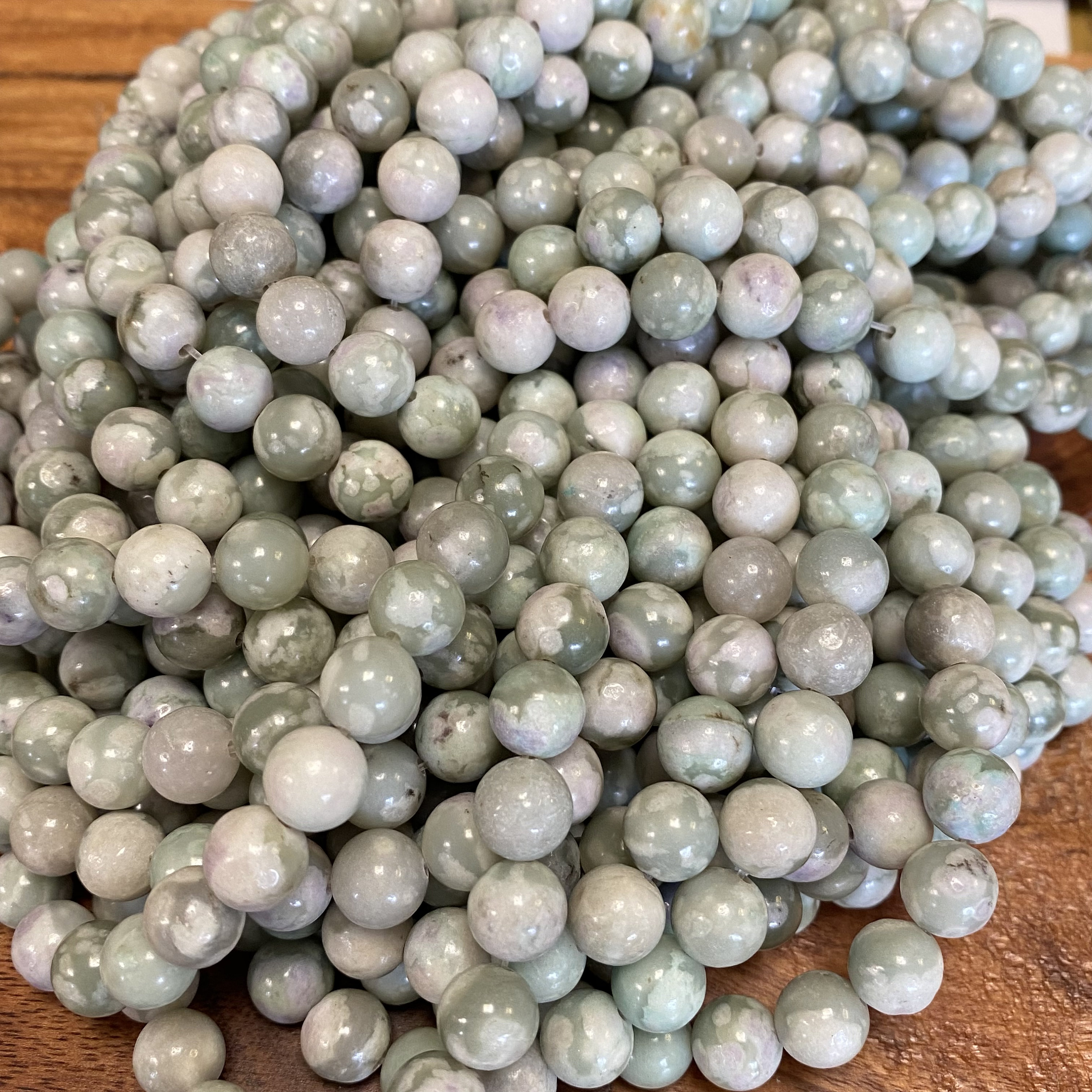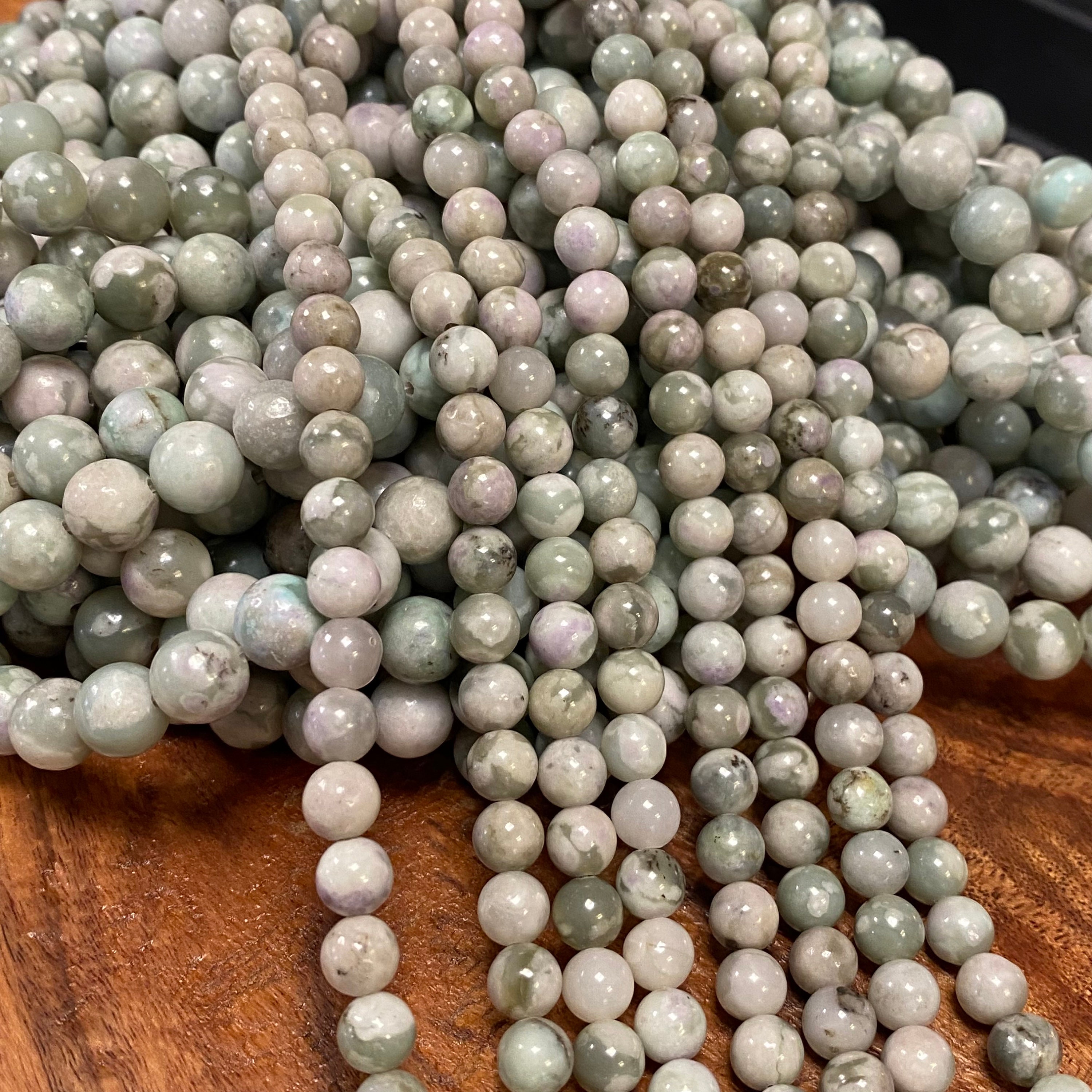 Peace Jade was named for the emotion each bead evokes - bringing forth tranquility and harmony. Peace Jade is a mix of green serpentine, lavender or pink stichtite, and white quartz.