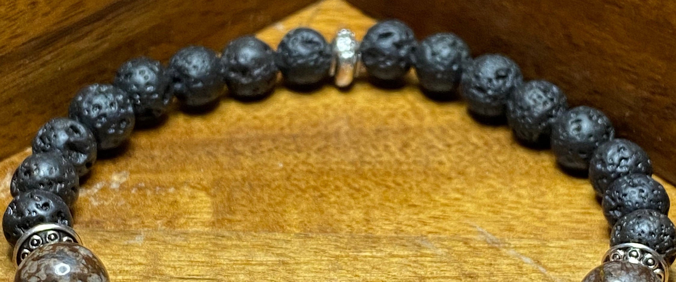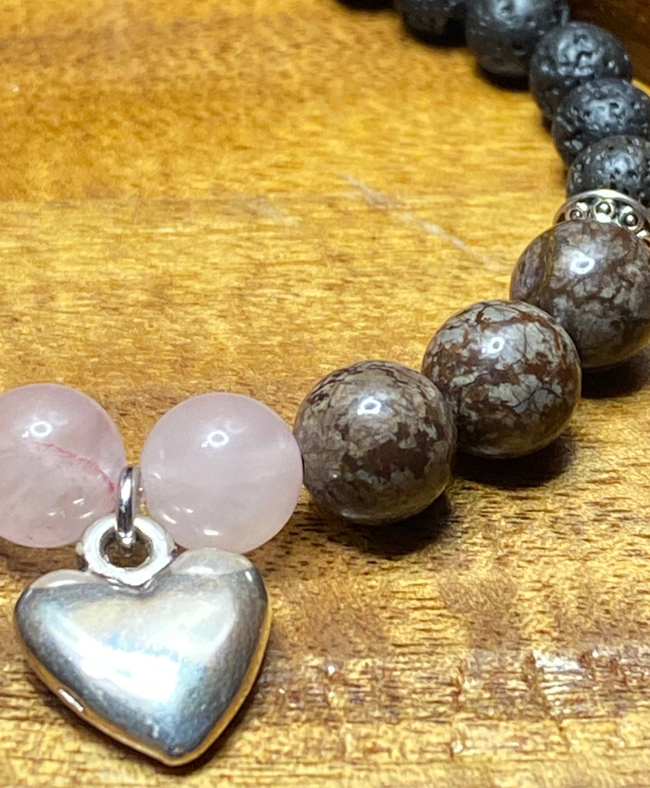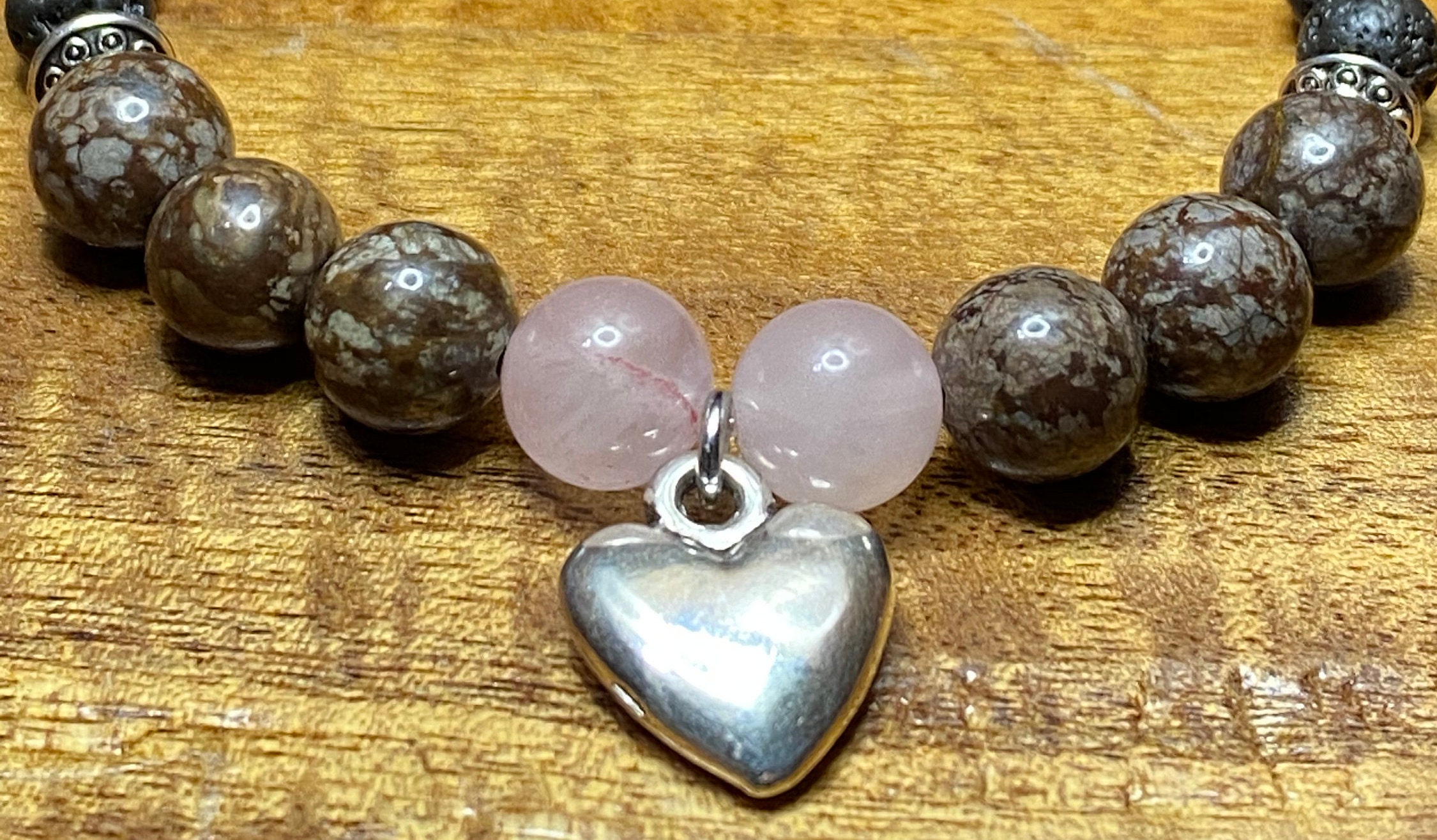 This Rose Quartz, Brown Snowflake Obsidian and Lava Rock, Bracelet was specifically designed to help balance the body both emotionally and physically. I choose to use 8mm and 6mm size beads for the perfect match between comfort and beauty. This bracelet is also accented by a Tibetan silver charm.