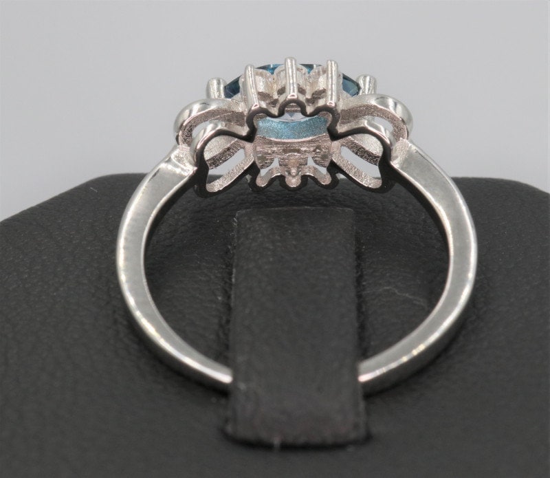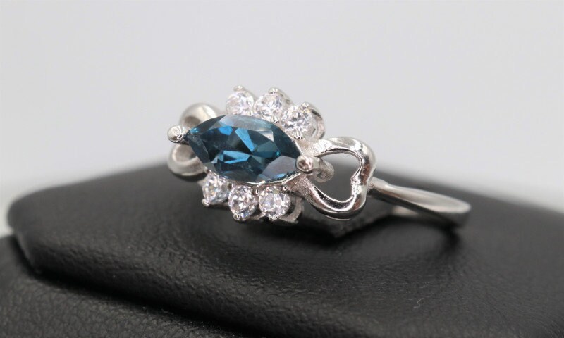 This ring is made of high-quality materials. The blue topaz is natural (it has been irradiated to get the blue color as is industry standard for all blue topaz) and the setting is made of solid 925 sterling silver. The small stones around the main stone are high quality cubic zirconia.