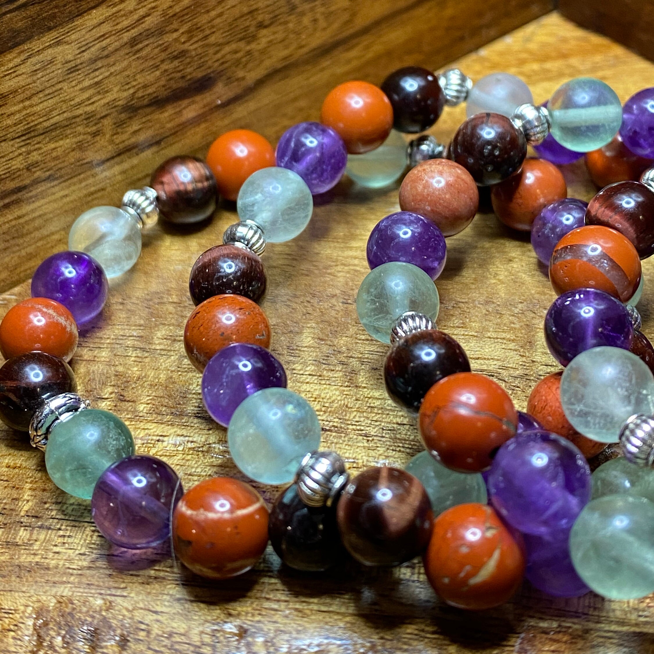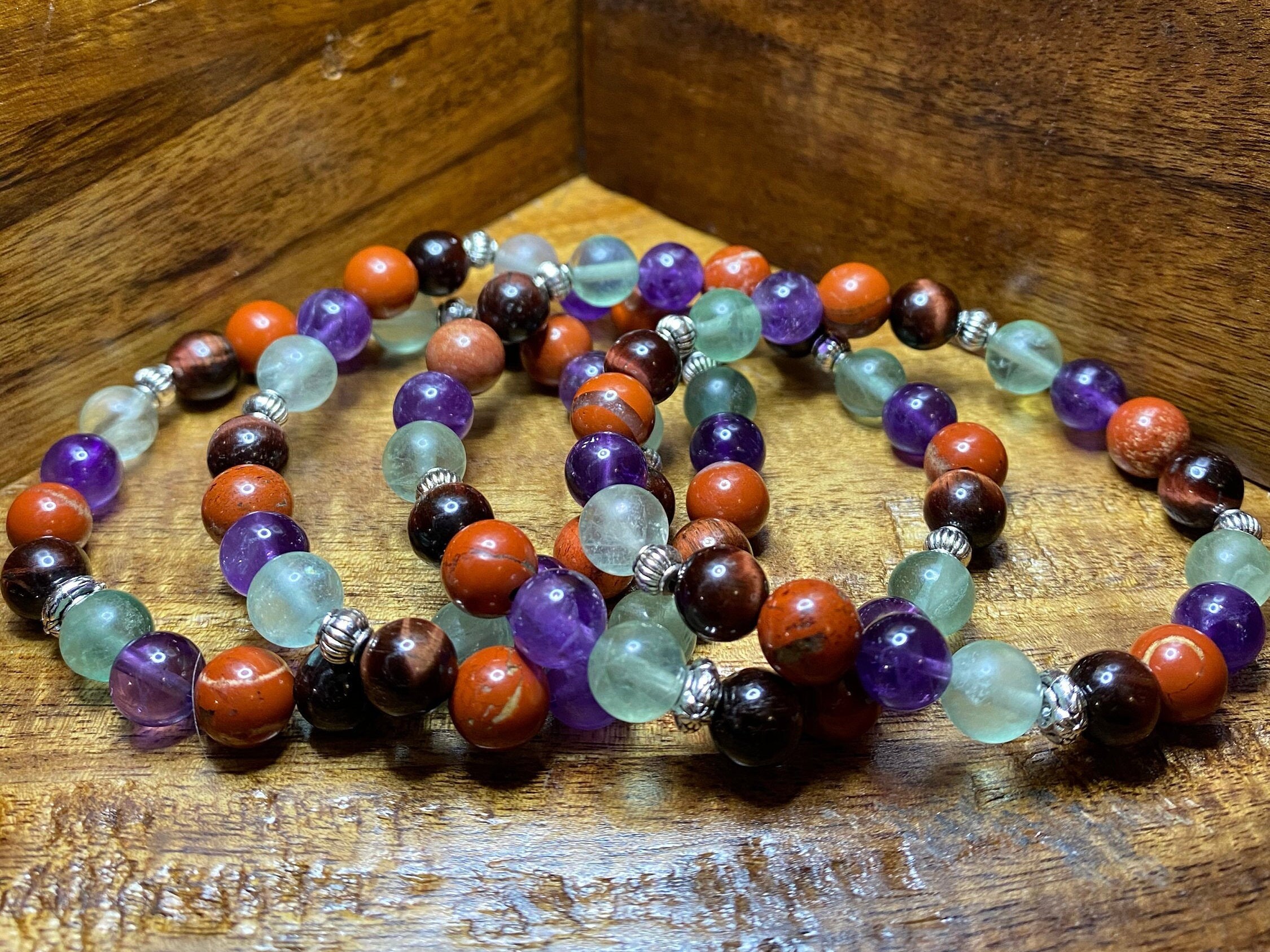 This Red Jasper, Fluorite, Amethyst and Tiger’s Eye bracelet will bring health, healing, strength and power to all those looking for it during these rough times. I choose to use 8mm size beads for the perfect fit and the natural stone are accentuated the most beautiful silver spacers.