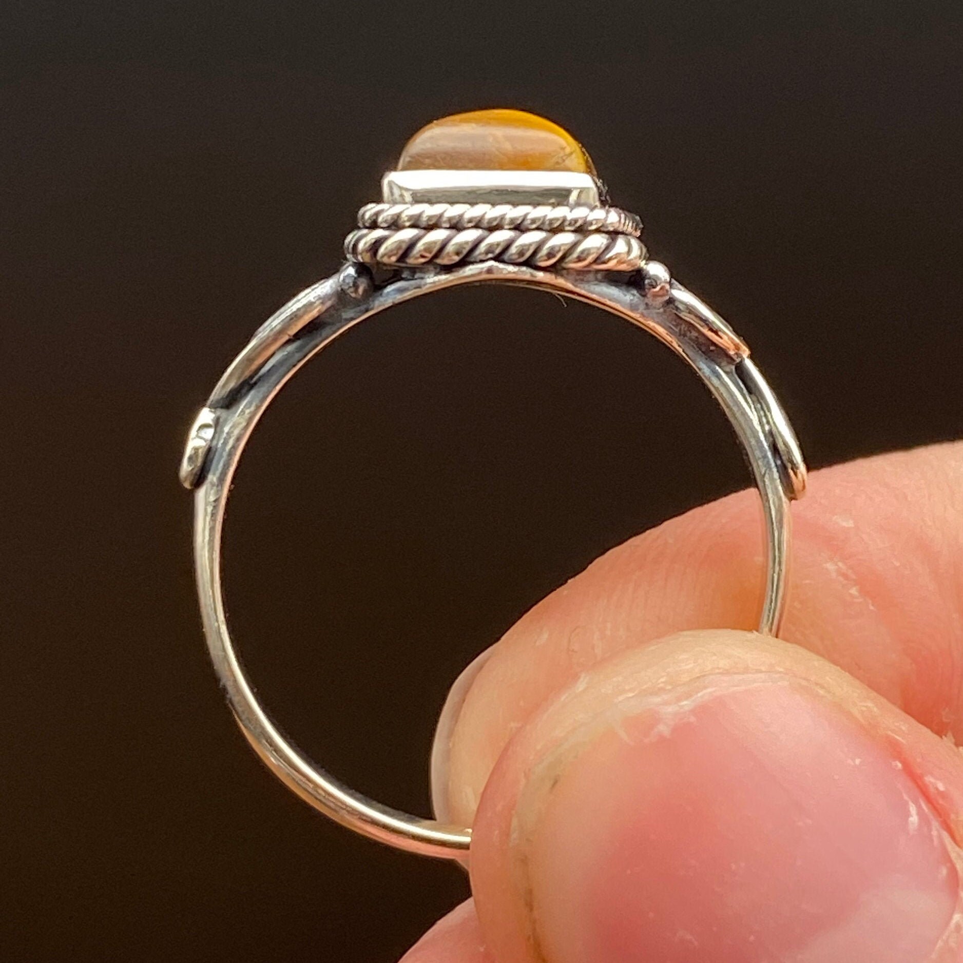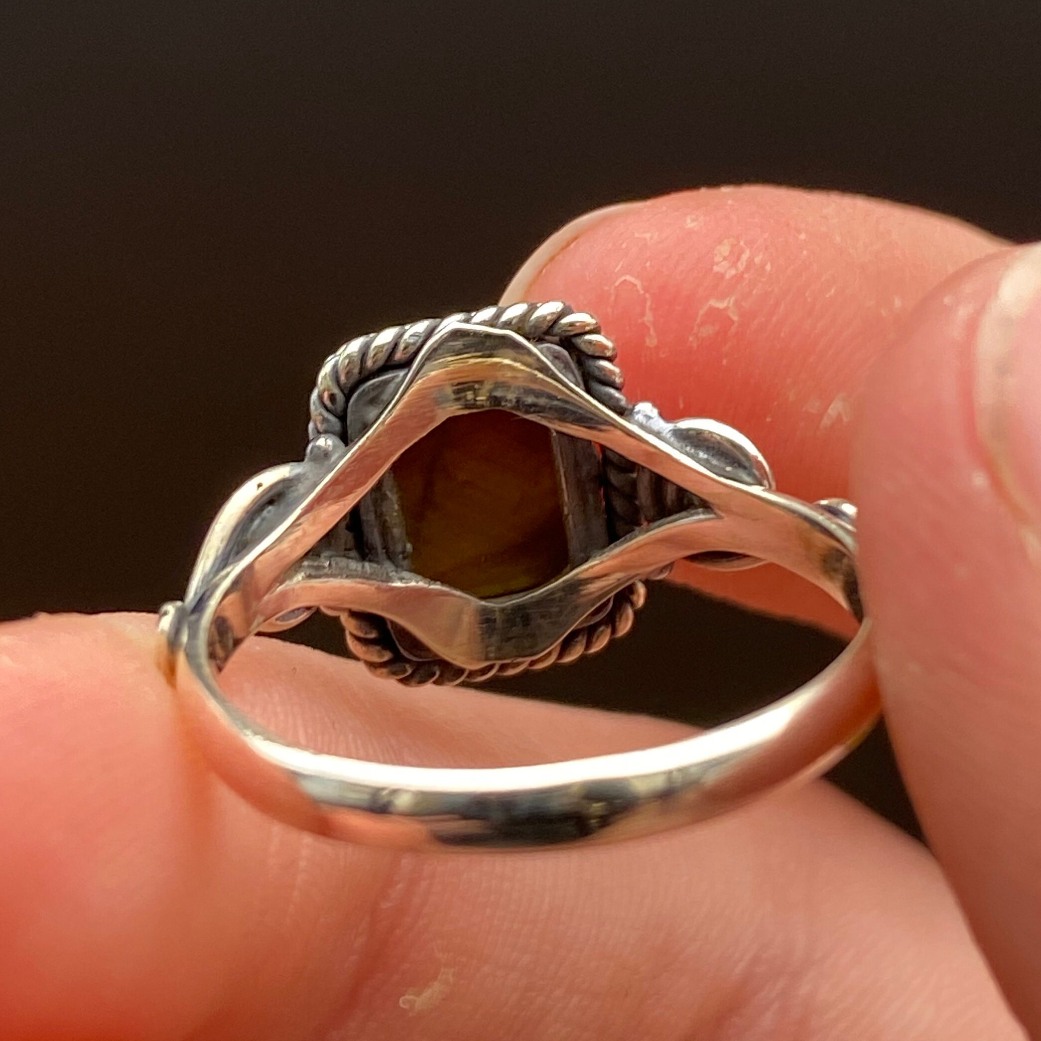 This ring is made of high-quality materials. The Tiger Eye is natural and untreated and the setting is made of solid 925 sterling silver.