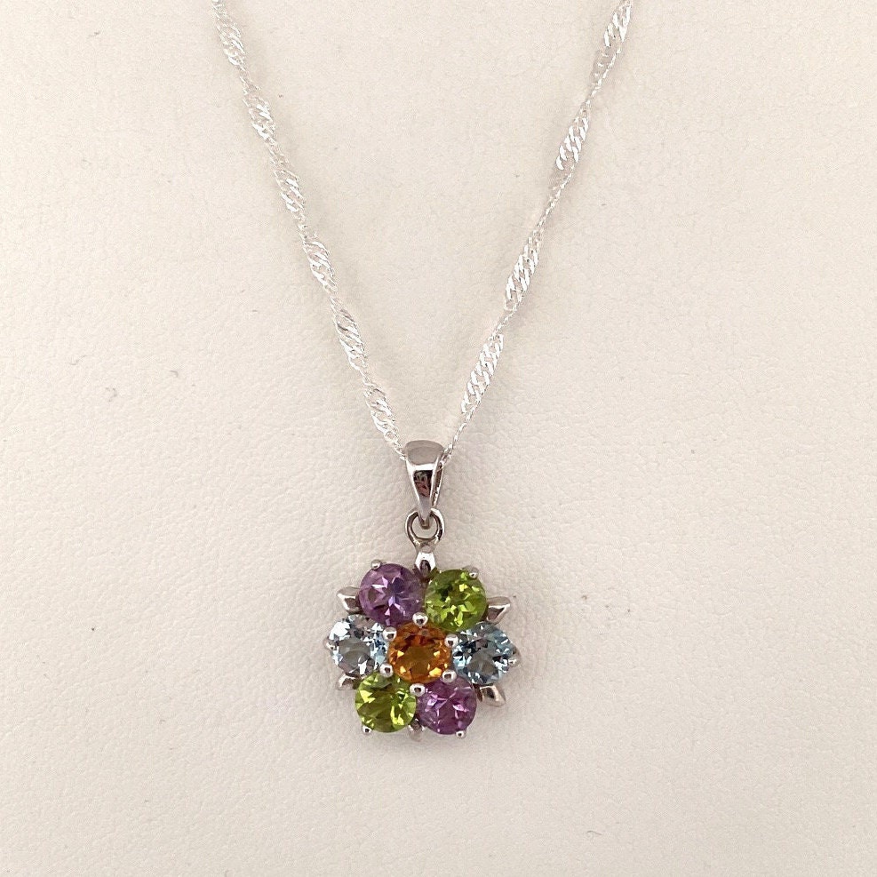 This necklace and pendant are made of high-quality materials. The Peridot, Amethyst, Citrine and Blue Topaz are natural and untreated (except the topaz is irradiated as per industry standard to get the beautiful blue color) and the chain and pendant are made of solid 925 sterling silver.