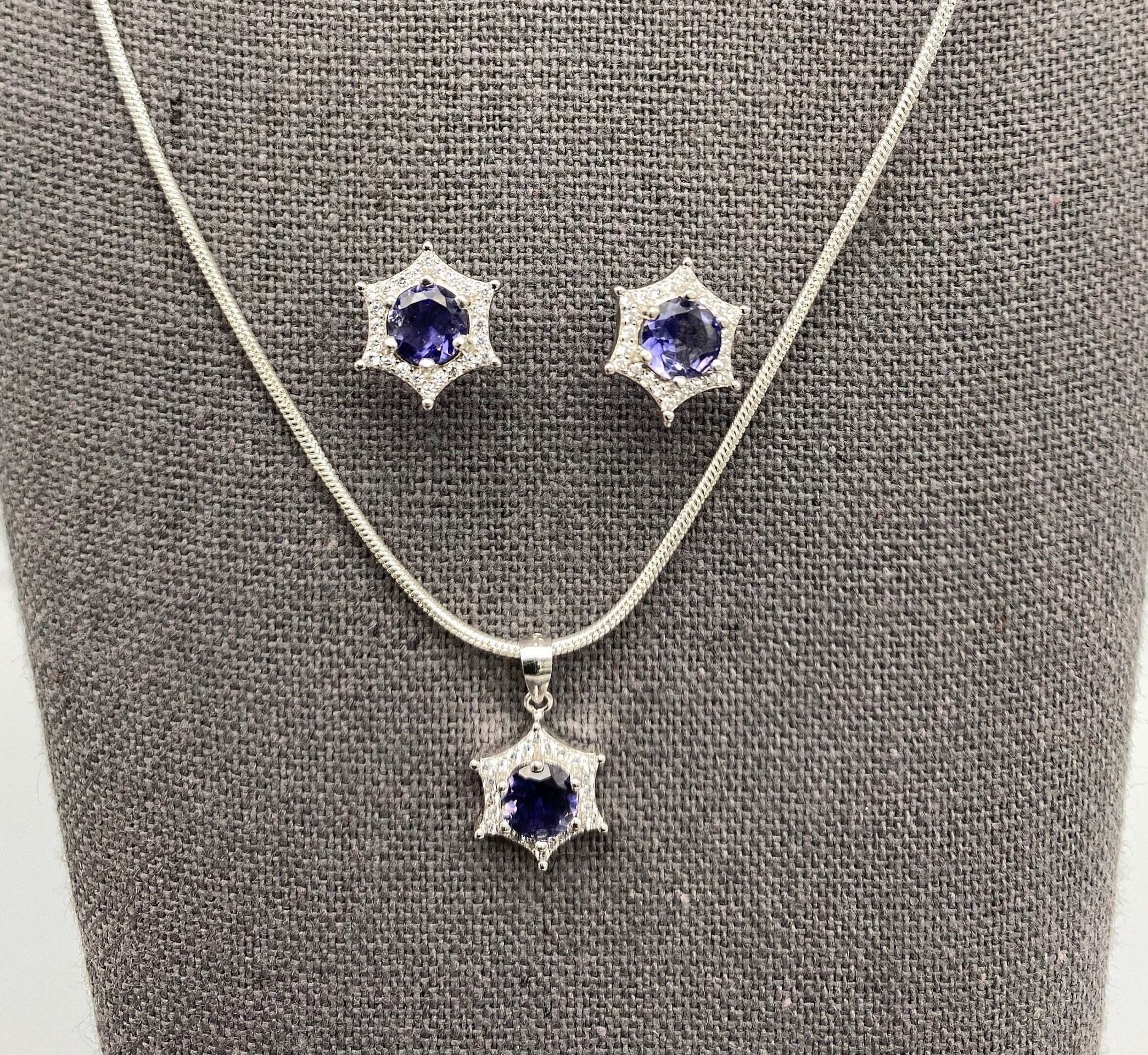 Spectacular Natural Blue Iolite Snowflake Pendant Necklace and Earring Set in 925 Sterling Silver