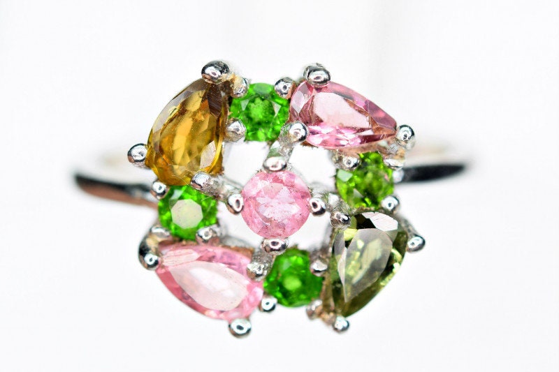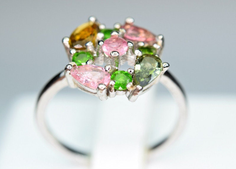 This ring is made of high-quality materials. The Rubellite (Pink Tourmaline), Verdelite (Green Tourmaline), Dravite (Brown Tourmaline) and Chrome Diopside are natural and untreated and the setting is made of solid 925 sterling silver.