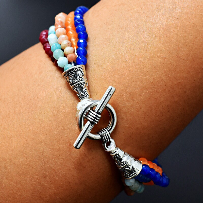 This bracelet is made of high-quality materials. The multicolored Chalcedony is natural and untreated and the accents and closure are made of solid 925 sterling silver.