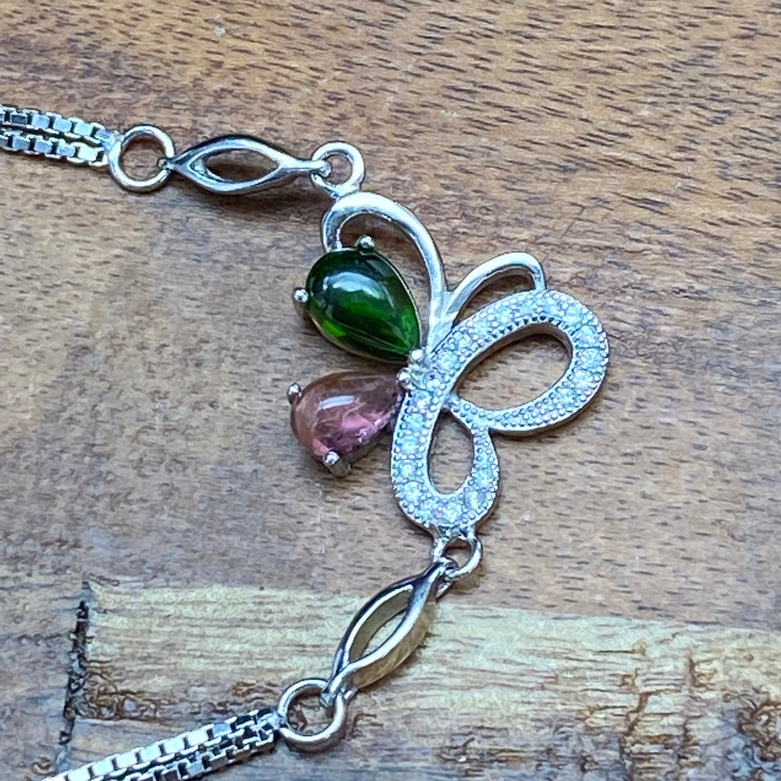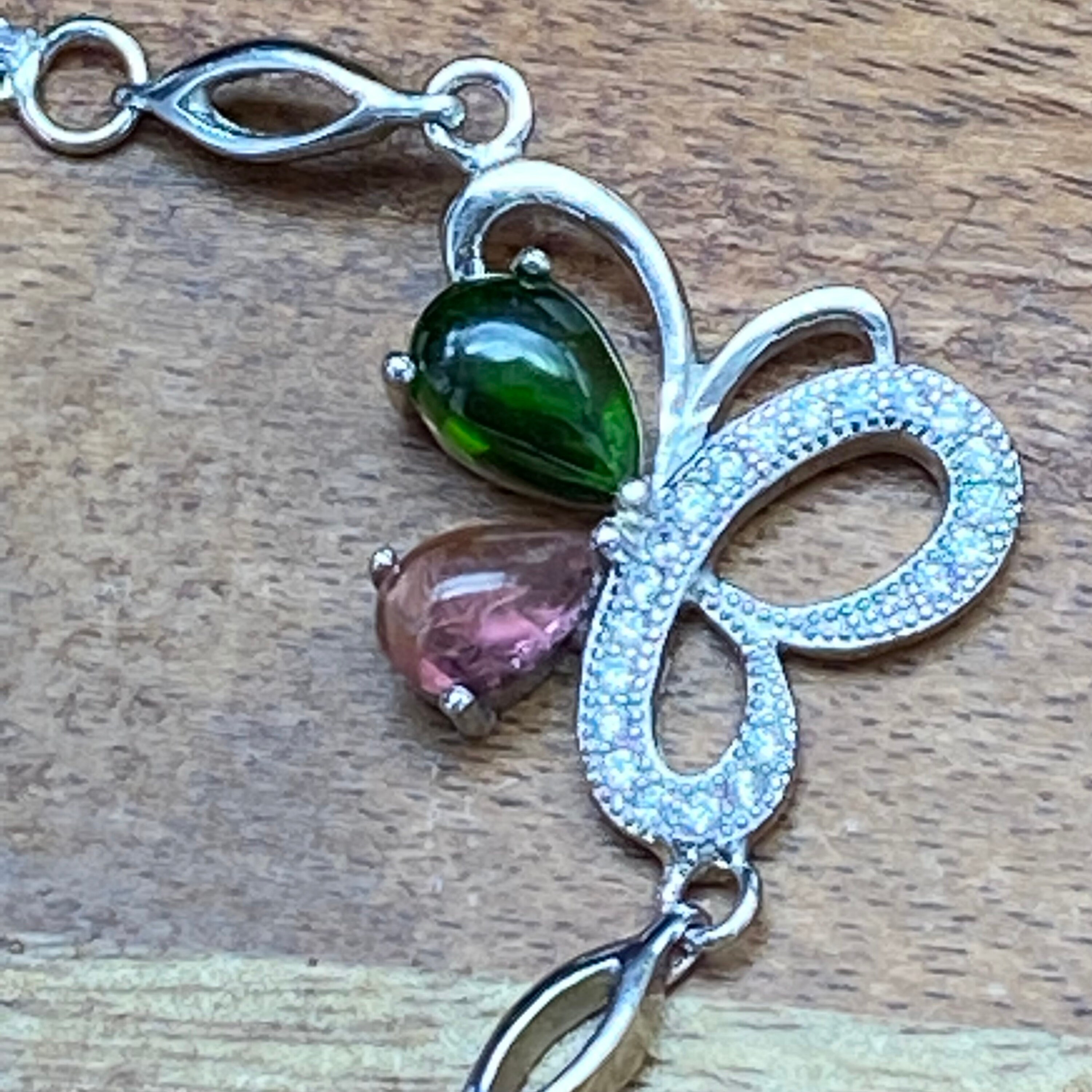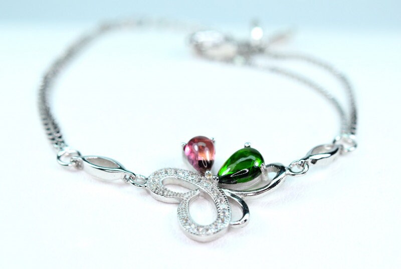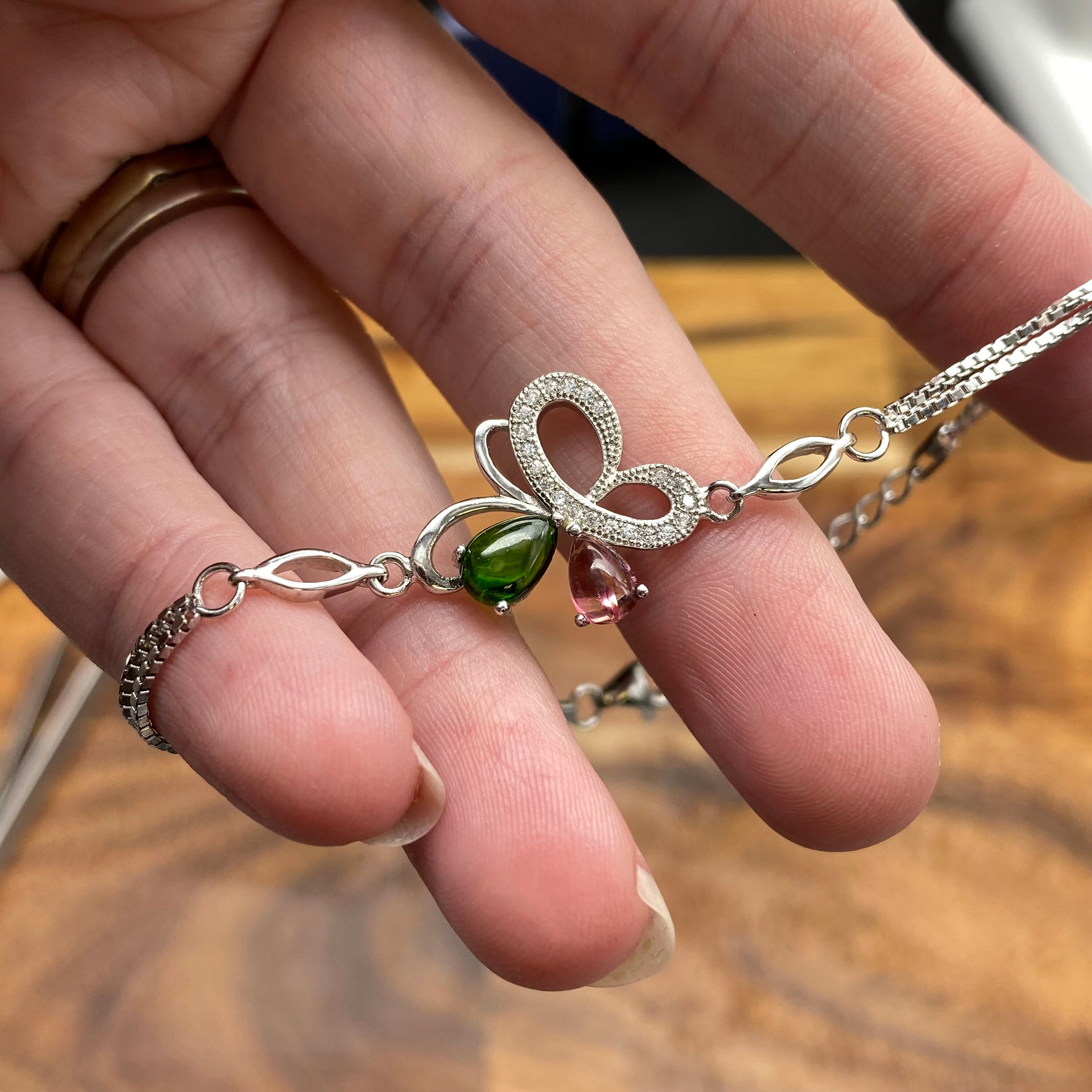 This bracelet is made of high-quality materials. The Chrome Diopside and Pink Tourmaline are natural and untreated and the setting is made of solid 925 sterling silver.