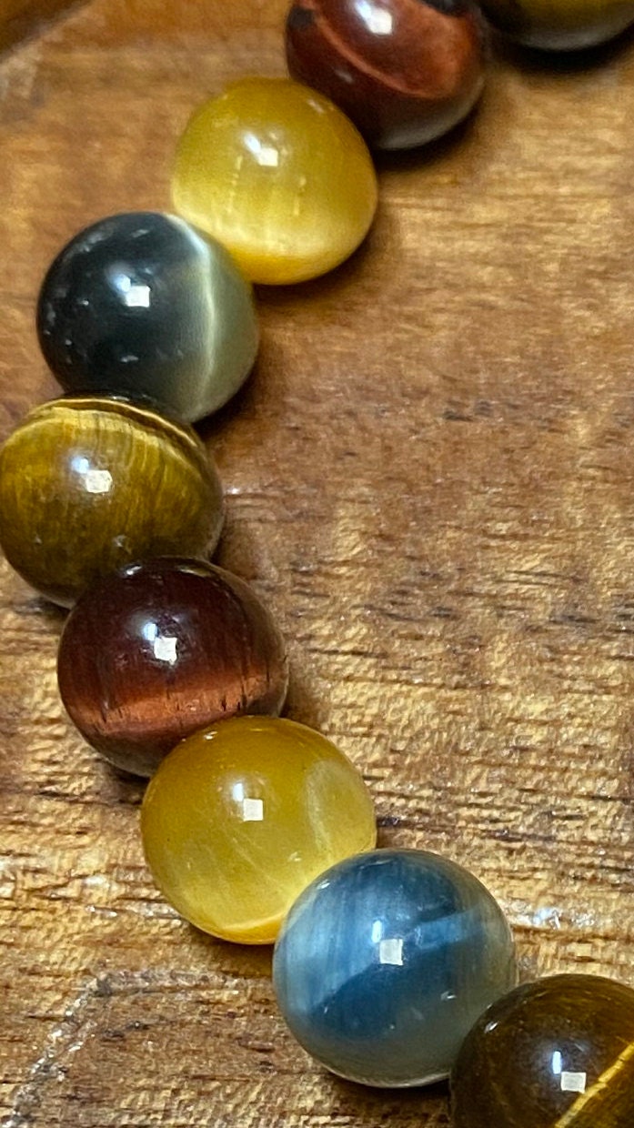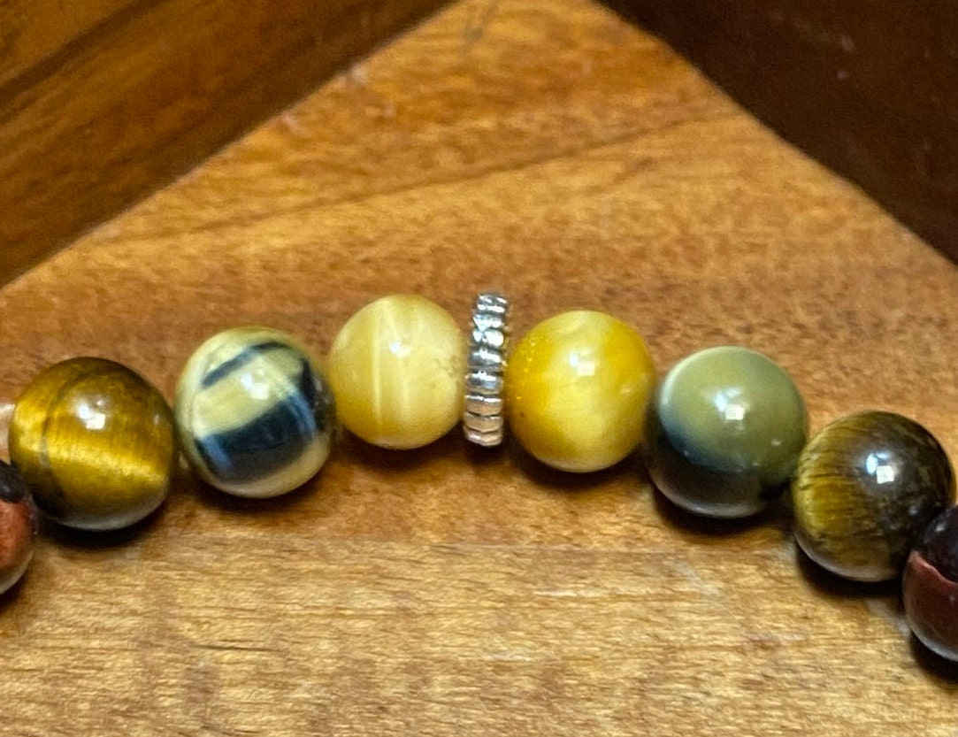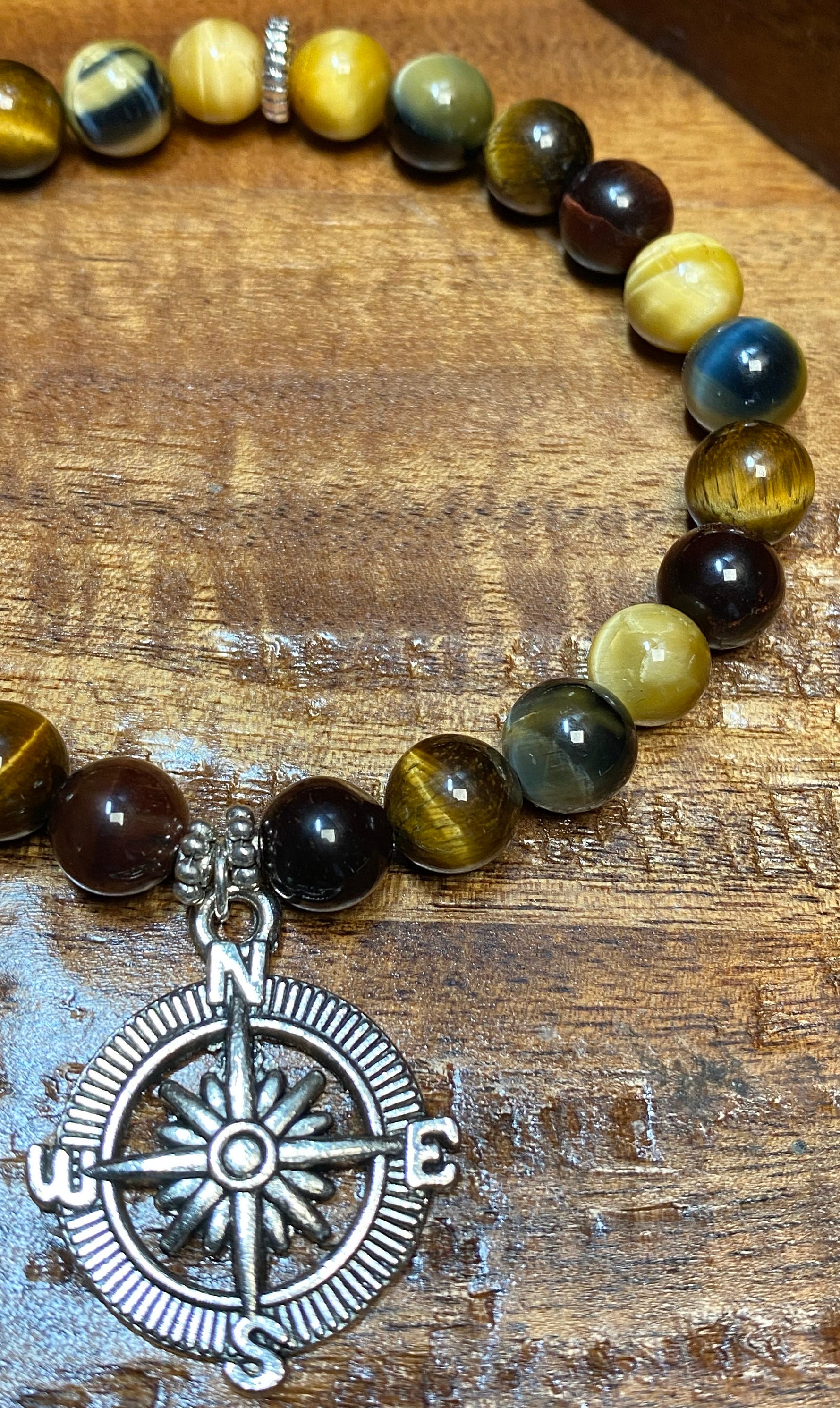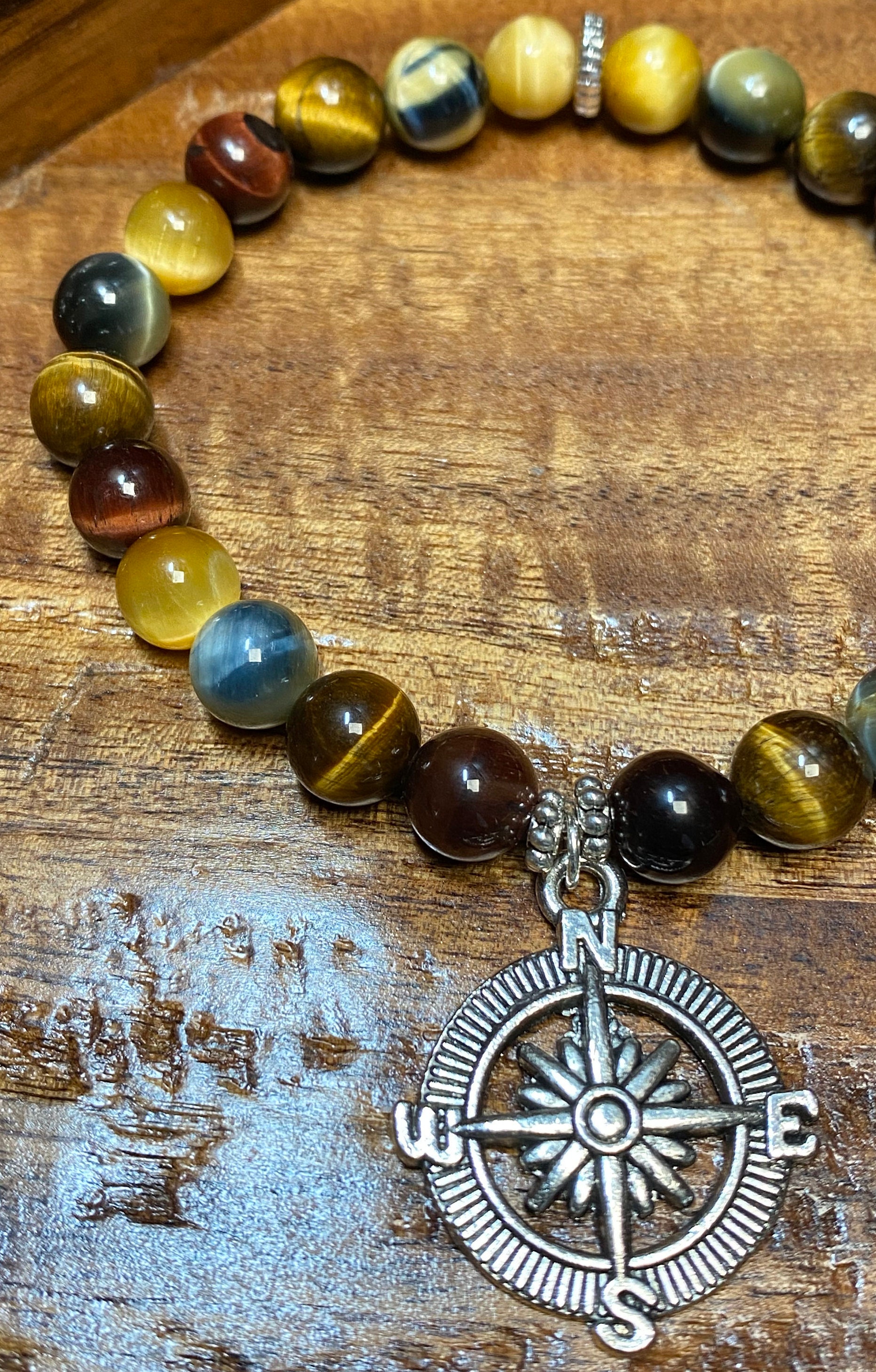 This Golden Yellow, Golden Blue, Red & Brown Tiger Eye Bracelet was specifically designed to help balance the body both emotionally and physically. I choose to use 8mm beads for the perfect match between comfort and beauty. This bracelet is also accentuated with a nautical themed compass charm that can either symbolize one�??s love of the sea of can symbolize one�??s goals of �??staying on course�?� within their life. This charm also serves to enhance the the beauty of this bracelet.
