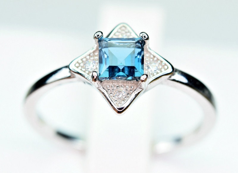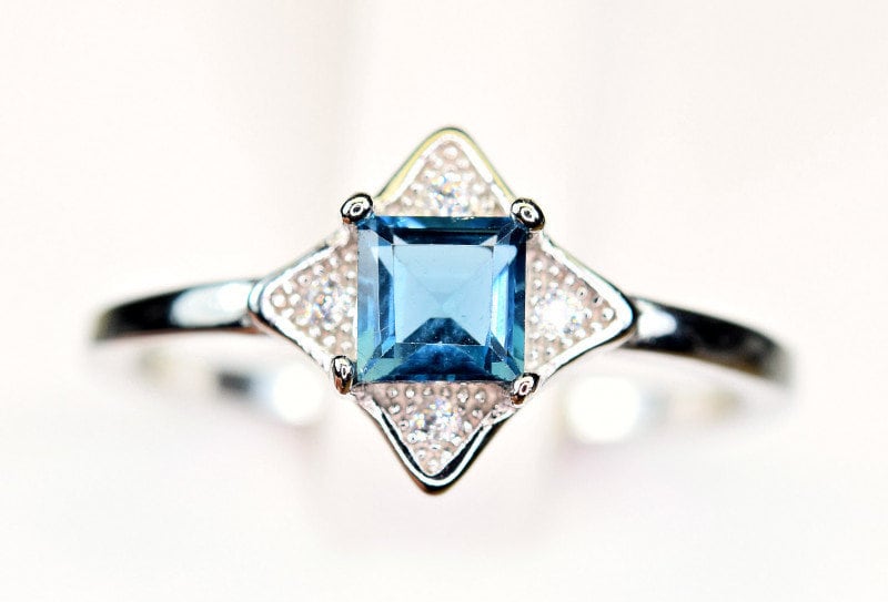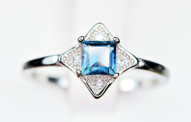 This ring is made of high-quality materials. The London Blue Topaz is natural and only treated with irradiation which is industry standard for all blue topaz to achieve the beautiful blue color. and the setting is made of solid 925 sterling silver. The small stones around the main stone are high quality cubic zirconia.
