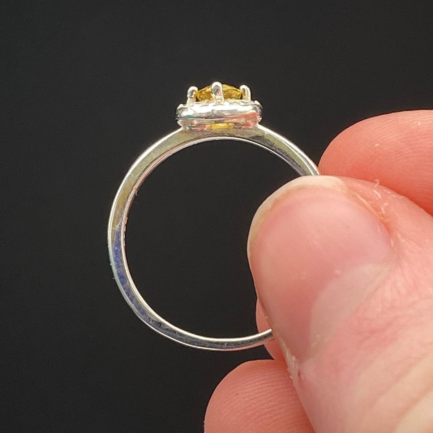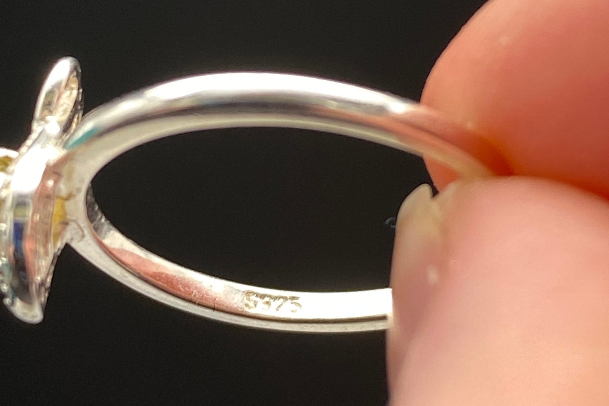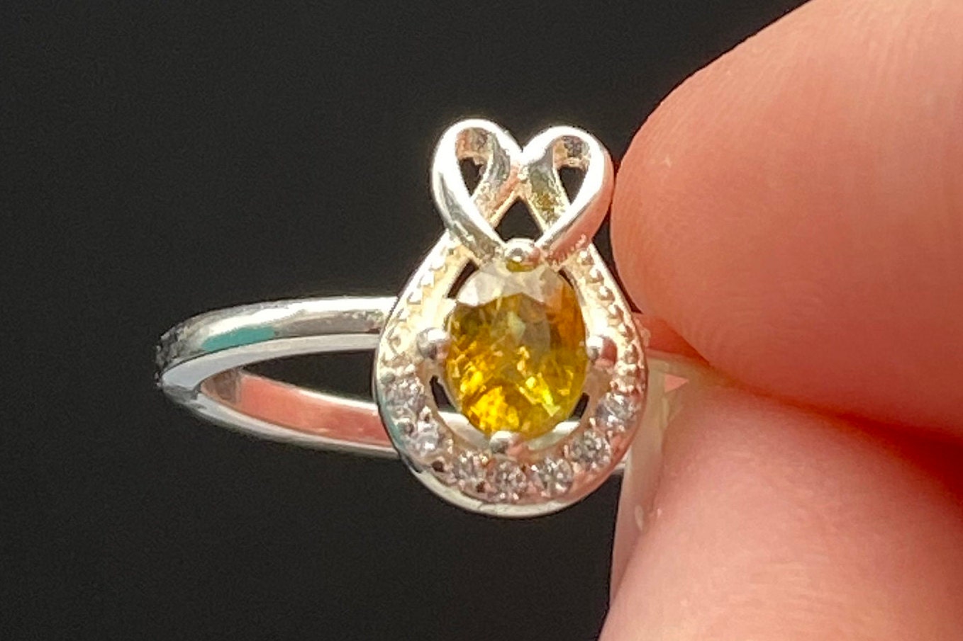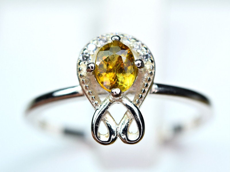 This ring is made of high-quality materials. The Sphene is natural and untreated and the setting is made of solid 925 sterling silver. The small stones around the main stone are high quality cubic zirconia.