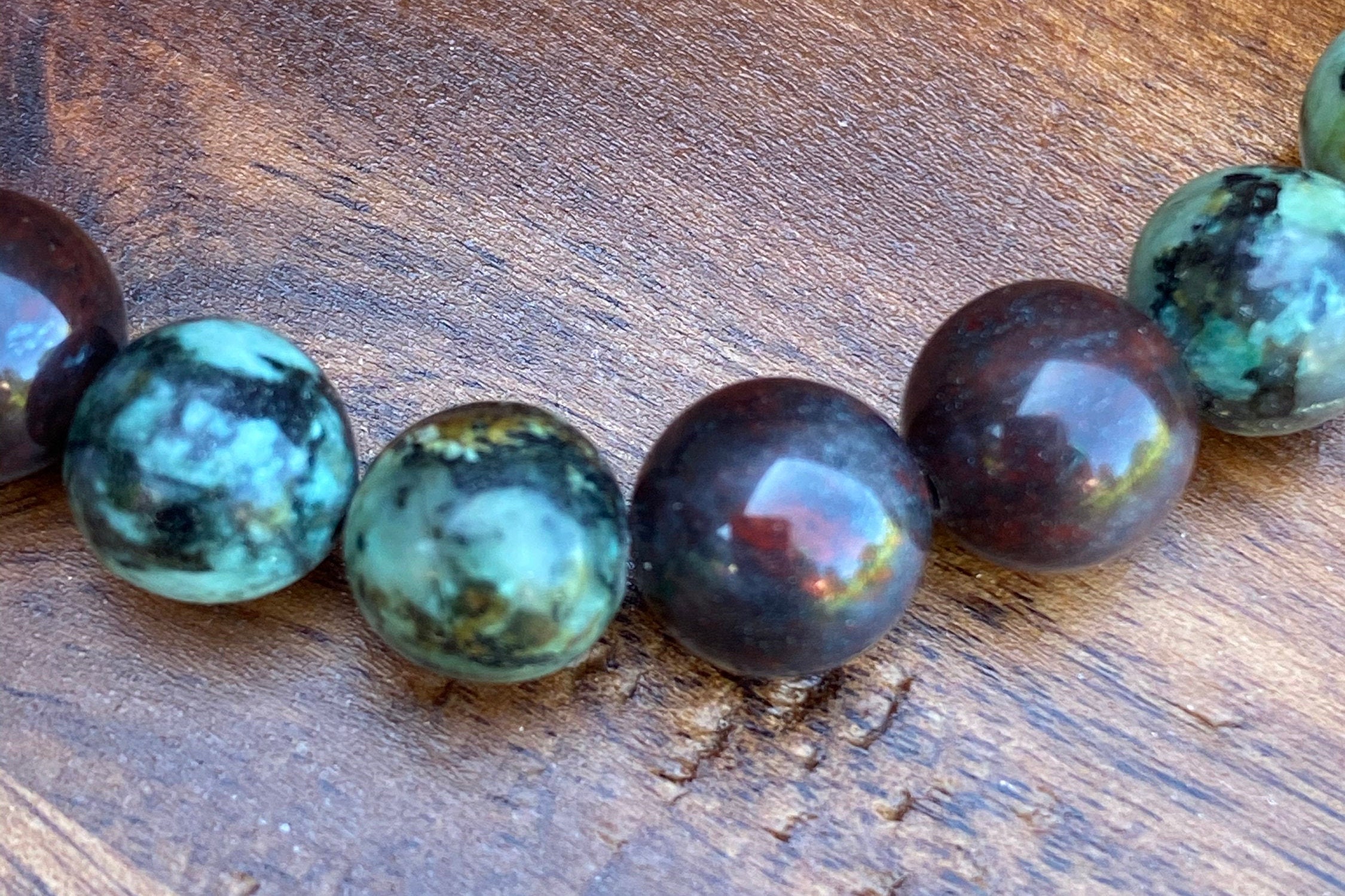 Poppy Jasper will bring your life vitality and cheerfulness, and it will remind you of your duty to humanity to be kind and compassionate. Poppy Jasper will promote activity, enthusiasm, and dynamic energy in your life. It will increase your inner strength and mental fortitude to help you with life�??s daily challenges. African Turquoise encourages growth and development and fosters positive change from within. It opens the mind to new ideas and endless possibilities. African Turquoise is a stone that inspires structure and balance and it pushes one to use the knowledge they already possess, while also enlightening one to the wisdom of others to help one become a better person. African Turquoise is believed to help ease mood swings, encourage acceptance and soothe feelings of emotional aggravation resulting in a more optimistic attitude towards life.