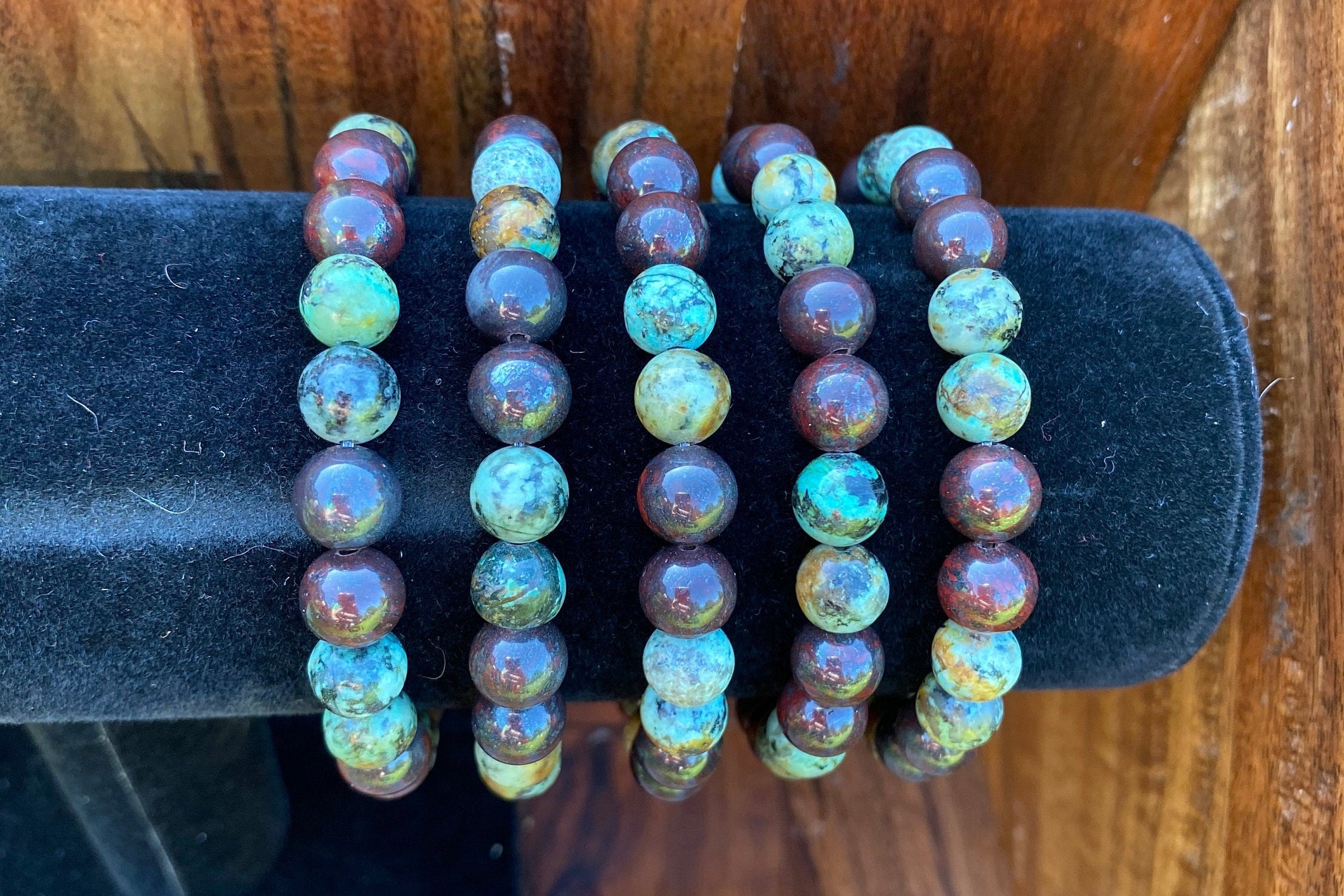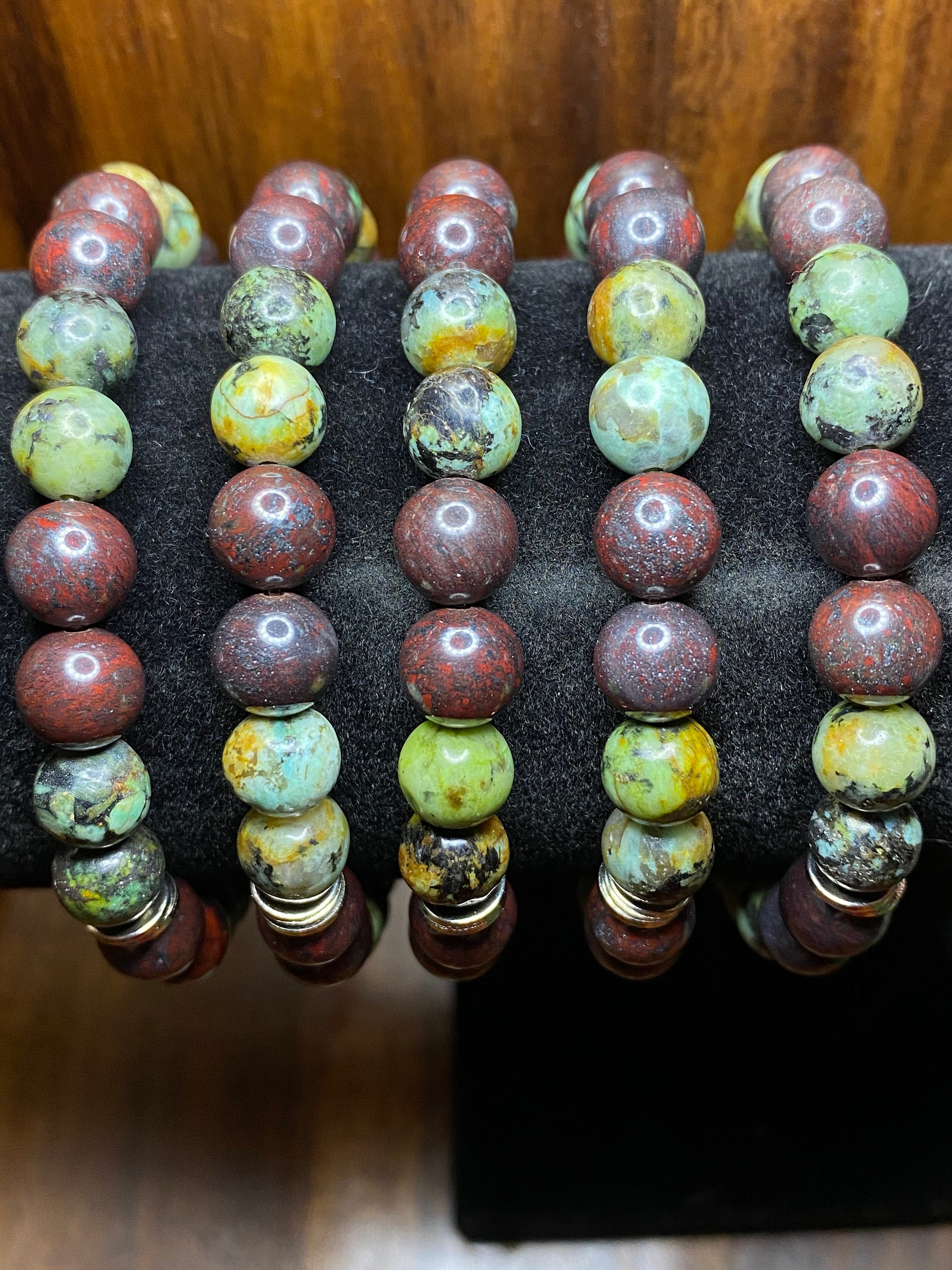 This Men�??s Poppy Jasper and African Turquoise Bracelet was specifically designed to help balance the body both emotionally and physically. I choose to use 8mm size beads for the perfect match between comfort and beauty.