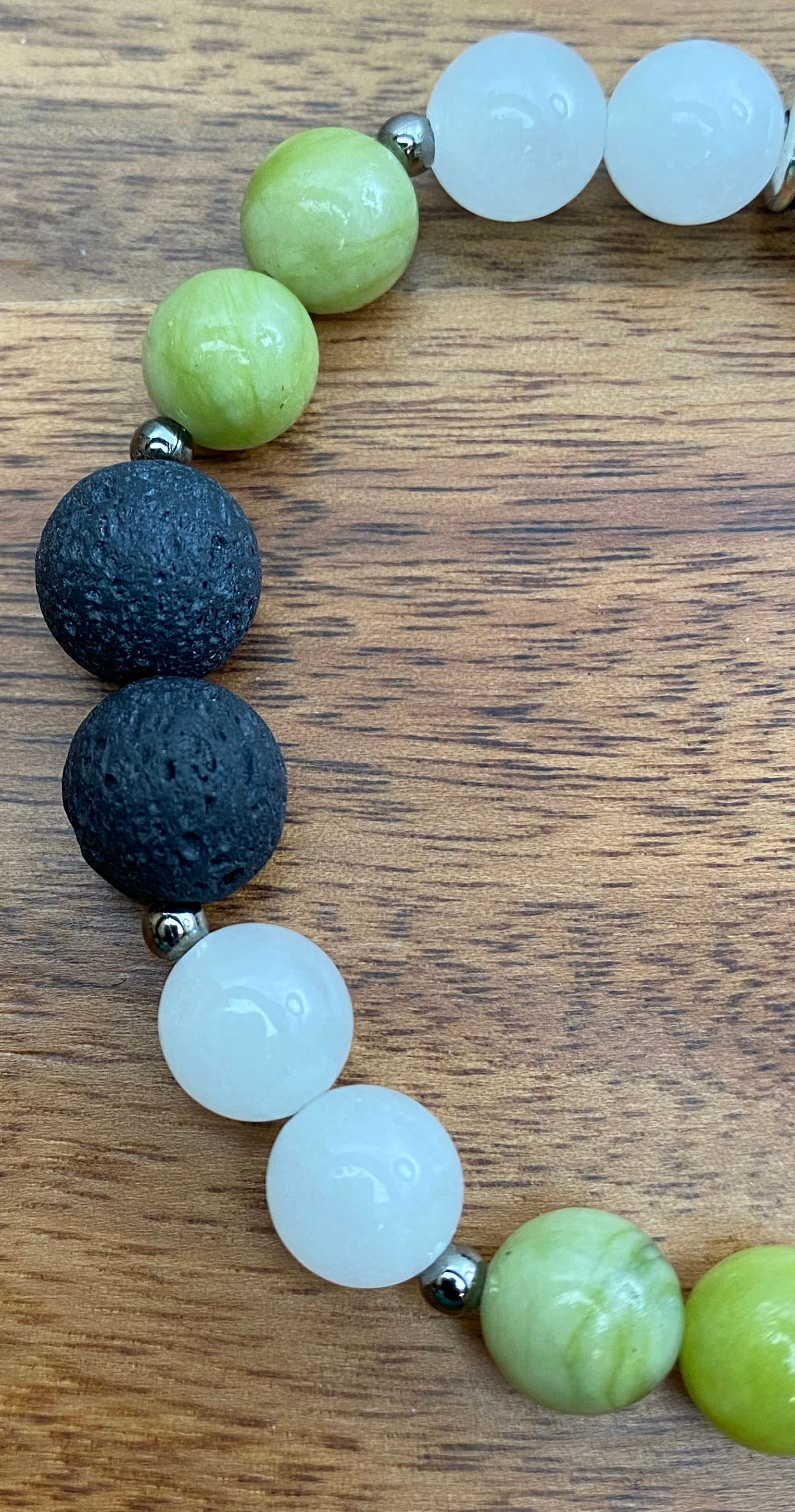 This wonderful green jade, quartz crystal, and lava stone bracelet invigorates the wearer with bronze spacer beads. Jade has long been heralded for it's empowering and regal nature. When paired with quartz, this unique bracelet is sure to help fortune and protection to it's blessed wearer.