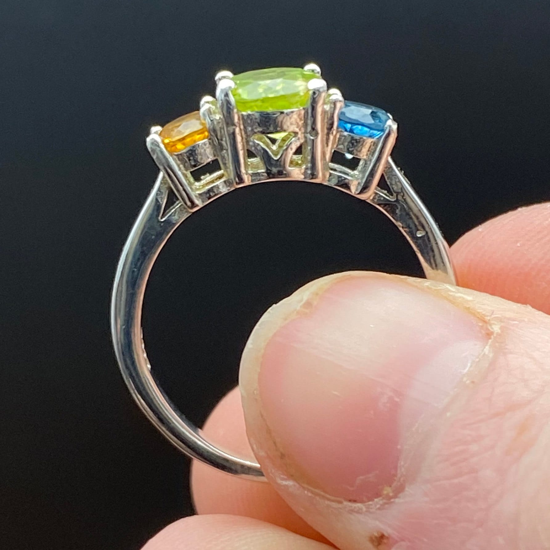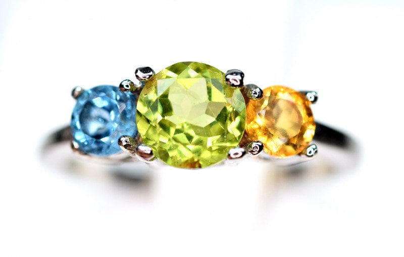 This ring is made of high-quality materials. The Peridot, Citrine & Topaz are natural and untreated (except for irradiation with is industry standard for all blue topaz) and the setting is made of solid 925 sterling silver.