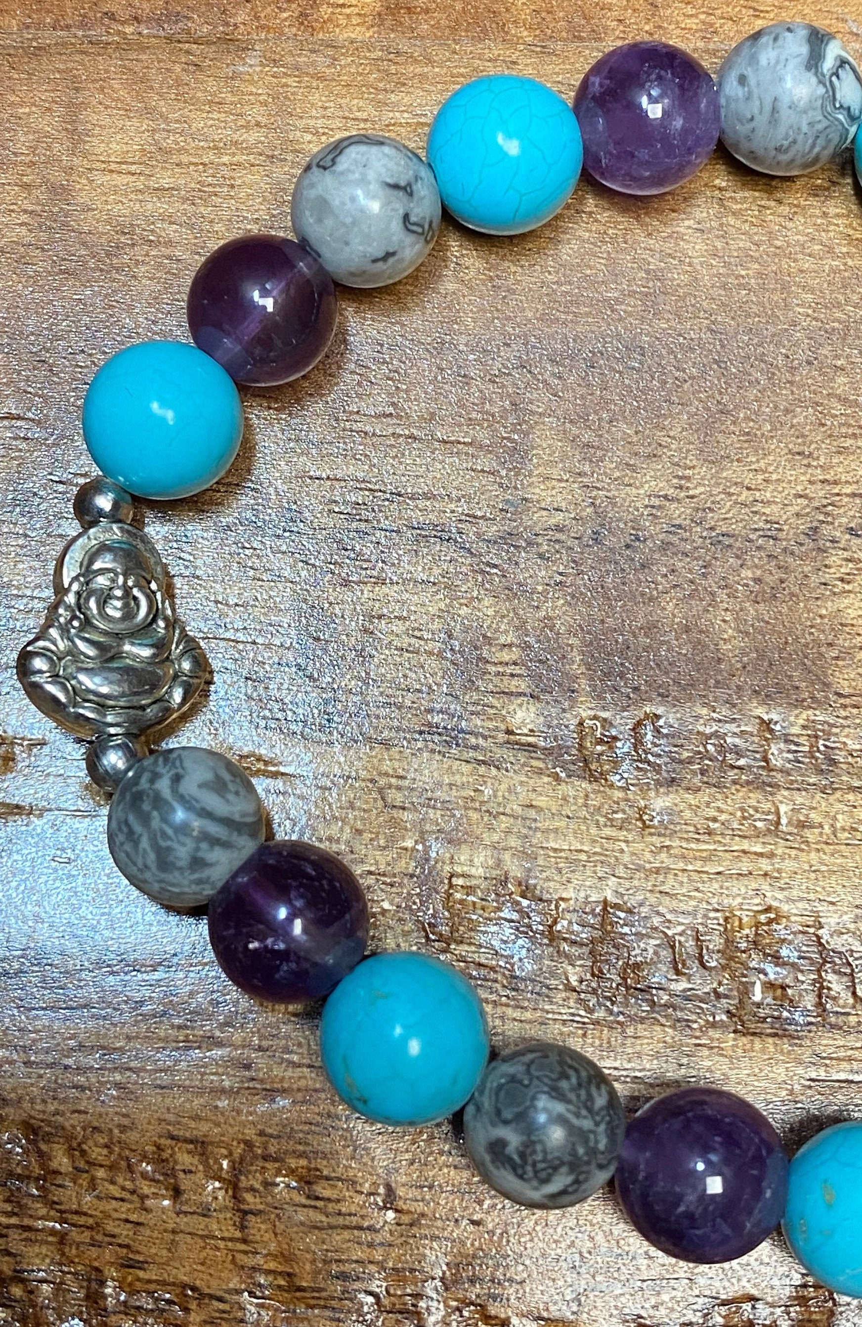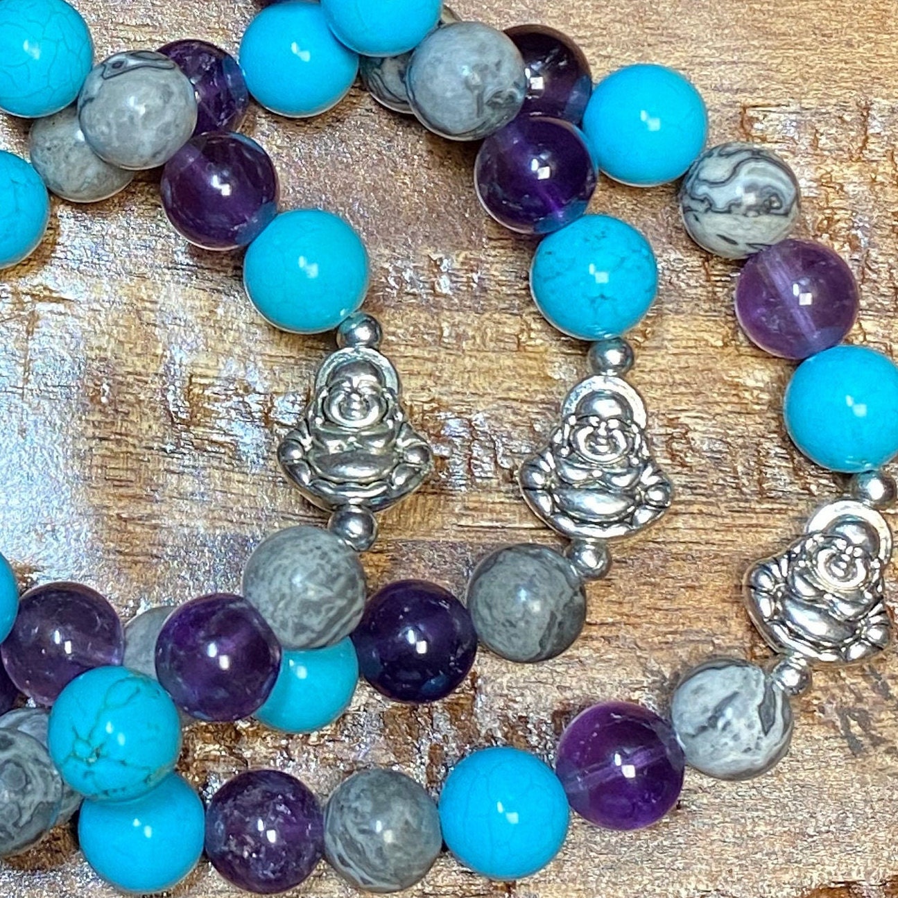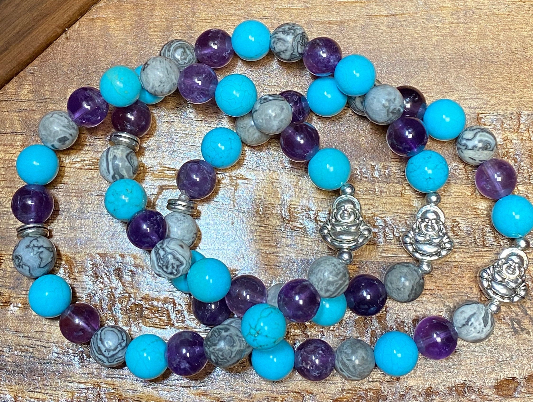 This Peaceful Amethyst, Map Jasper & Turquoise Bracelet w/ Buddha Charm was specifically designed to help balance the body both emotionally and physically. I choose to use 8mm beads for the perfect match between comfort and beauty. This bracelet is also accentuated with a silver �??Buddha�?� charm and silver spacers to enhance the the beauty of this bracelet.
