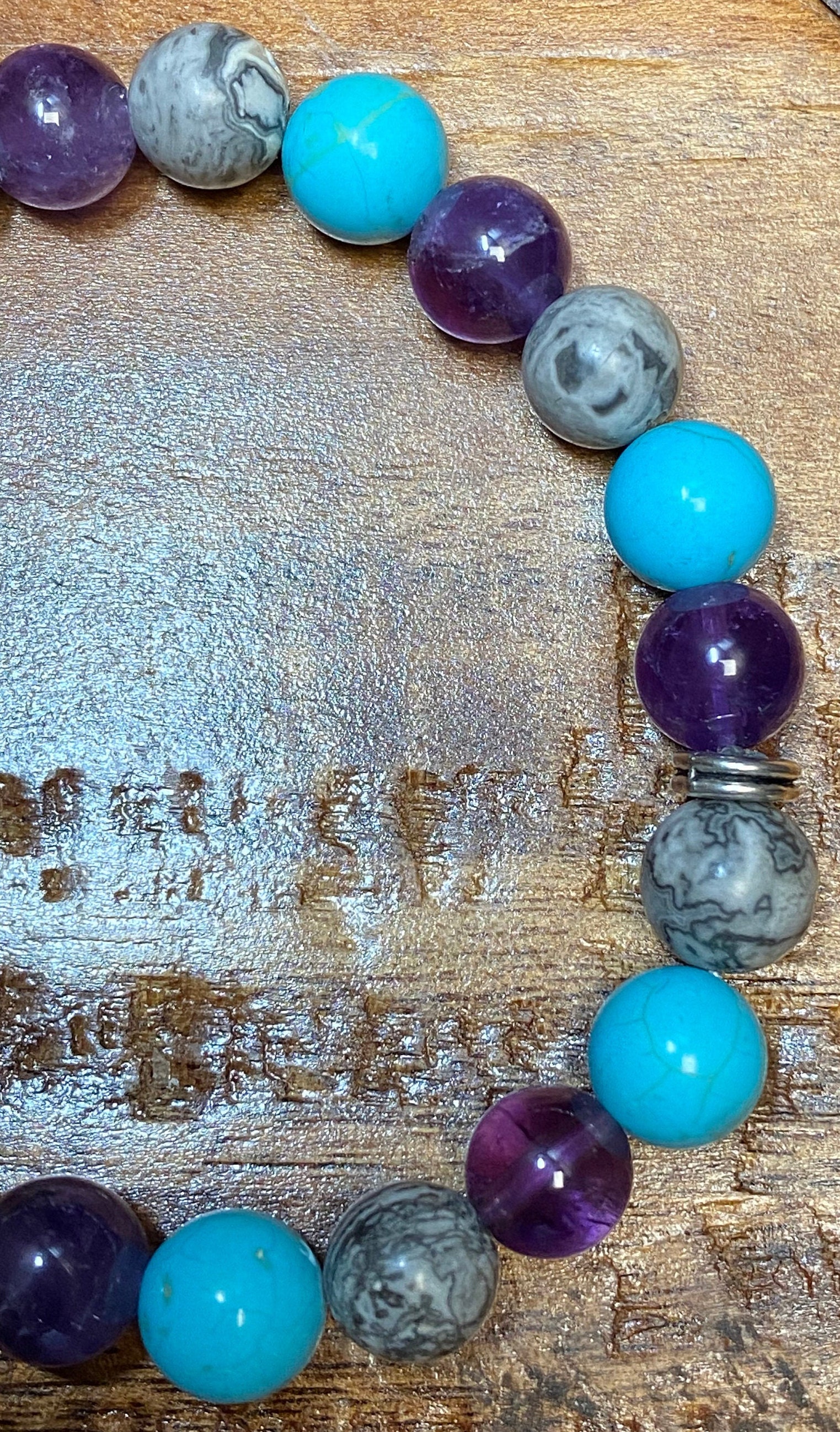 Amethyst has been used for its healing properties since ancient times, as well as to help combat negative feelings. Map Jasper is known for its remarkable ability to bring a sense of peace, patience and understanding to all with whom it connects. It will bring you peacefulness, happiness, and completeness. It will give your confidence a boost, and it will get rid of all your irrational fears. Jasper Stone has often be said to be associated with good blood flow, and with a sense of inner grounding. Turquoise serves to keep us mindful of the present moment while helping with self-expression and communication. It also enhances self-confidence and aids in relaxation. Physically, turquoise helps reduce inflammation, boosts the immune system and relieves acid reflux and heartburn.