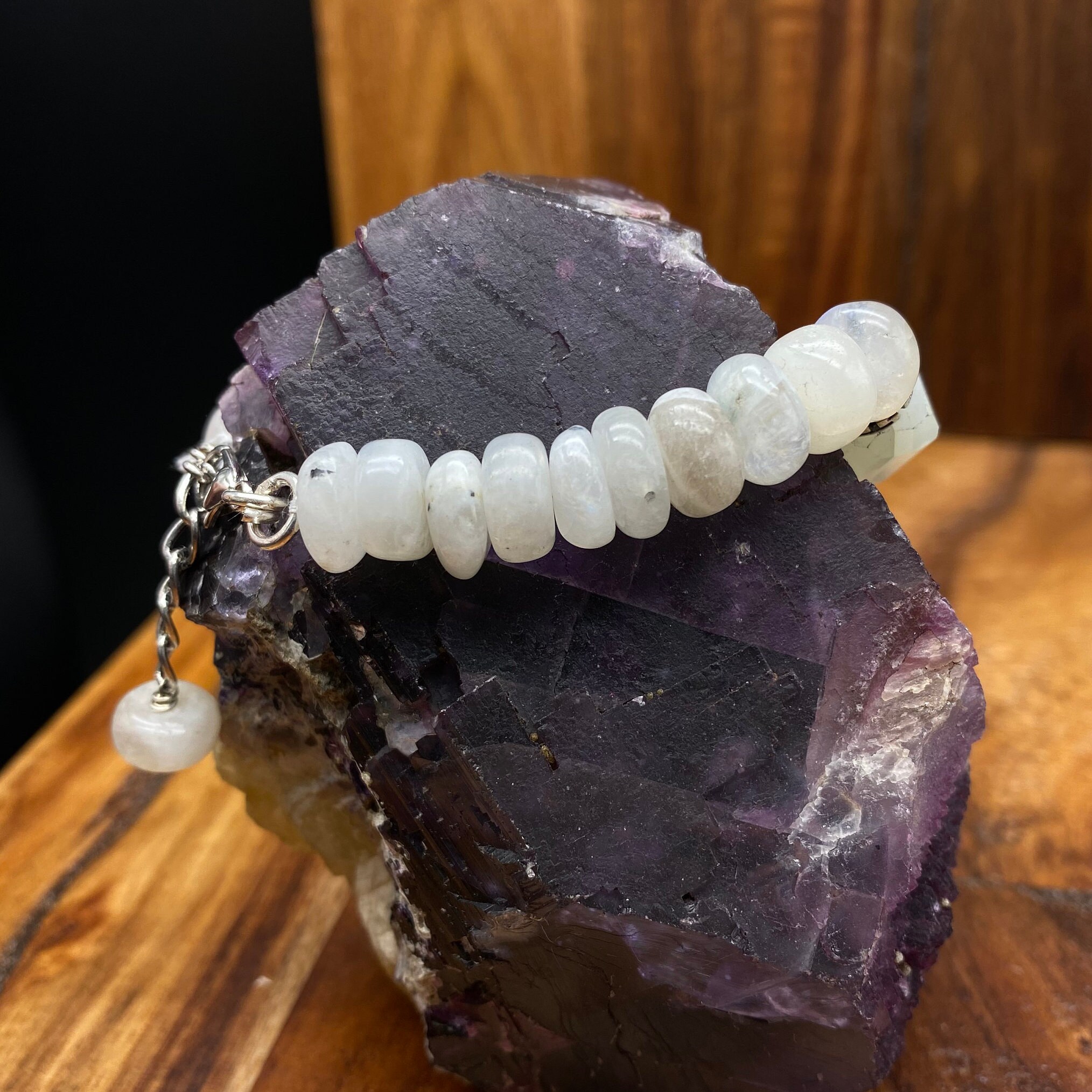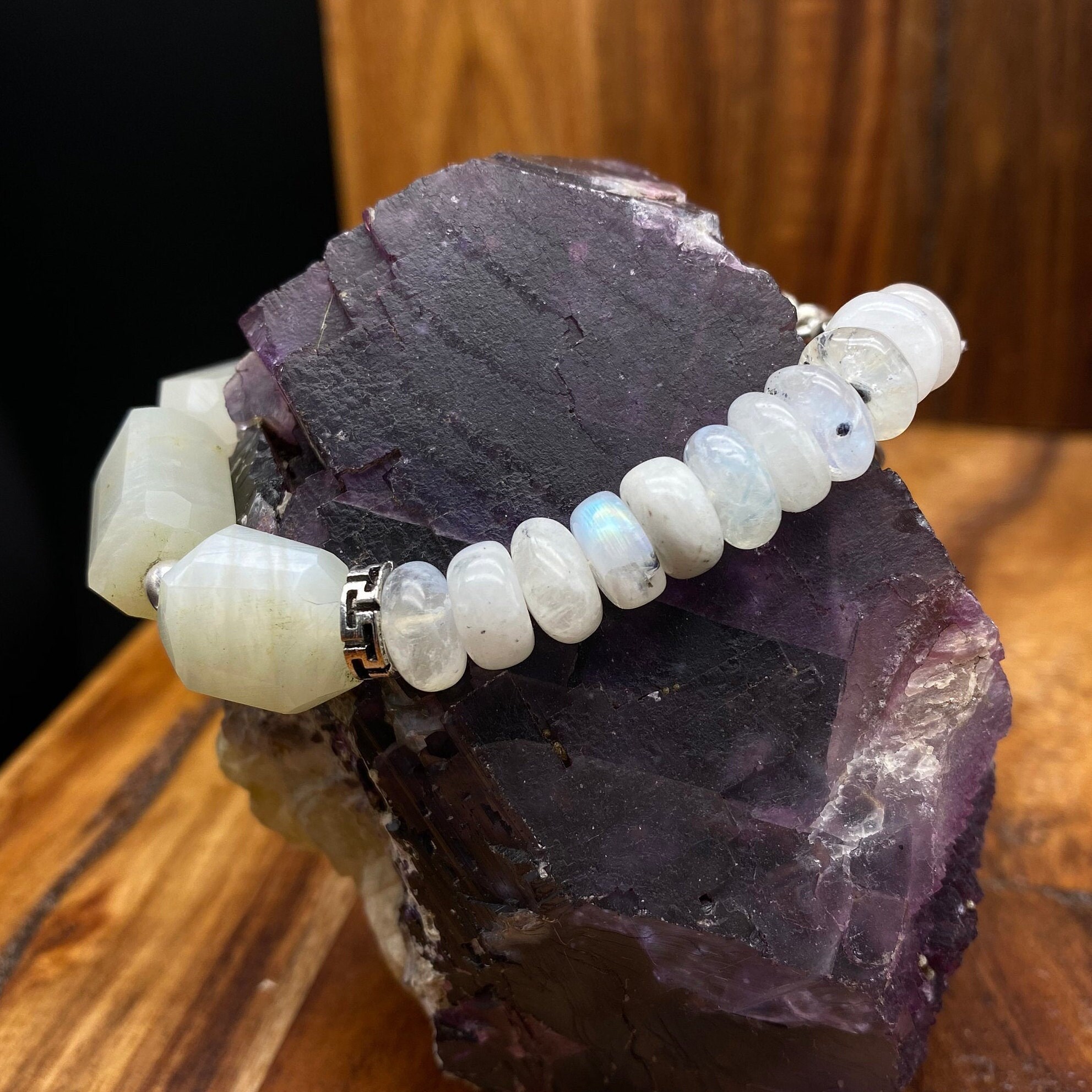 This bracelet is made of high-quality materials. The Moonstones are natural and untreated and the closure is made of solid 925 sterling silver. The accents are made of Tibetan silver.