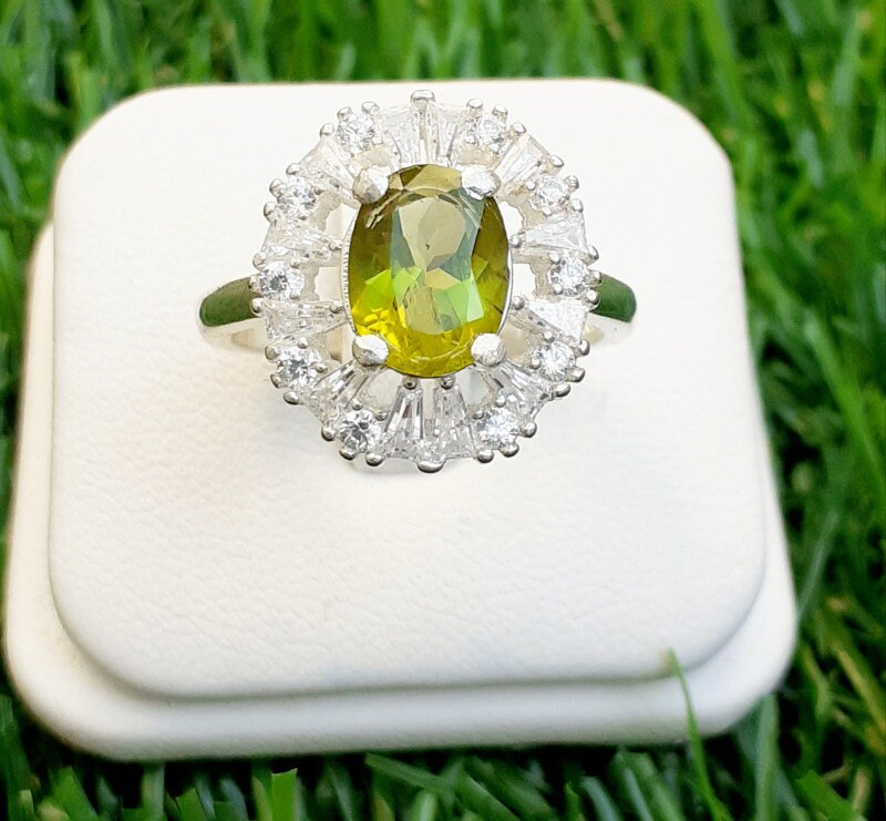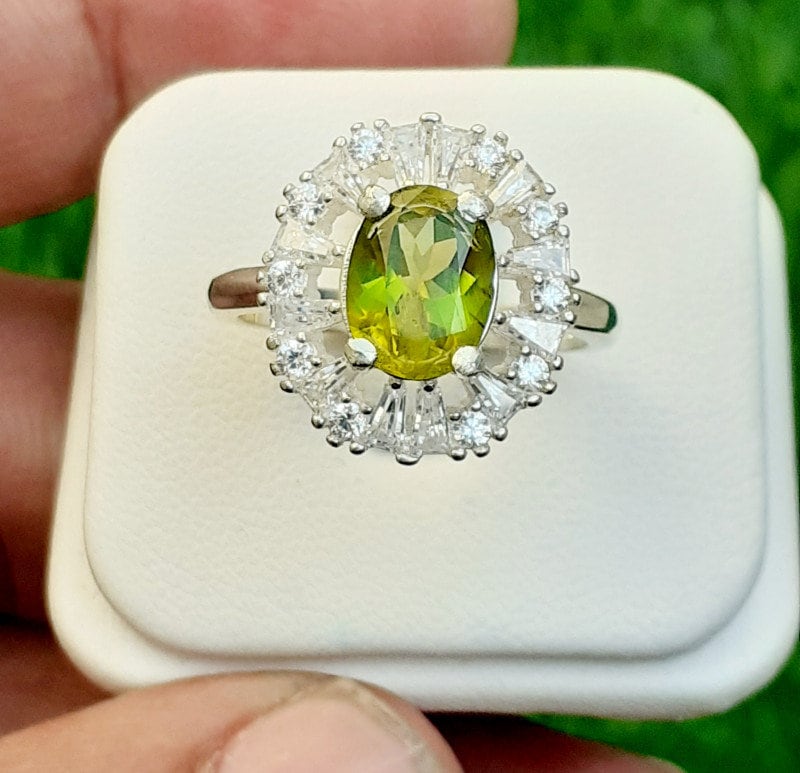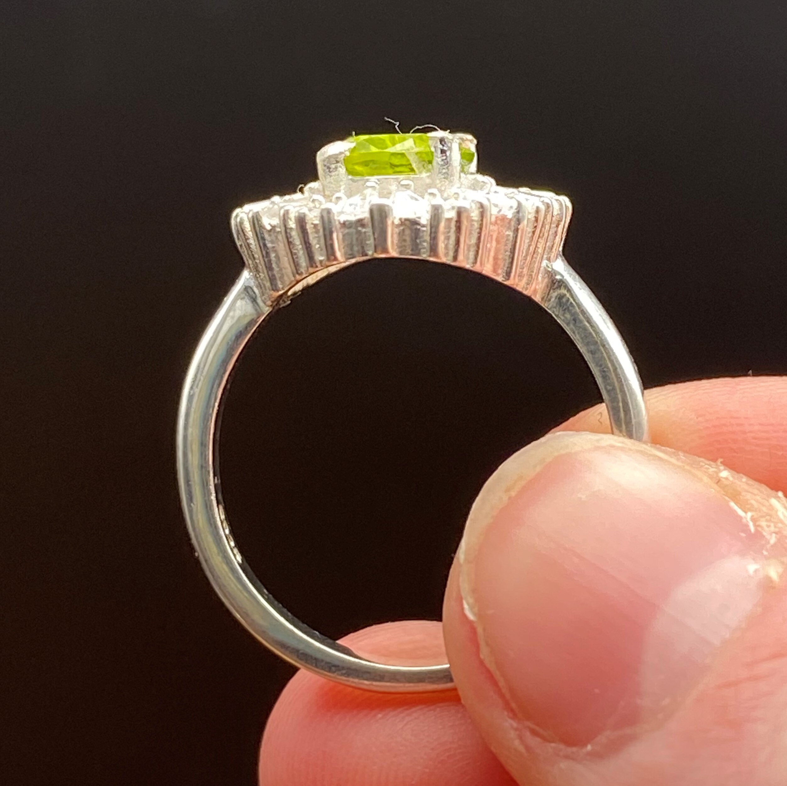 This ring is made of high-quality materials. The Peridot is natural and untreated and the setting is made of solid 925 sterling silver. The small stones around the main stone are high quality cubic zirconia.