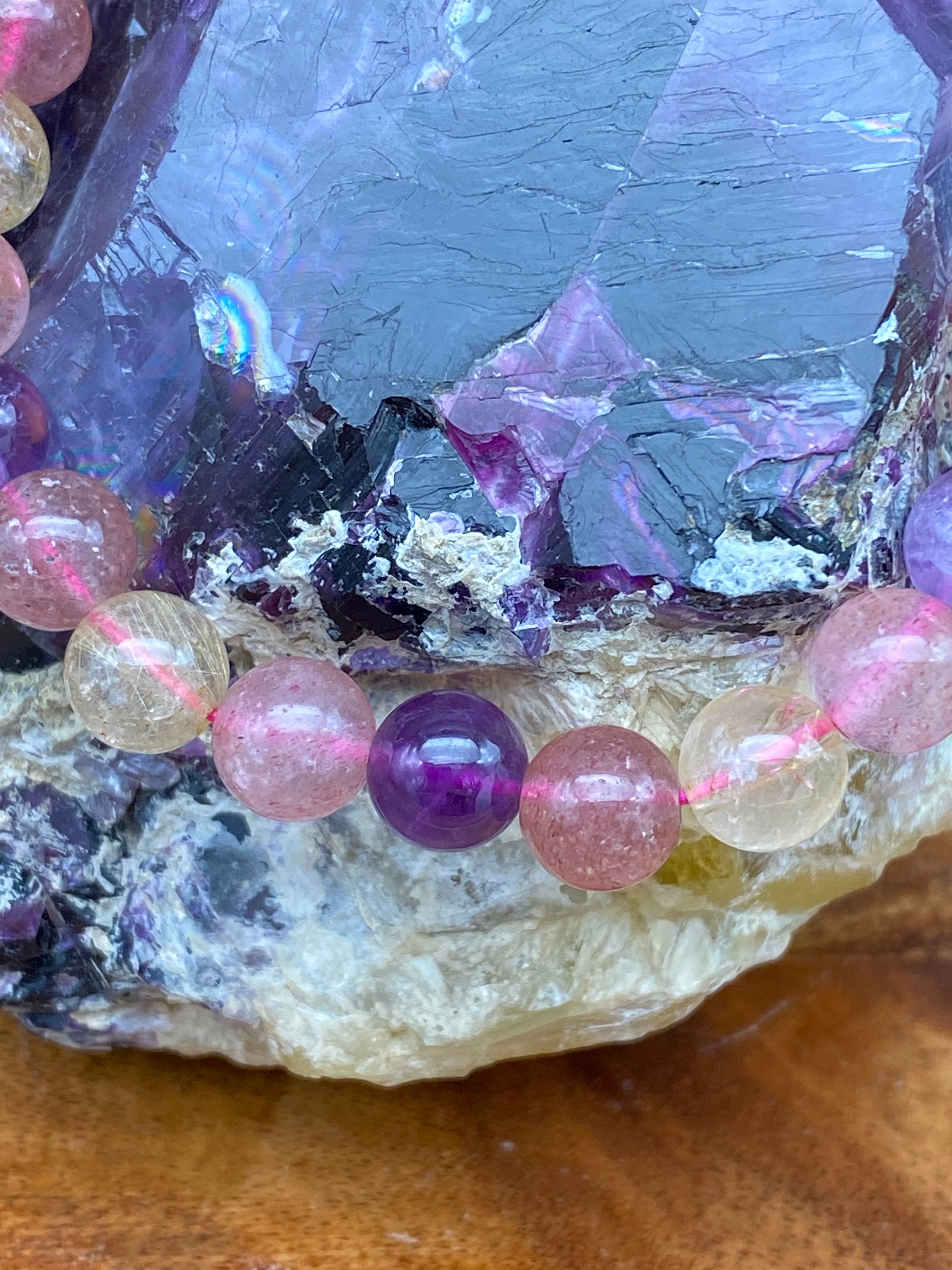 Super Seven, also known as Melody Stone or Sacred Stone, is an extremely rare mineral with seven crystals in one. The crystals are Amethyst, Cacoxenite, Goethite, Lepidocrocite, Rutile, Smoky Quartz, and Quartz (which all the minerals are usually naturally encased in).