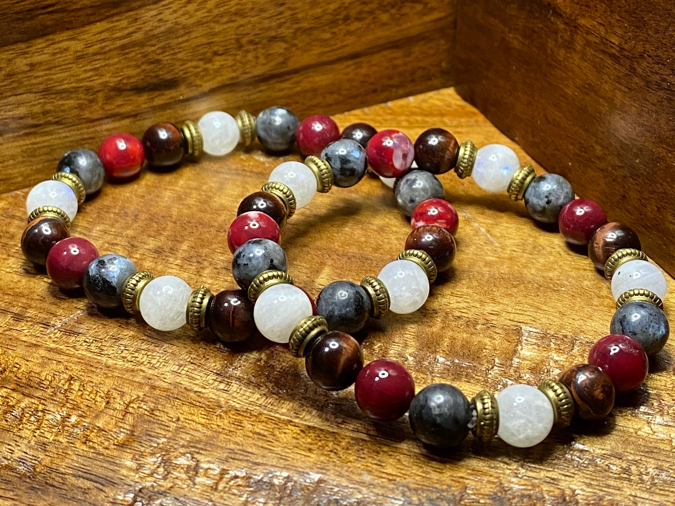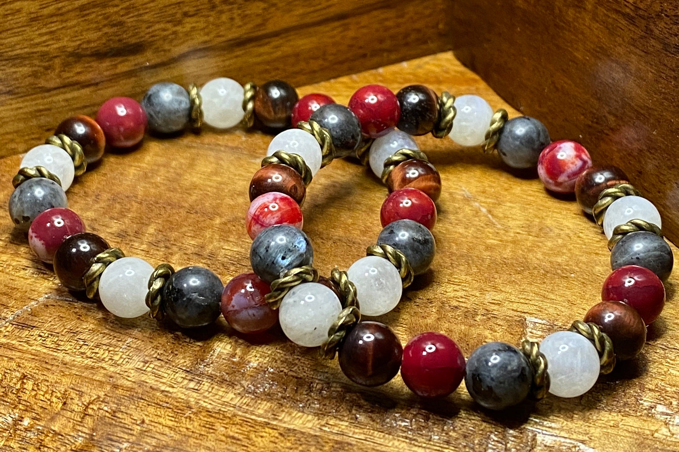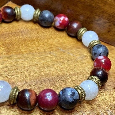 This Moonstone, Red Fire Agate, Red Tiger�??s Eye and Black Labradorite bracelet will bring health, healing, strength and power to all those looking for it during these rough times. I choose to use 8mm size bead for the perfect fit and the natural stone are accentuated the most beautiful bronze spacers.