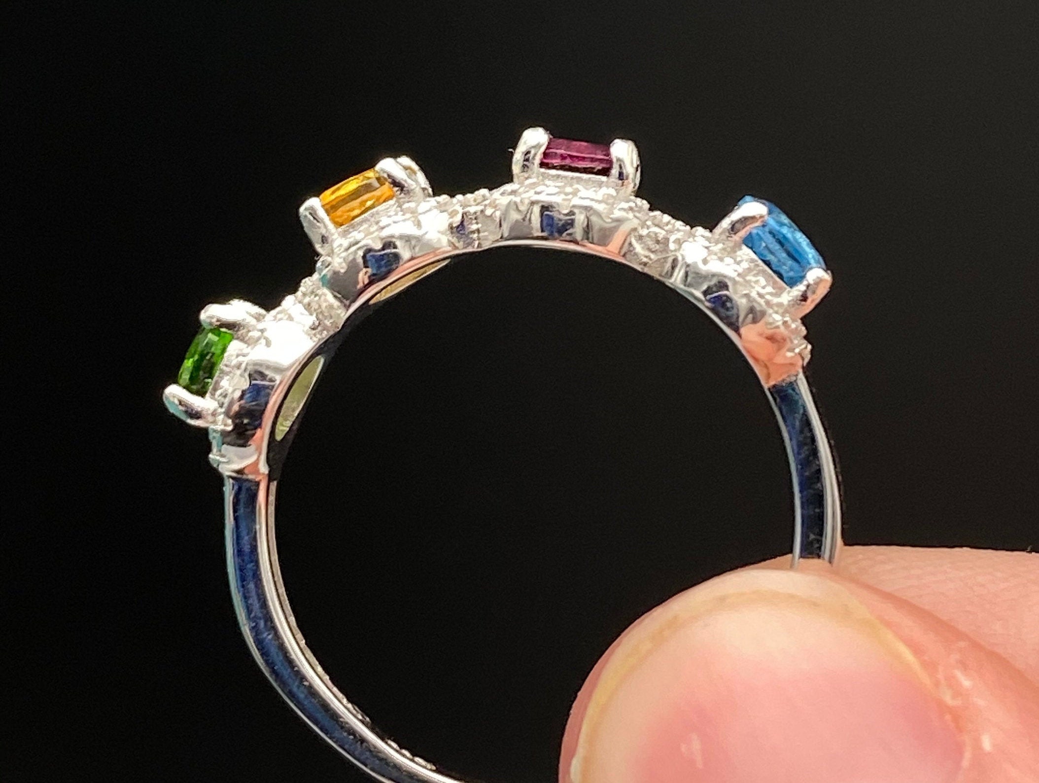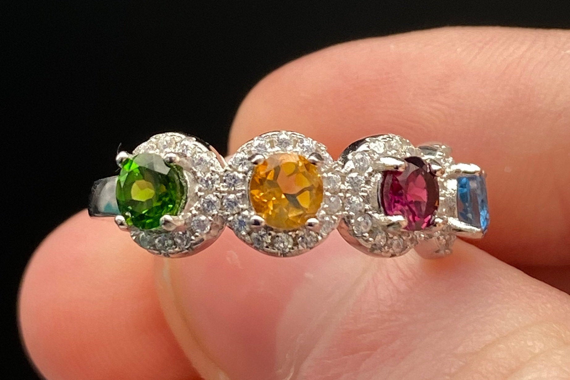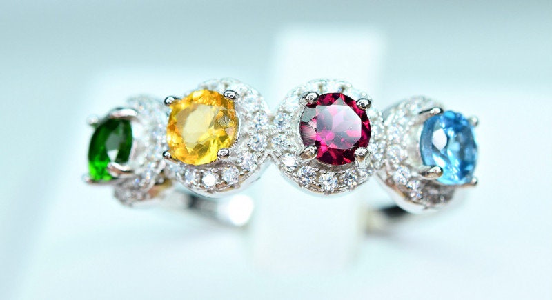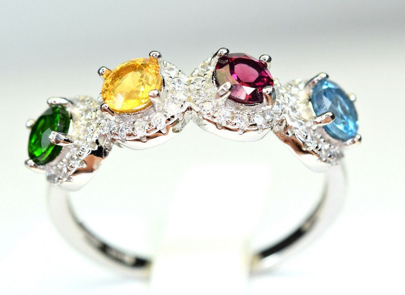 This ring is made of high-quality materials. The London blue Topaz, Citrine, Rhodolite Garnet, and Chrome Diopside are natural and untreated and the setting is made of solid 925 sterling silver. The small stones around the main stone are high quality cubic zirconia.