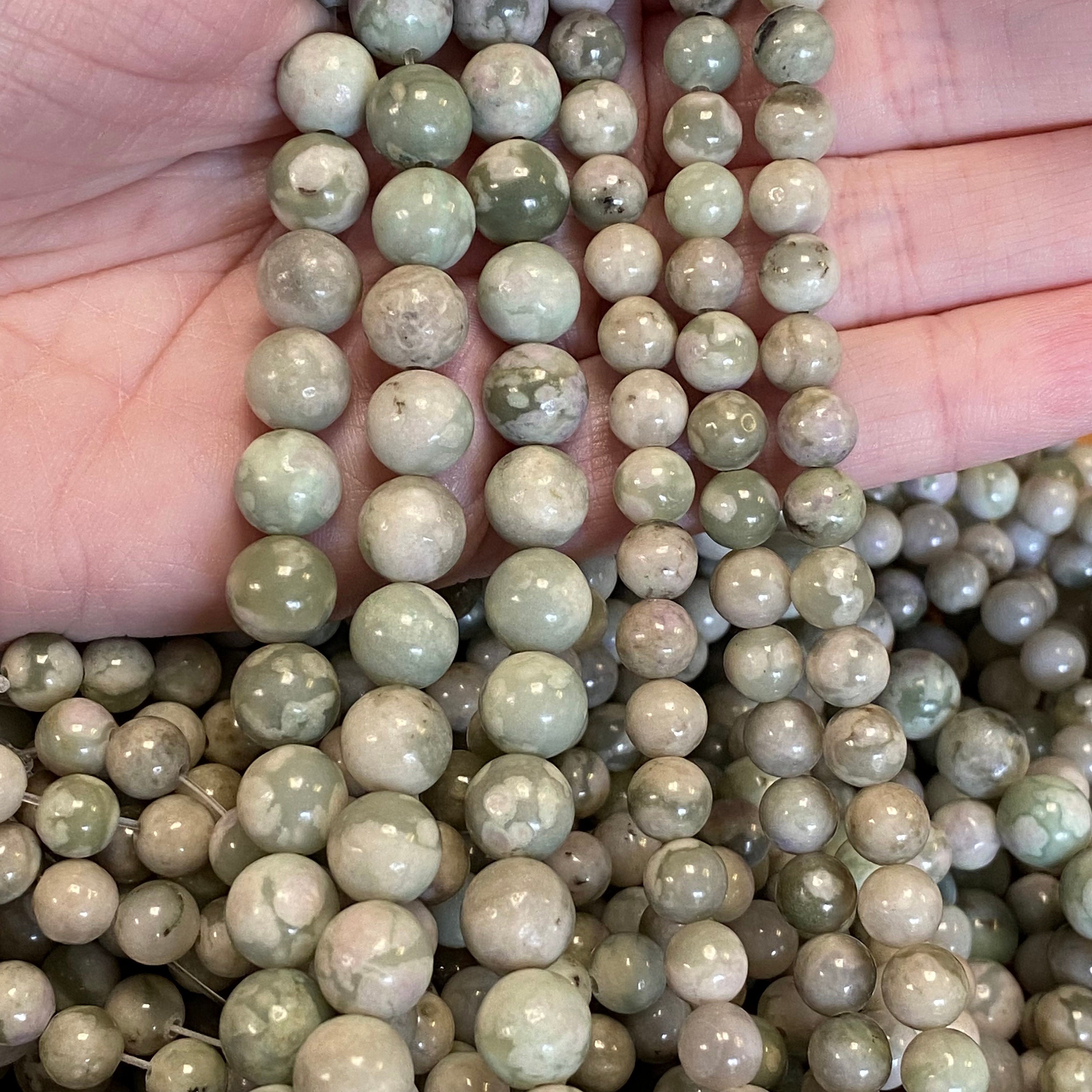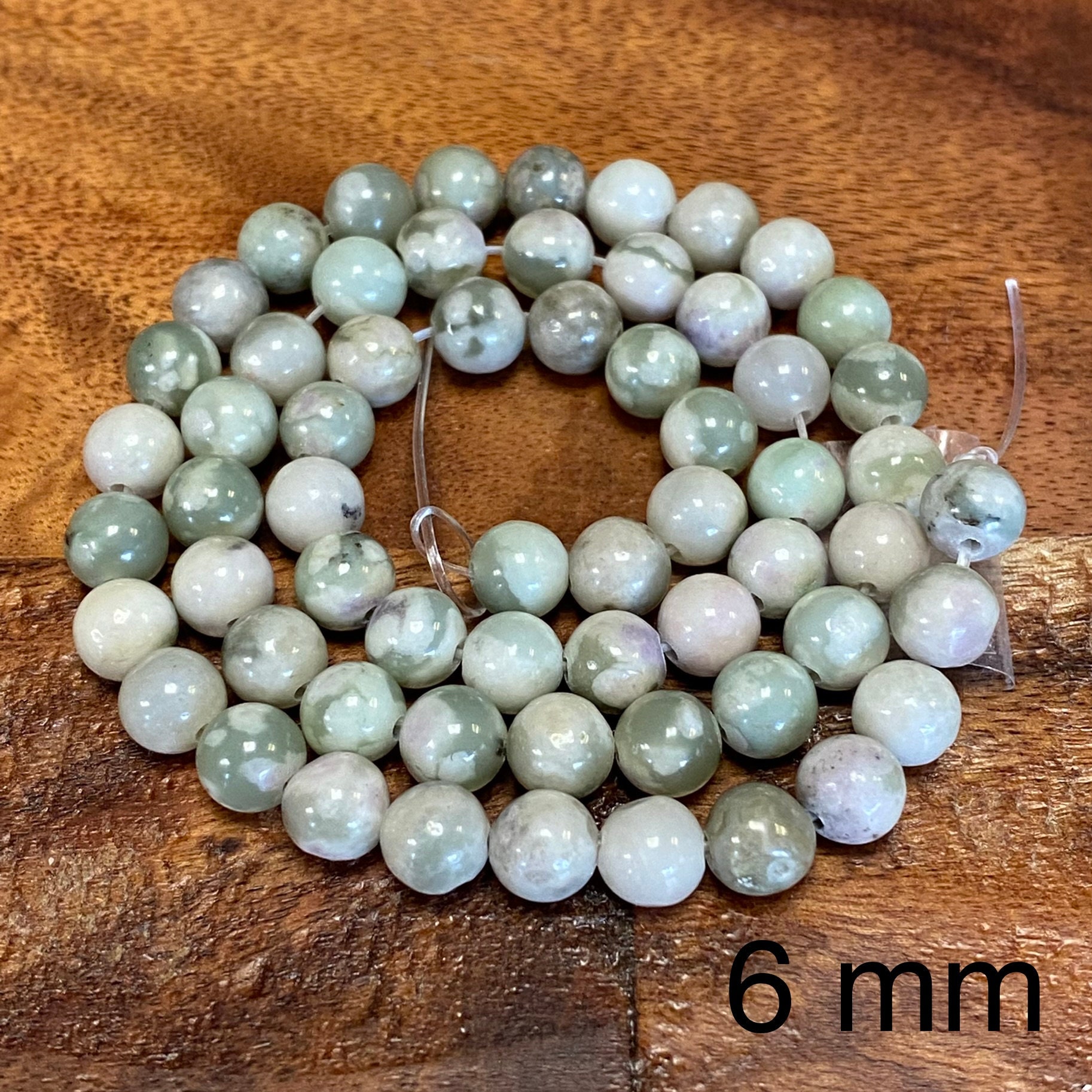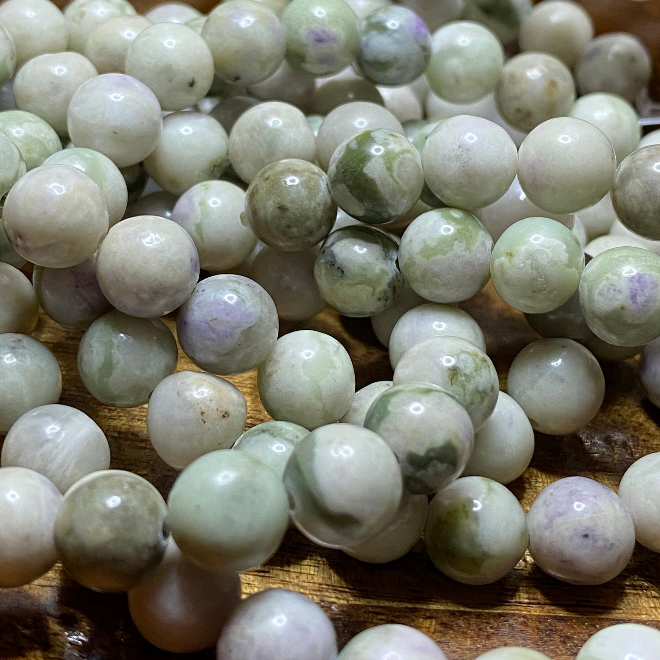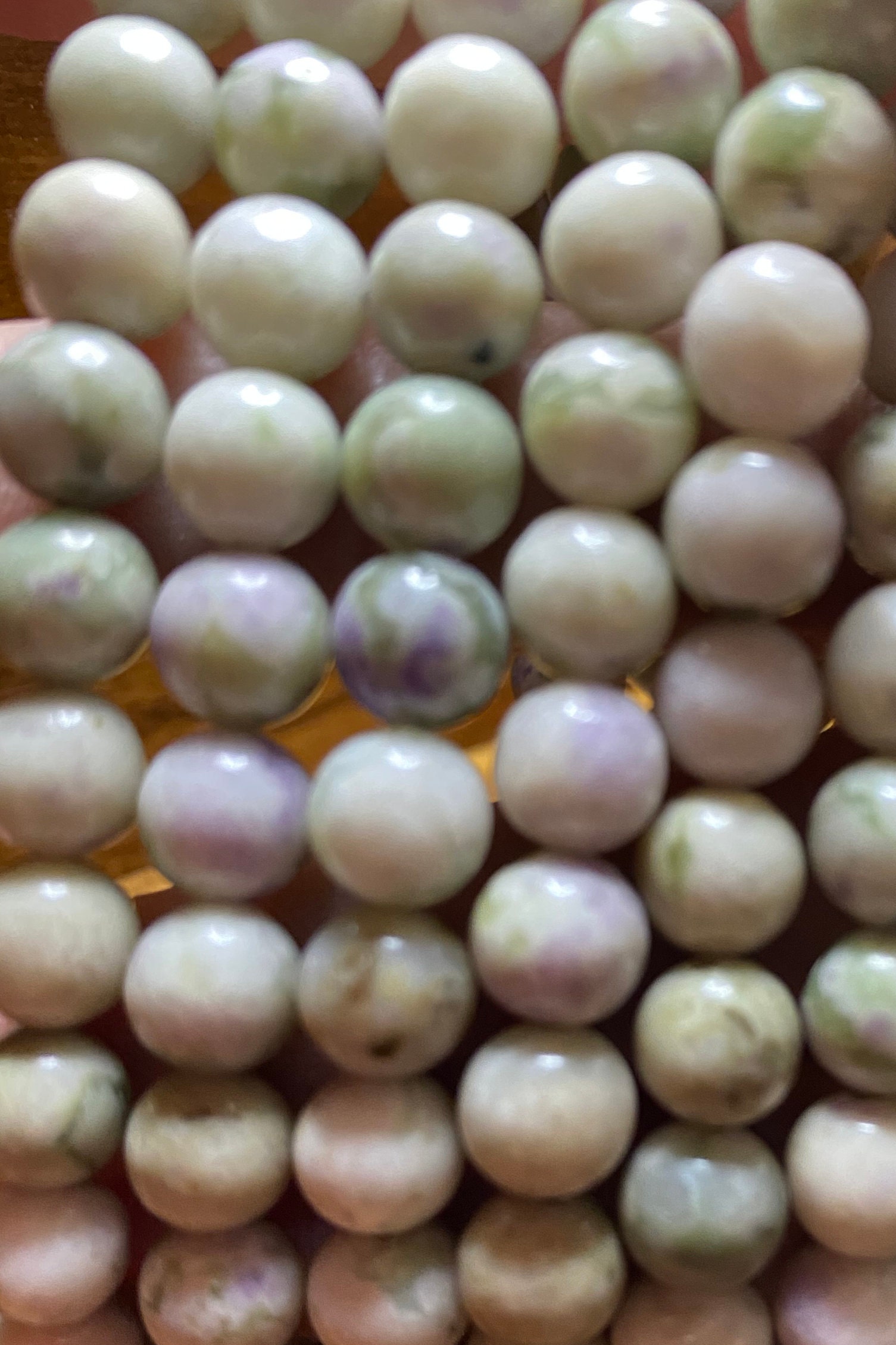 Peace Jade was named for the emotion each bead evokes - bringing forth tranquility and harmony. Peace Jade is a mix of green serpentine, lavender or pink stichtite, and white quartz.