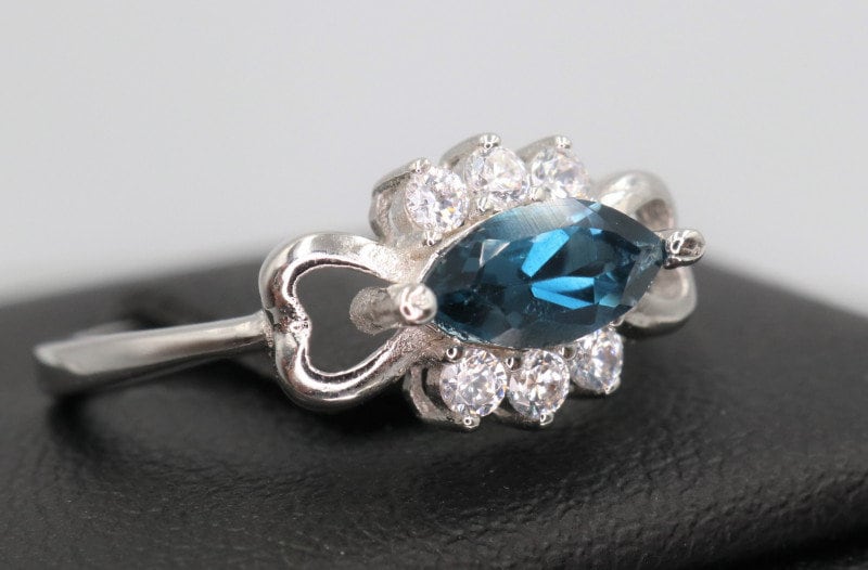 This ring is made of high-quality materials. The blue topaz is natural (it has been irradiated to get the blue color as is industry standard for all blue topaz) and the setting is made of solid 925 sterling silver. The small stones around the main stone are high quality cubic zirconia.