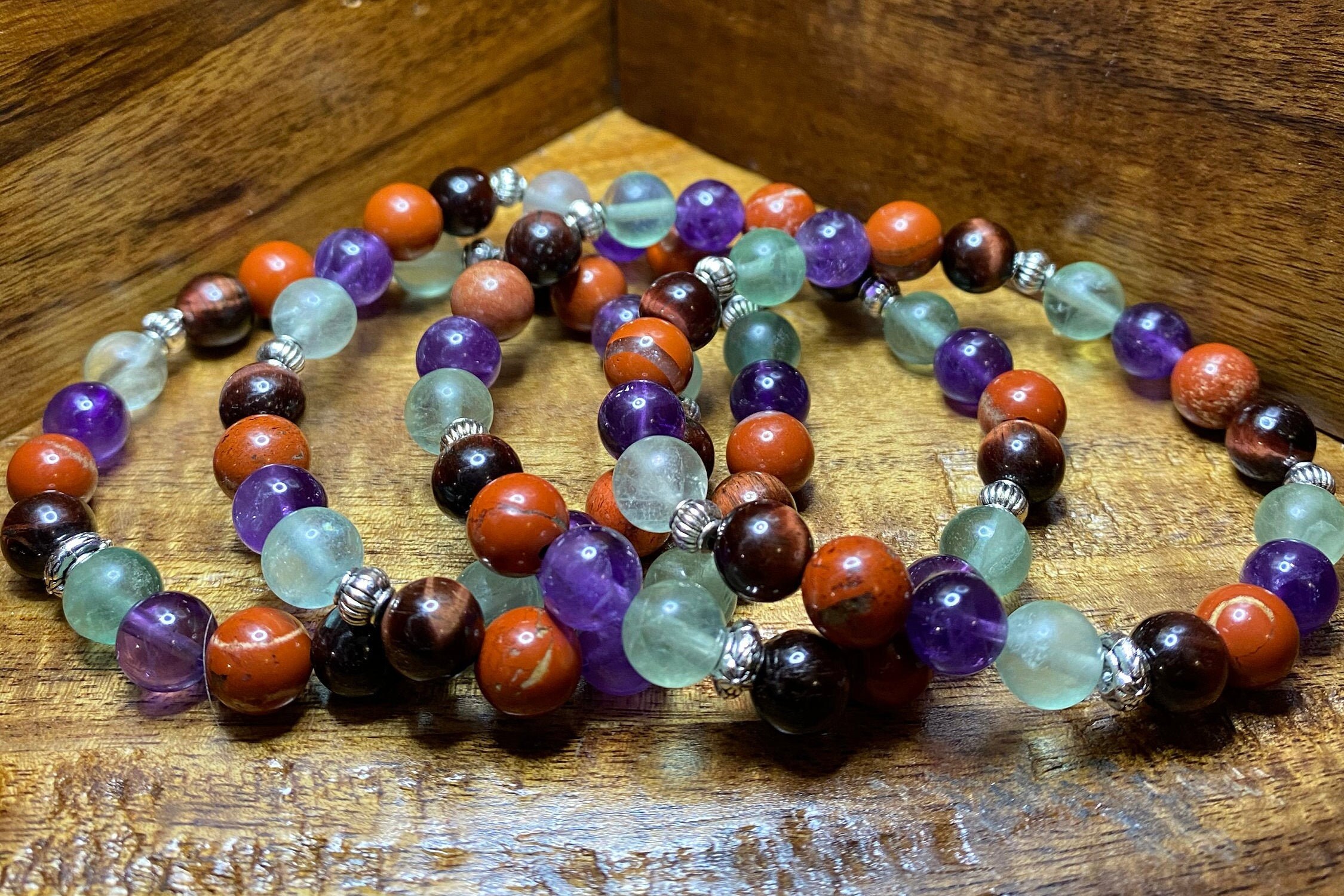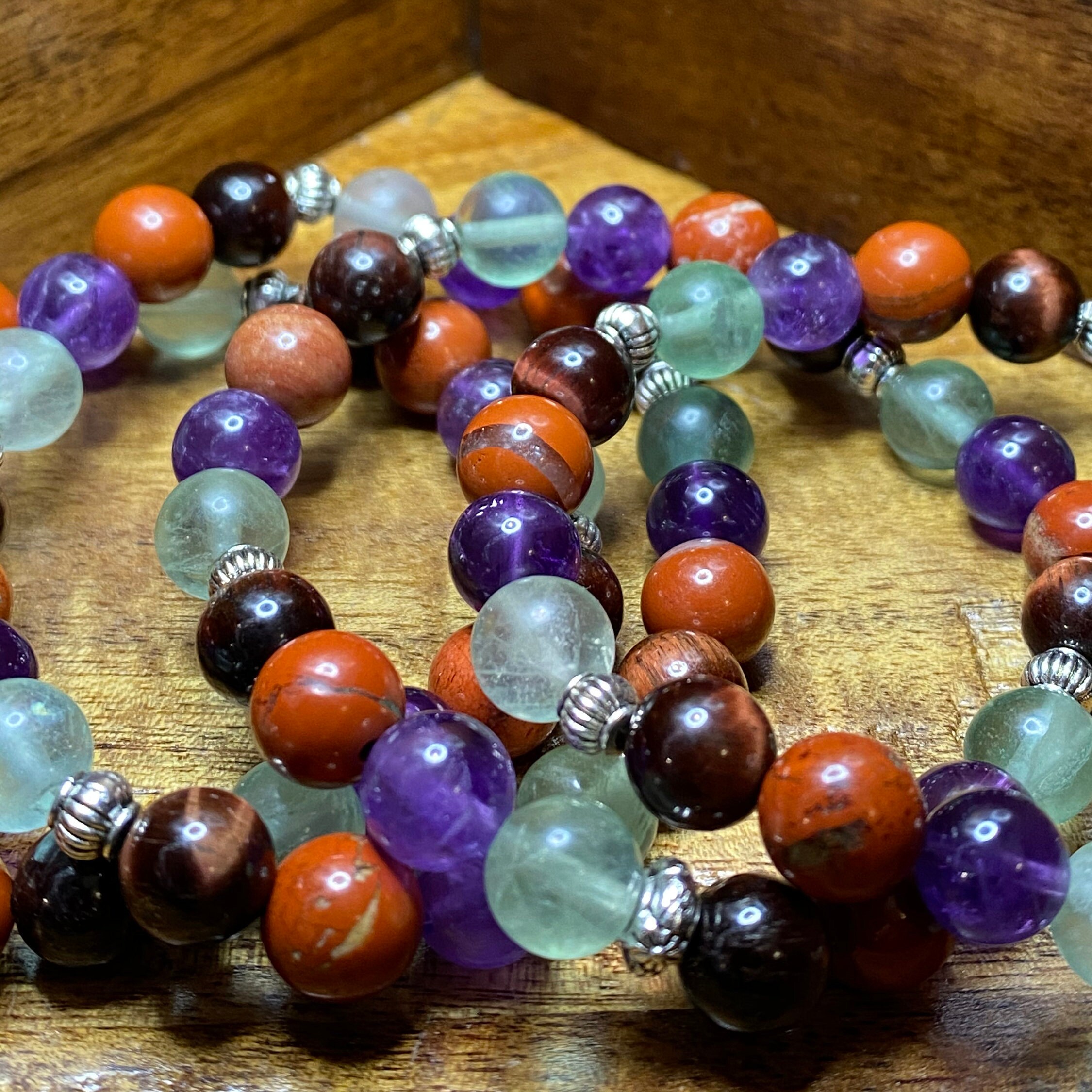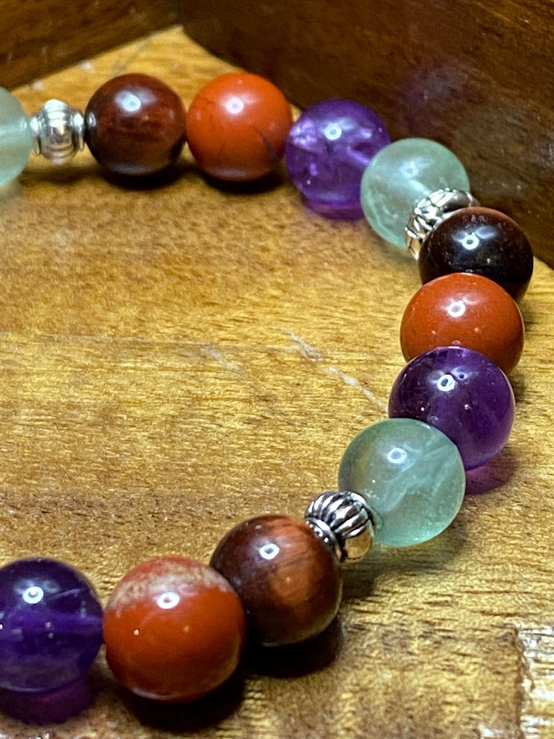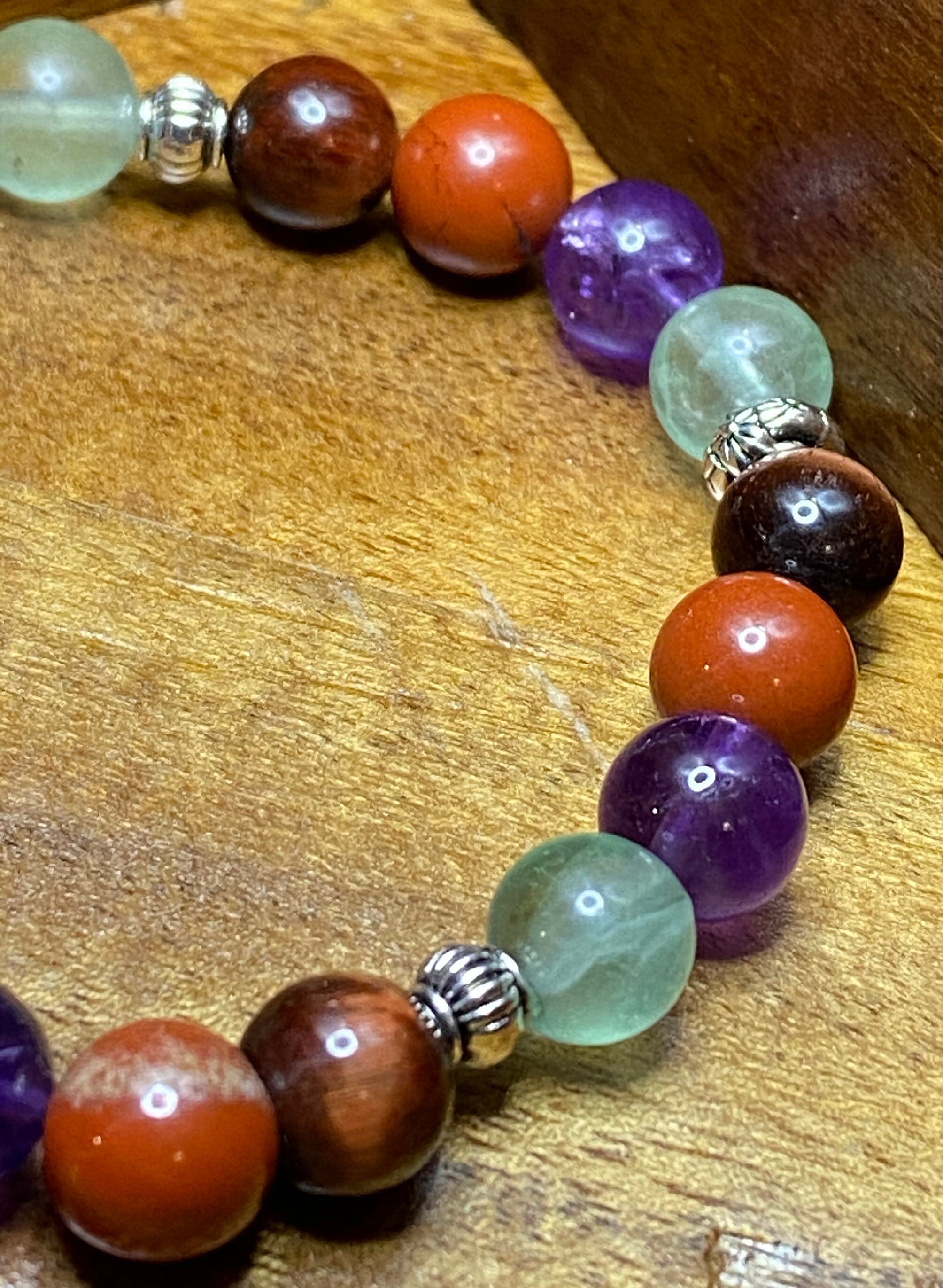 This Red Jasper, Fluorite, Amethyst and Tiger’s Eye bracelet will bring health, healing, strength and power to all those looking for it during these rough times. I choose to use 8mm size beads for the perfect fit and the natural stone are accentuated the most beautiful silver spacers.