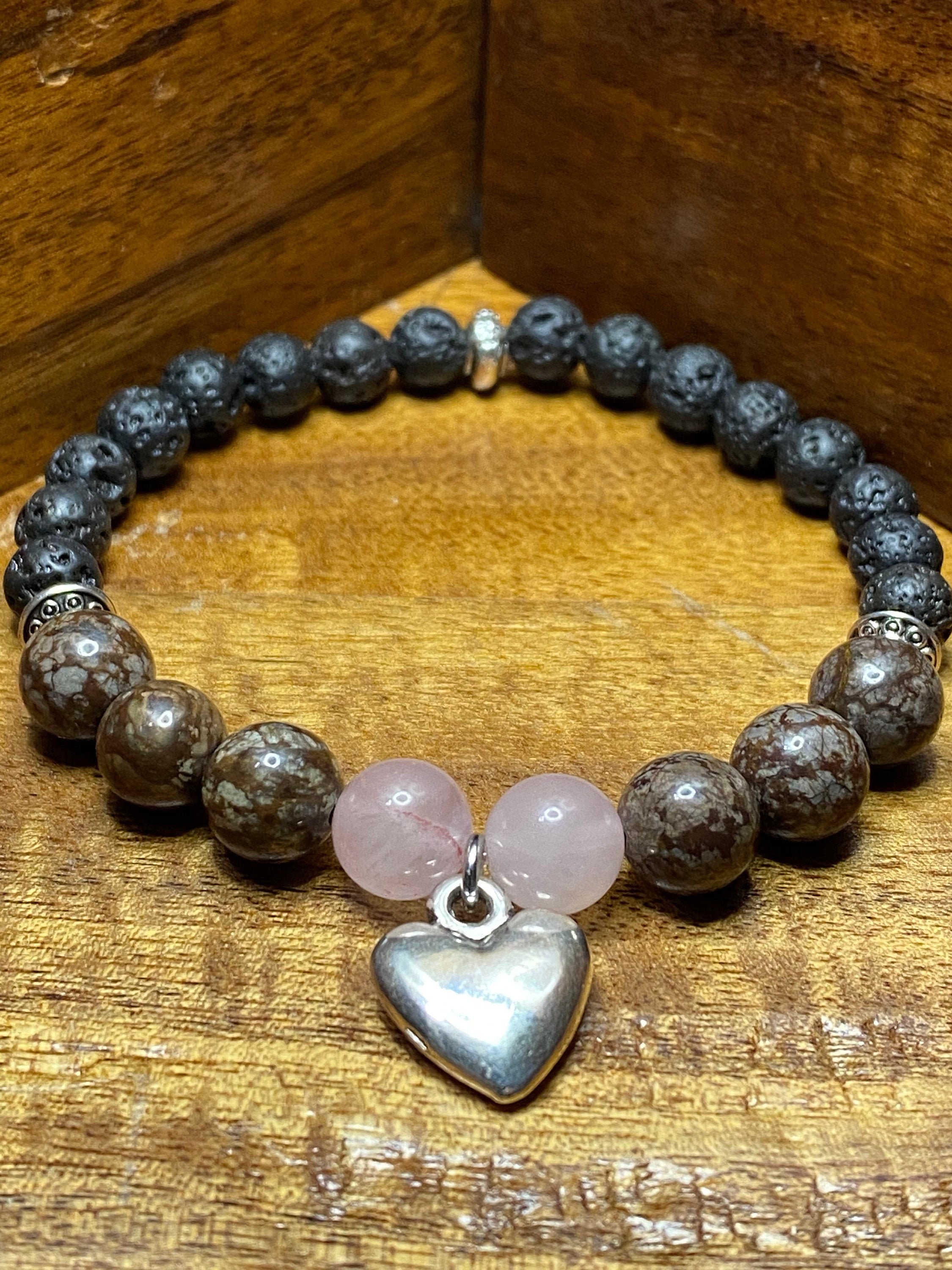 Rose Quartz, Brown Snowflake Obsidian & Lava Rock Bracelet w/ a Silver Heart Charm