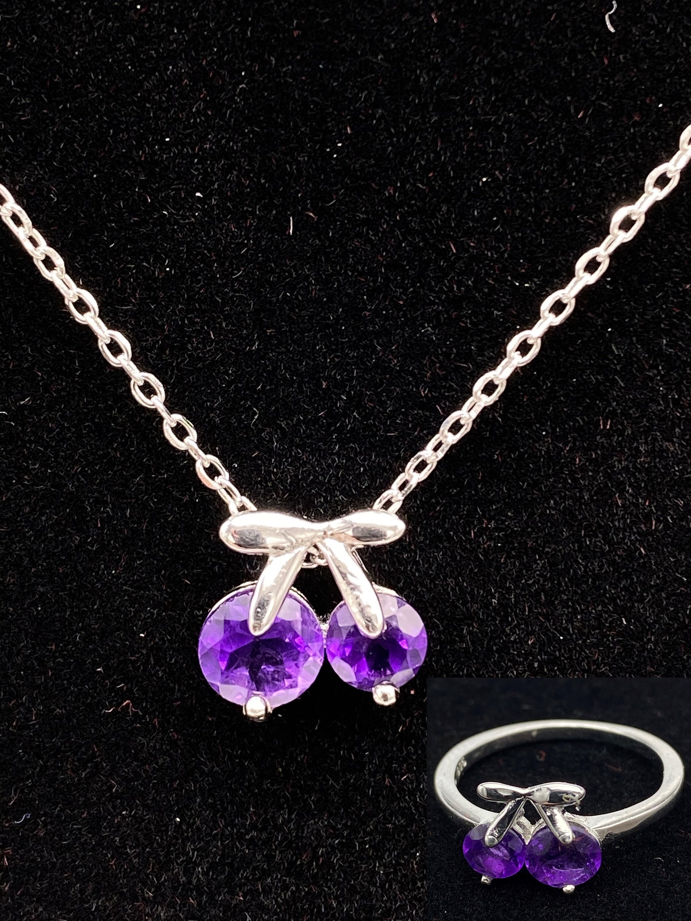 Cheery Cherry Shaped Natural Amethyst Necklace and Ring in 925 Sterling Silver